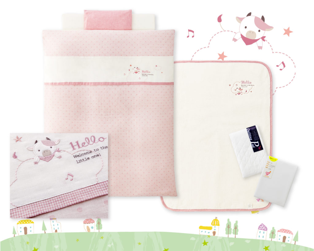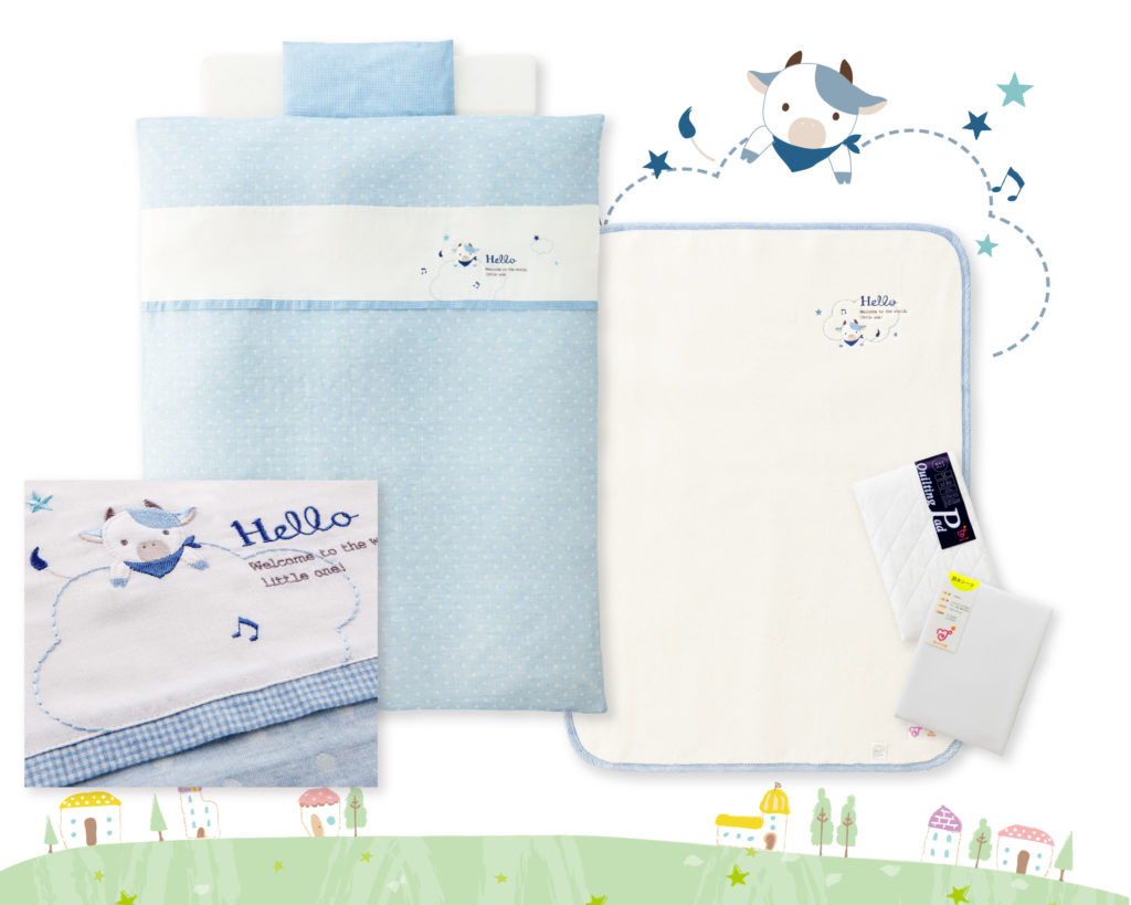 通常のお布団セット(掛布団・敷布団・まくら・シーツ)に、キルトパッド、防水シーツ、綿毛布がついた、期間限定のお得なパックです。