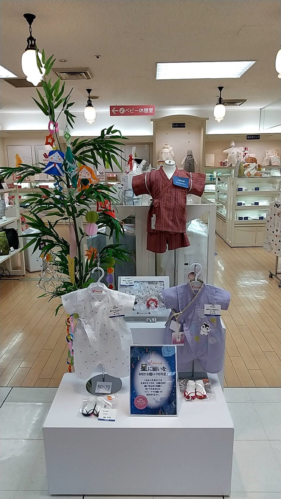 これから生まれてくる、未来の王子様、お姫様に、願いを込めて短冊を書いてみませんか?天満屋福山店・出産準備コーナーでは、店頭に笹の葉と七夕飾りをご用意して、皆様のご来店をお待ちしております。皆様に書いていただいた短冊は、8月の初めに、福岡県小郡市にある七夕神社に奉納させていただきます。