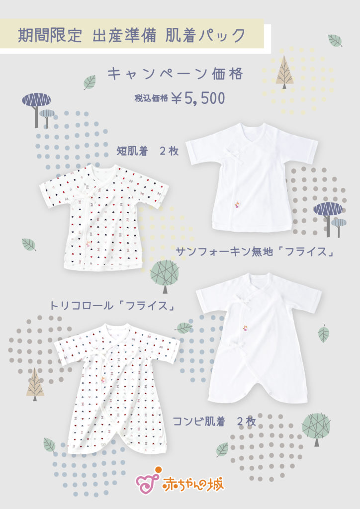 これから出産準備をはじめる皆様へ、お買い得な肌着パックをご用意しました。赤ちゃんの城・人気ナンバー1のトリコロール柄と白無地をセットにしました。産婦人科の院内でも使用されている赤ちゃんの城の肌着は、肌触りが良く耐久性に優れているので、多くの方にリピートいただいています!