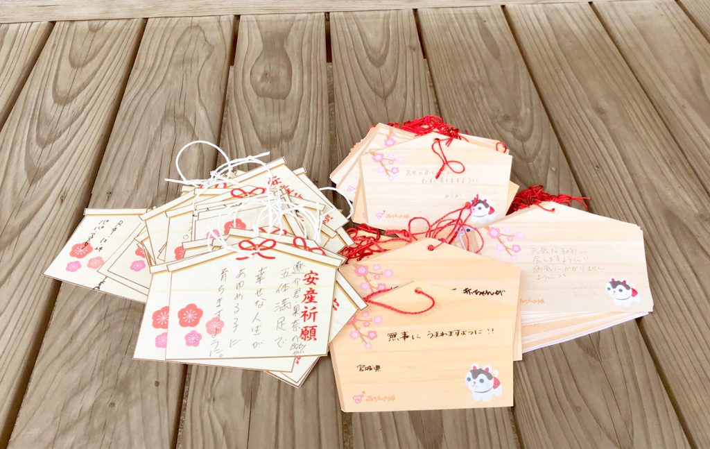 藤崎百貨店、福山天満屋、鶴屋百貨店にて行われた安産祈願イベントにて、出産を控えたお客様やご家族様から書いていただいた大切な絵馬を奉納するためです。