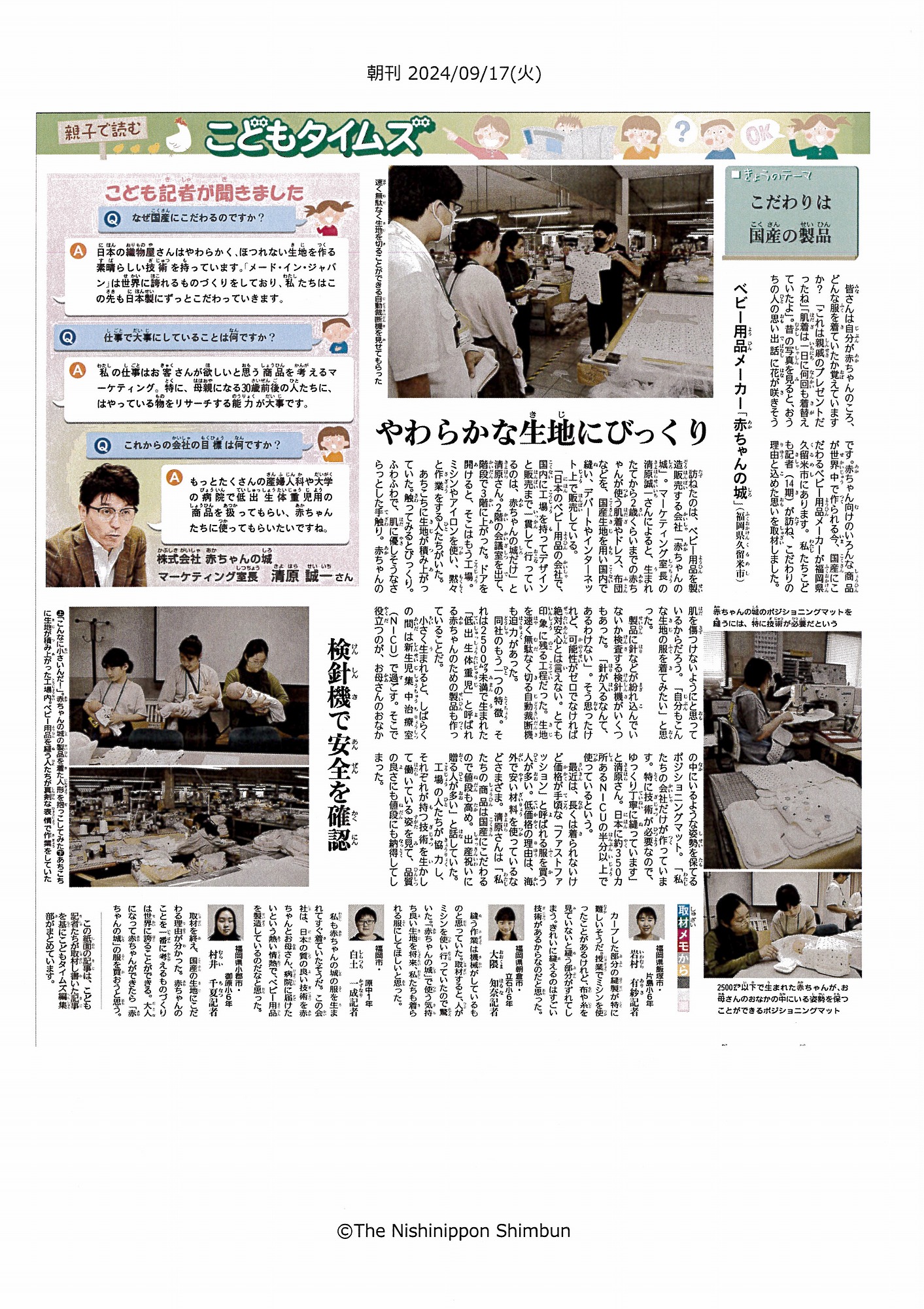 ニュース&トピックス 西日本新聞で紹介されました 2024.10.10 福岡県の小学生、中学生のこども記者のみなさんが、本社を訪れ、 生地のこだわりや、製品ができるまでを熱心に見学して、 とても分かりやすく記事にまとめてくださいました。 前の記事へ 一覧へ戻る 次の記事へ アーカイブ 2025年9月 2025年8月 2025年7月 2025年6月 2025年5月 2025年4月 2025年3月 2025年2月 2025年1月 2024年12月 2024年11月 2024年10月 2024年9月 2024年8月 2024年7月 2024年6月 2024年5月 2024年4月 2024年3月 2024年2月 2024年1月 2023年11月 2023年10月 2023年9月 2023年8月 2023年7月 2023年6月 2023年5月 2023年4月 2023年3月 2023年2月 2023年1月 2022年12月 2022年11月 2022年10月 2022年9月 2022年8月 2022年7月 2022年6月 2022年5月 2022年4月 2022年3月 2022年2月 2022年1月 2021年12月 2021年11月 2021年10月 2021年9月 2021年8月 2021年7月 2021年6月 2021年5月 2021年4月 2021年3月 2021年2月 2021年1月 2020年12月 2020年11月 2020年10月 2020年9月 2020年8月 2020年7月 2020年6月 2020年4月 2020年3月 2020年2月 2020年1月 2019年12月 2019年11月 2019年10月 2019年9月