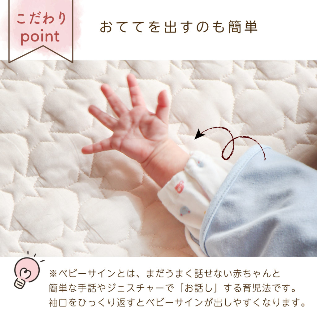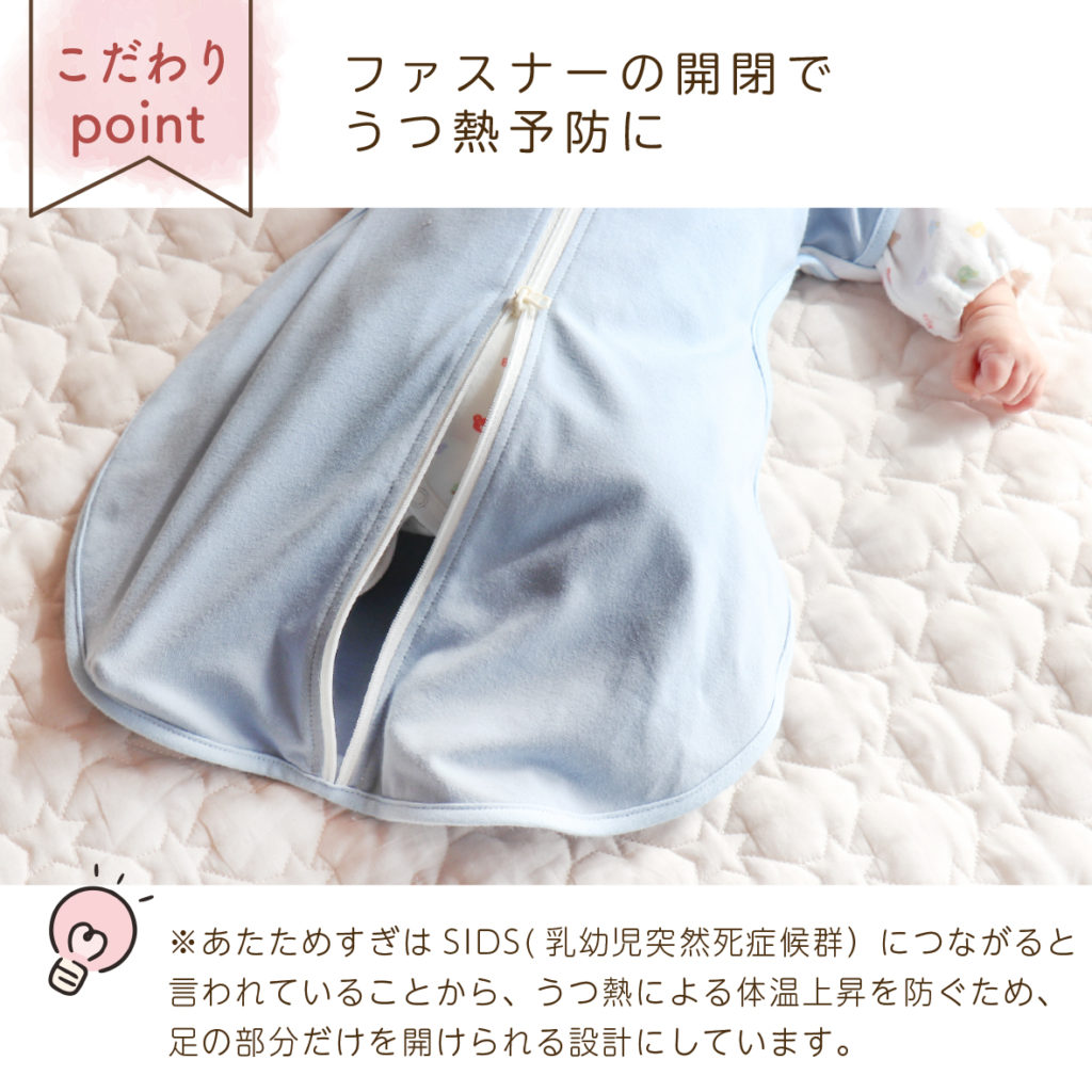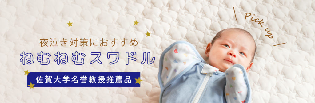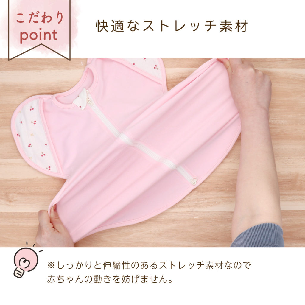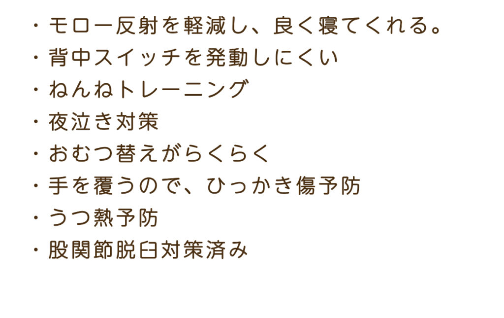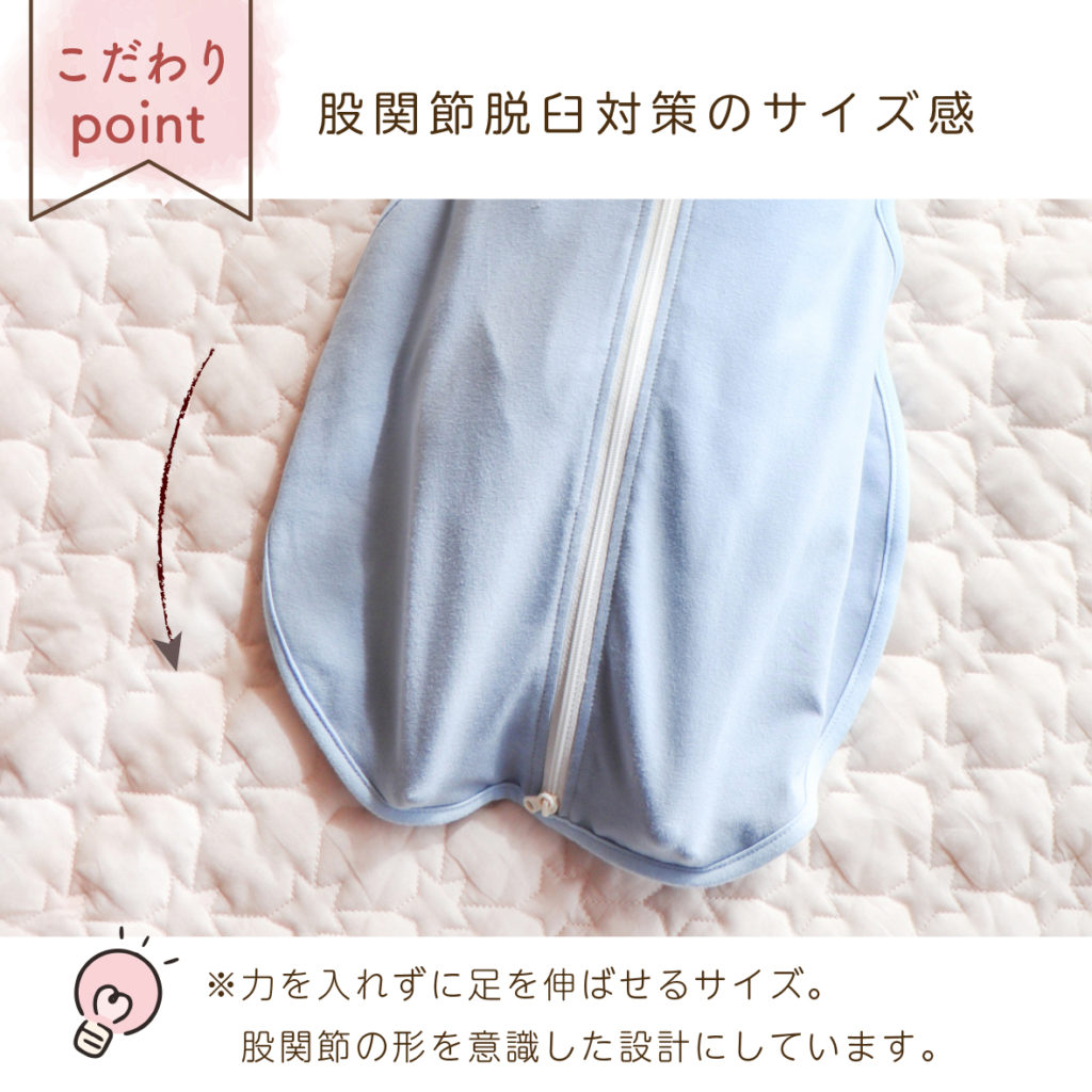特集 夜泣き対策におすすめ 2024.12.04 股関節に負担をかけない設計の【ねむねむスワドル】。 佐賀大学 名誉教授 助産師 佐藤珠美先生推薦の アイテムです。 赤ちゃんの手を簡単に出すことができる構造で、 寝つきに必要な放熱を促したり、ベビーサイン (身振り・手振り)を楽しんだりすることができます。 また生後1か月以降は足をピーンと伸ばすようになる ため、股関節に負担をかけないよう 下半身が長くなって います。赤ちゃんの睡眠や発達だけではなく、 親と子の相互作用も考慮した商品です。