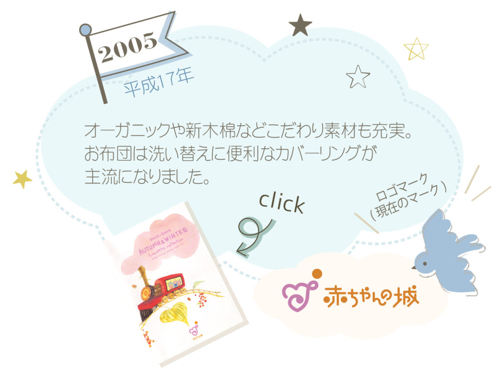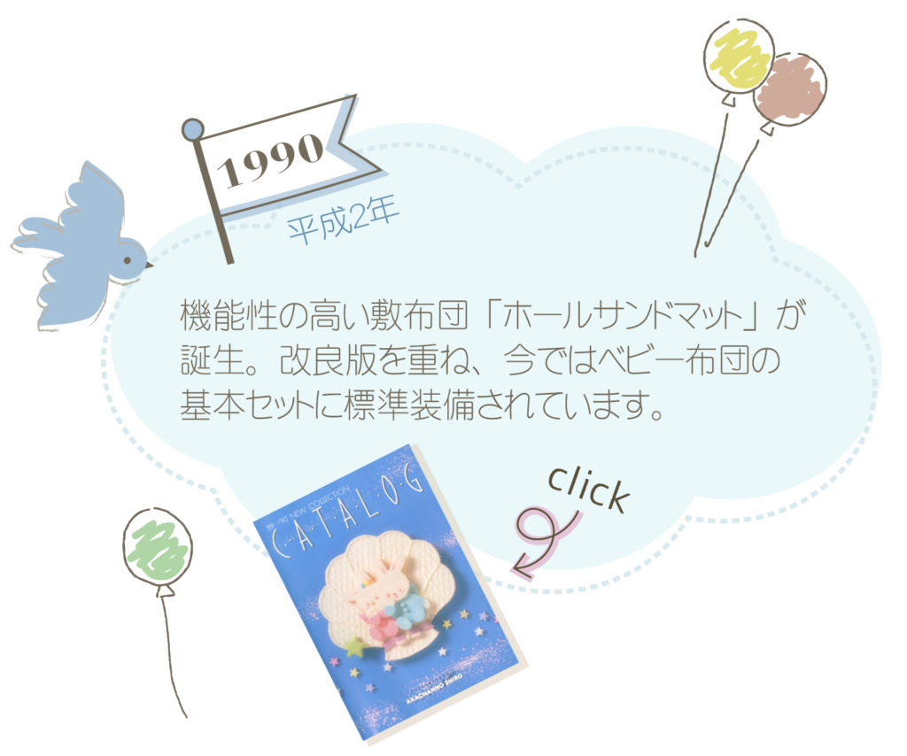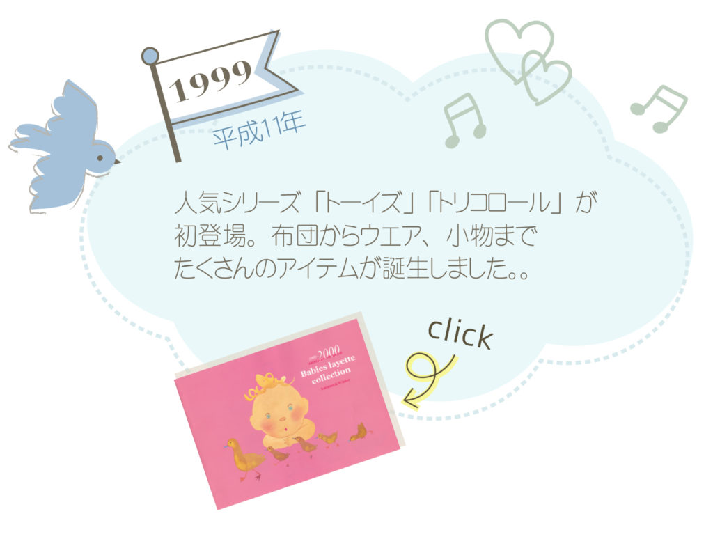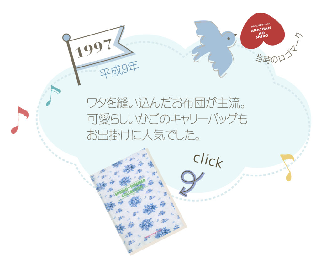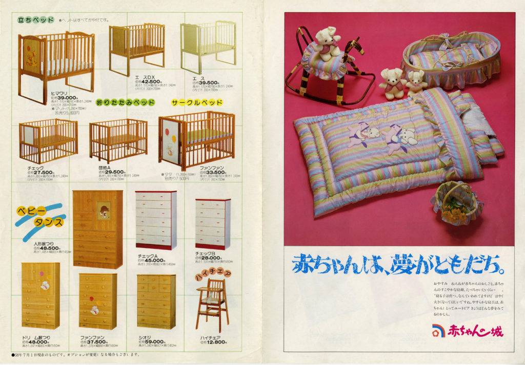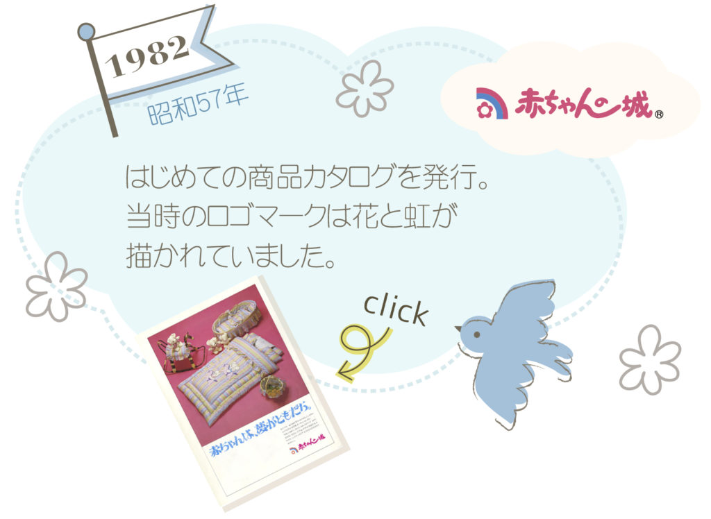 1982年の最初のカタログです。始まりはベビー家具。お布団セットやスモック、整理かごやキャリーバッグなど、時代と共にたくさんのアイテムを作ってきました。