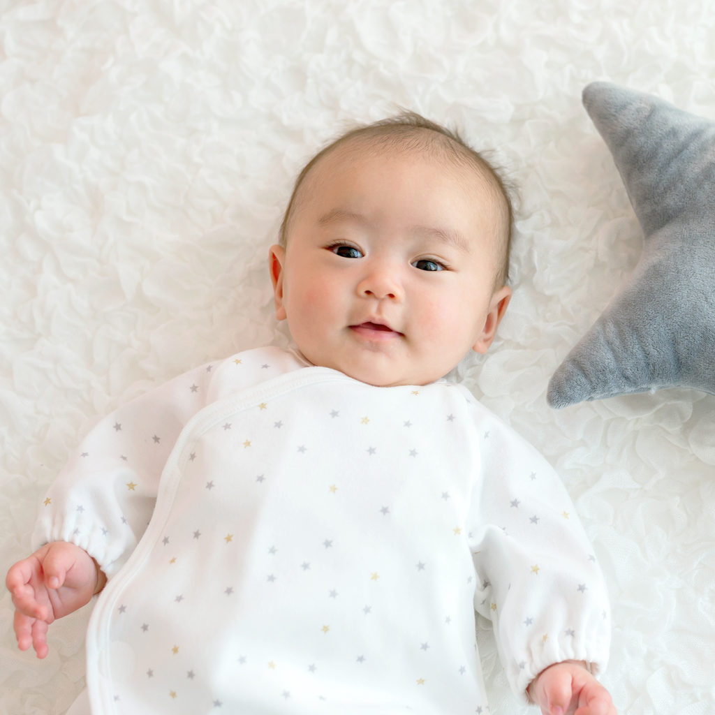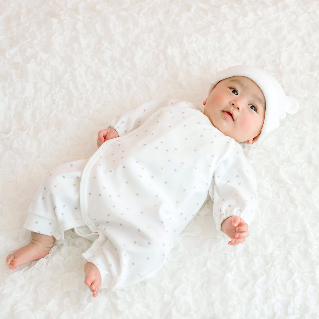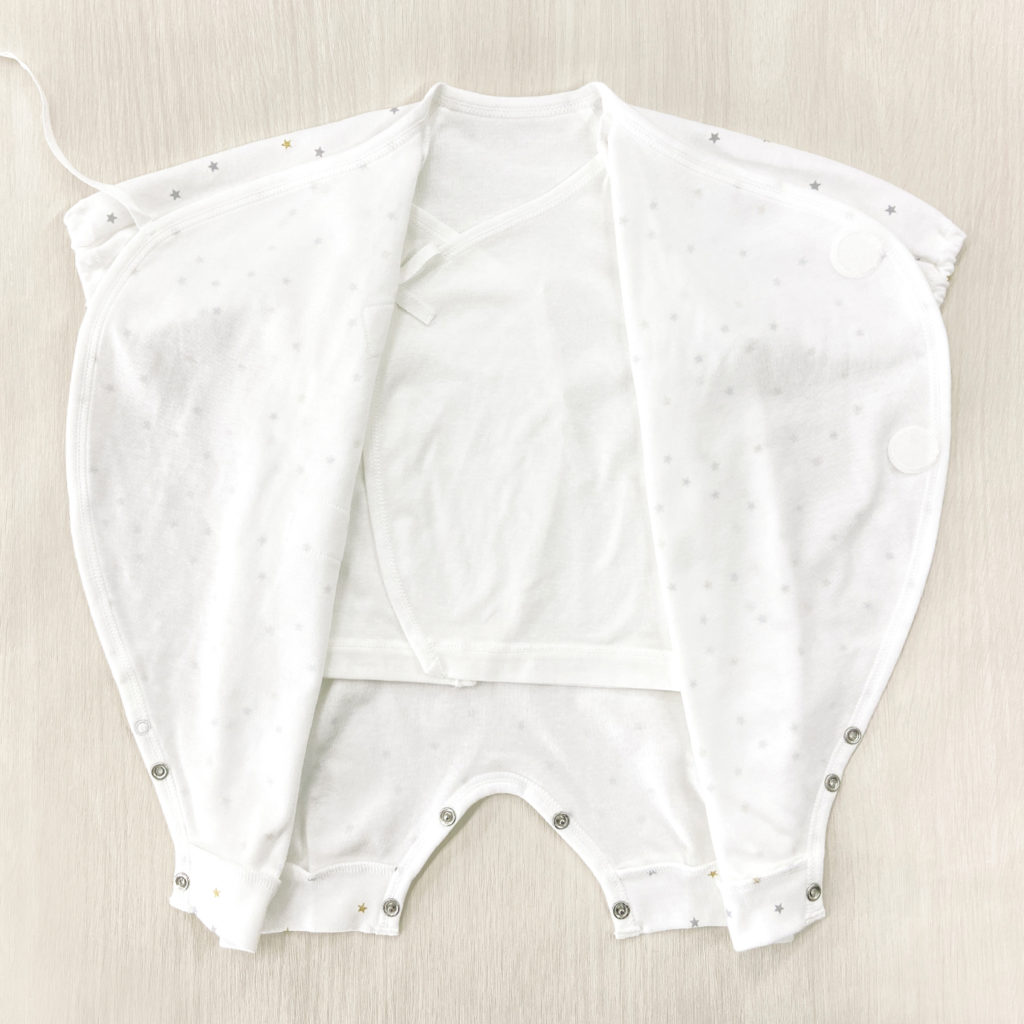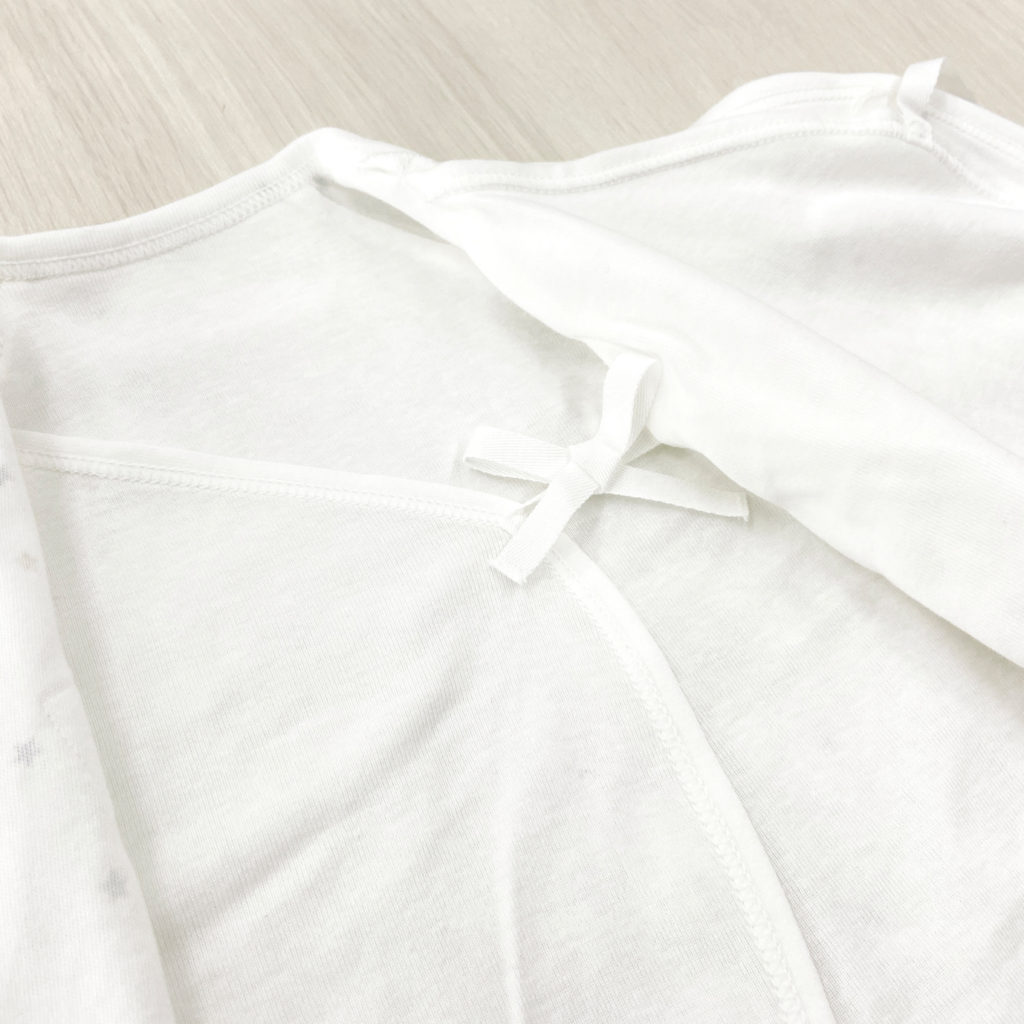 産婦人科の助産師・看護師さんと共同開発したウエア。肌着がくっついて、さらに便利になりました!院内で毎日何十枚も着せ替える助産師さん・看護師さんにとって、脱ぎ着が簡単でしかもかわいいウエアは、理想的なものと推奨していただきました。