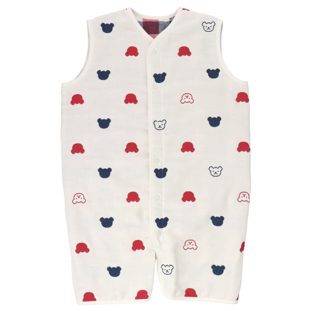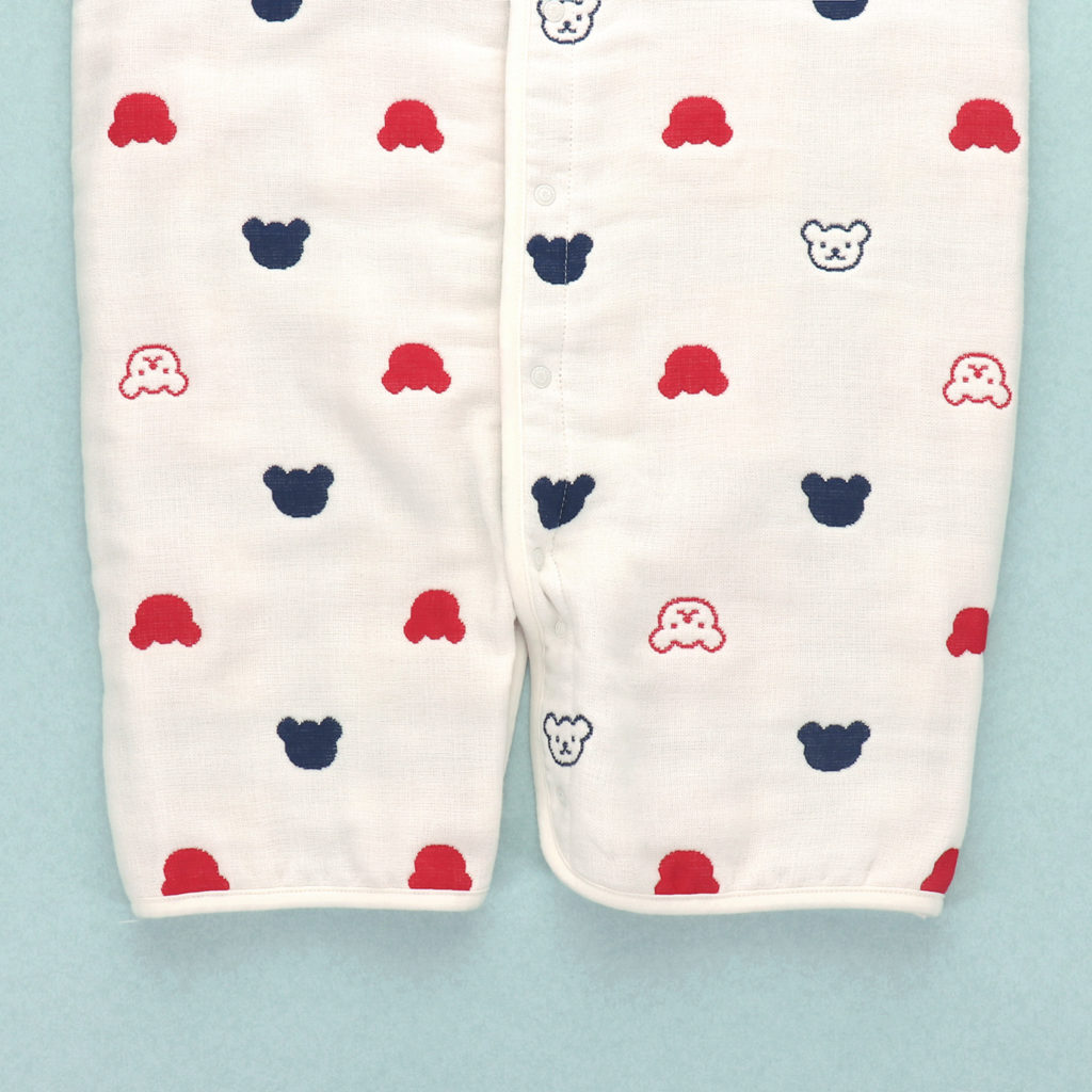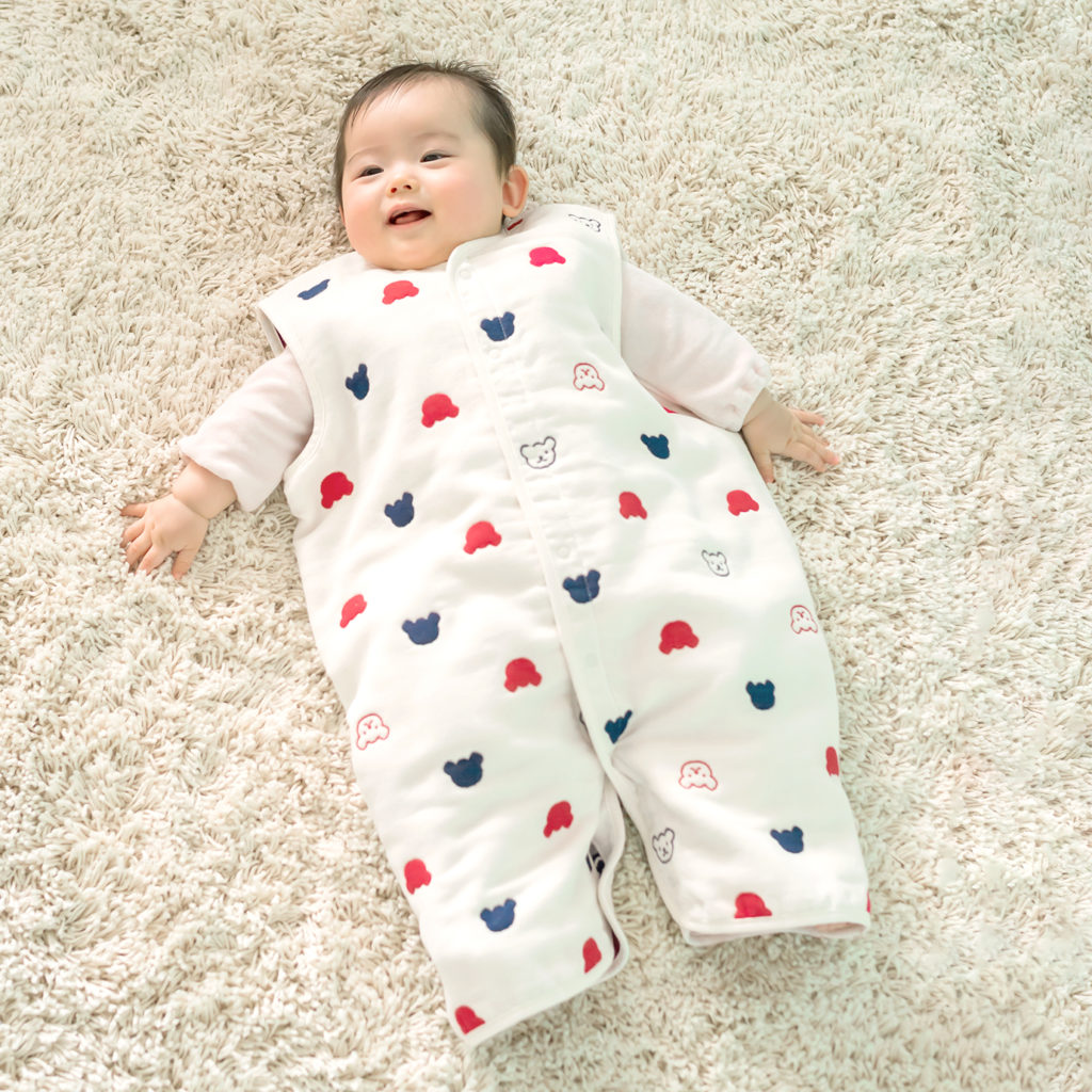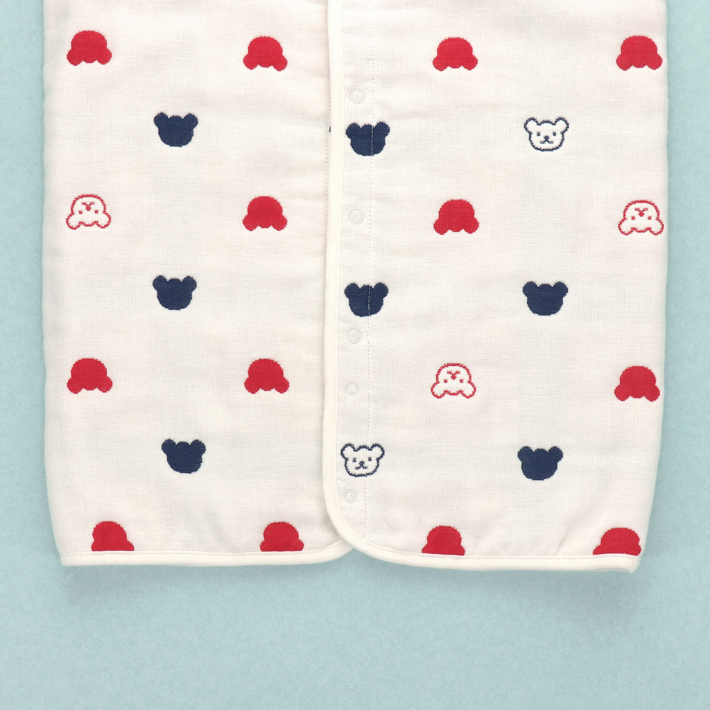 トリコロールカラーのくまが可愛い、男の子にも女の子にも人気のデザインです。 六重に重ねたガーゼが空気をたくさん含み、冬はふんわり暖かく、夏のクーラー対策にもおすすめです。 通気性・速乾性が高く、洗濯を重ねるたびにやわらかく優しい肌触りで一年中お使いいただけます。 おなかが出ない長めの丈で、寝冷え対策に最適。 股下のボタンを留めかえることで2通りの使い方が出来て便利です。