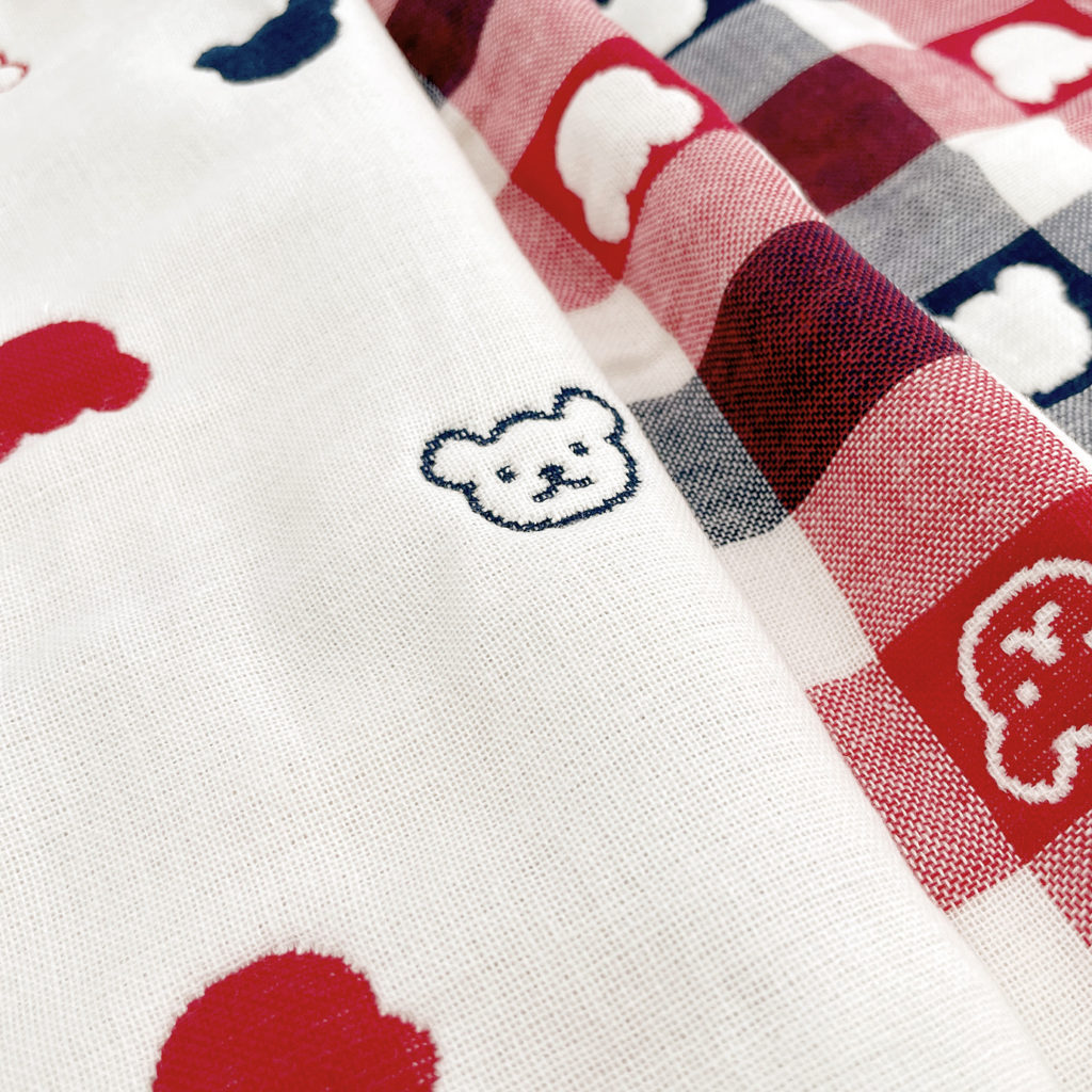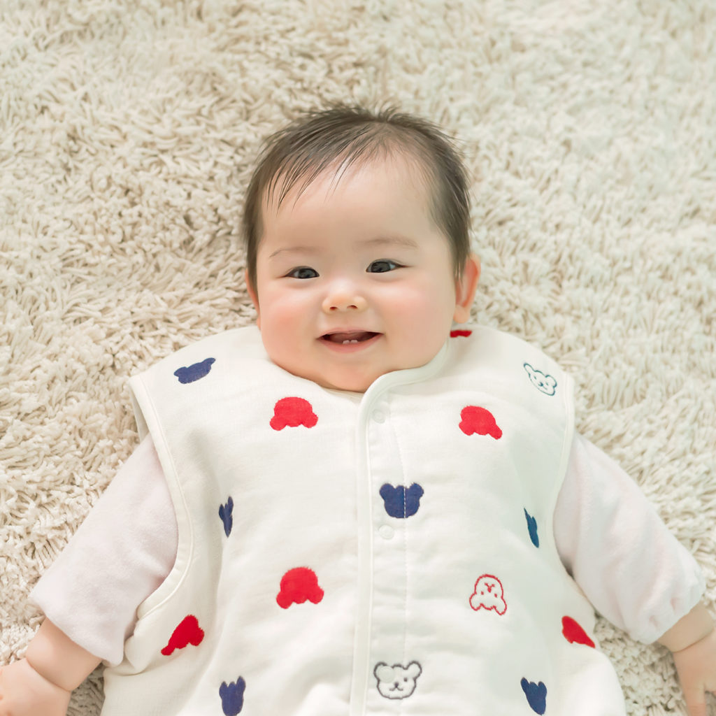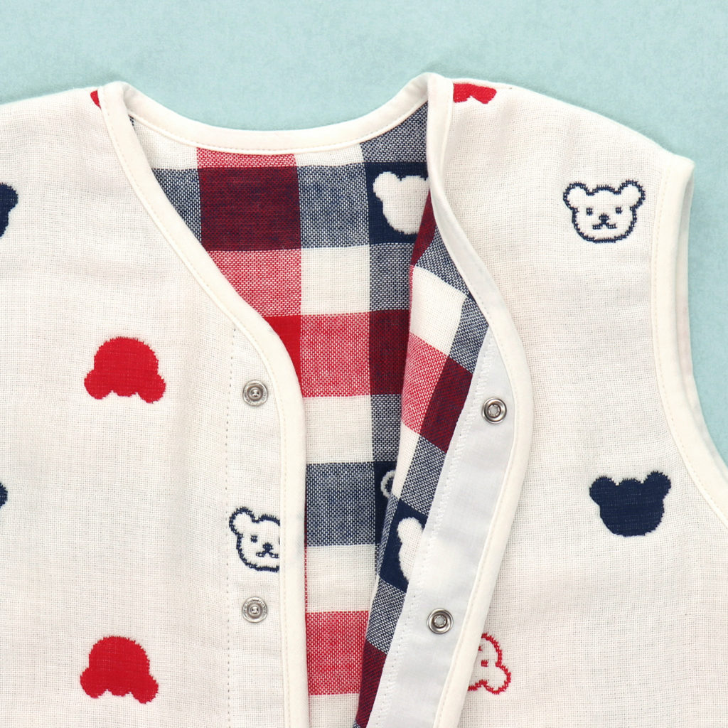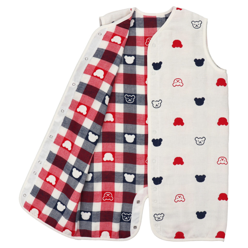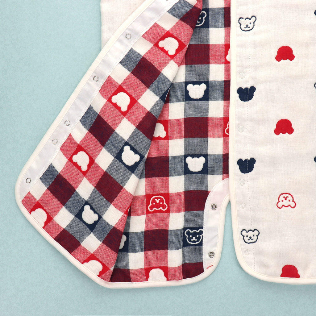 トリコロールカラーのくまが可愛い、男の子にも女の子にも人気のデザインです。 六重に重ねたガーゼが空気をたくさん含み、冬はふんわり暖かく、夏のクーラー対策にもおすすめです。 通気性・速乾性が高く、洗濯を重ねるたびにやわらかく優しい肌触りで一年中お使いいただけます。 おなかが出ない長めの丈で、寝冷え対策に最適。 股下のボタンを留めかえることで2通りの使い方が出来て便利です。