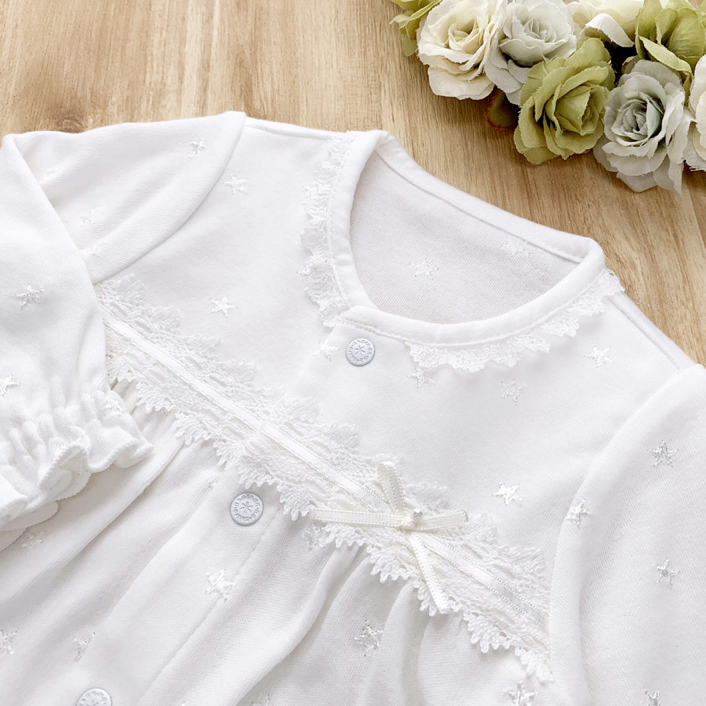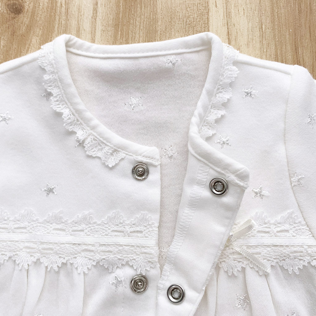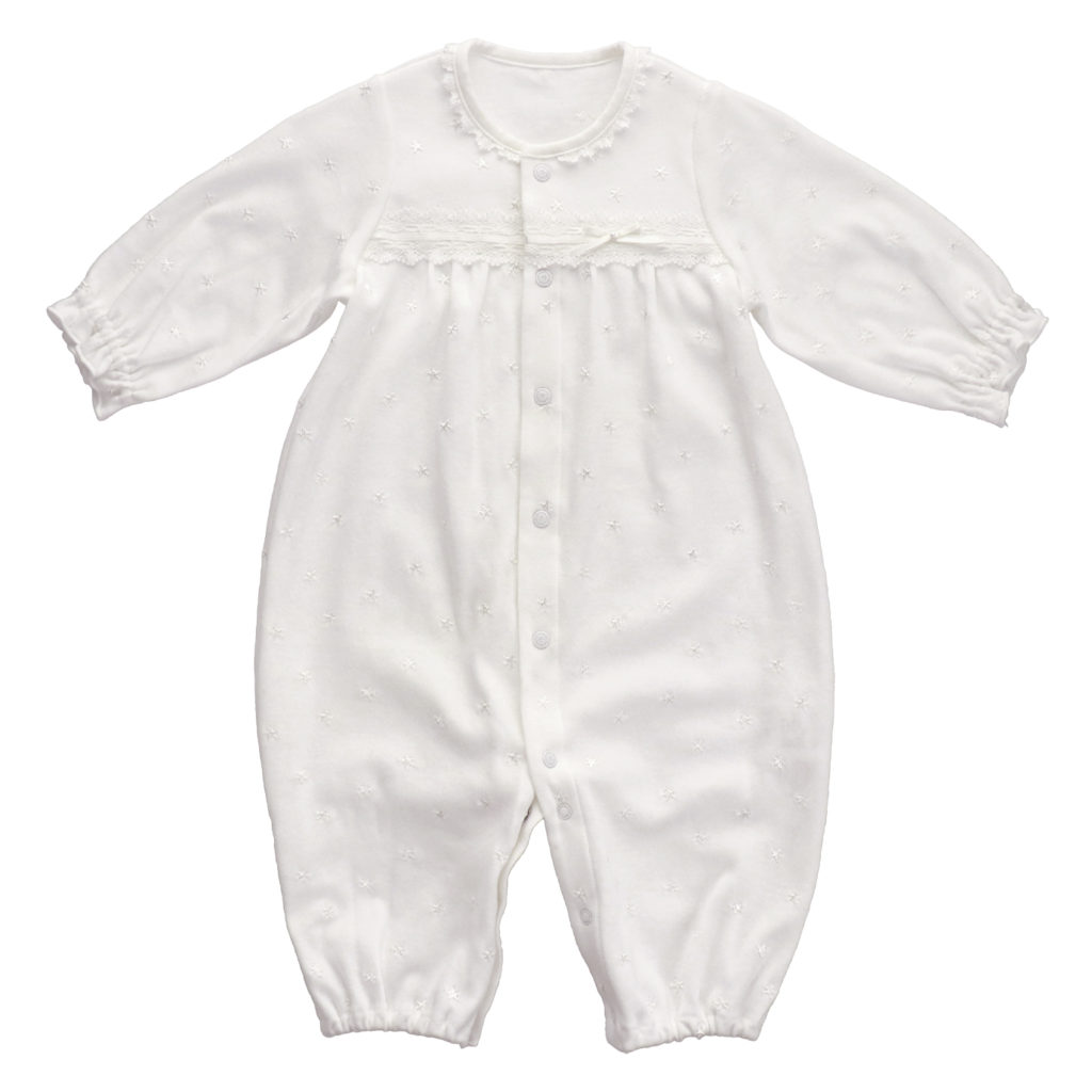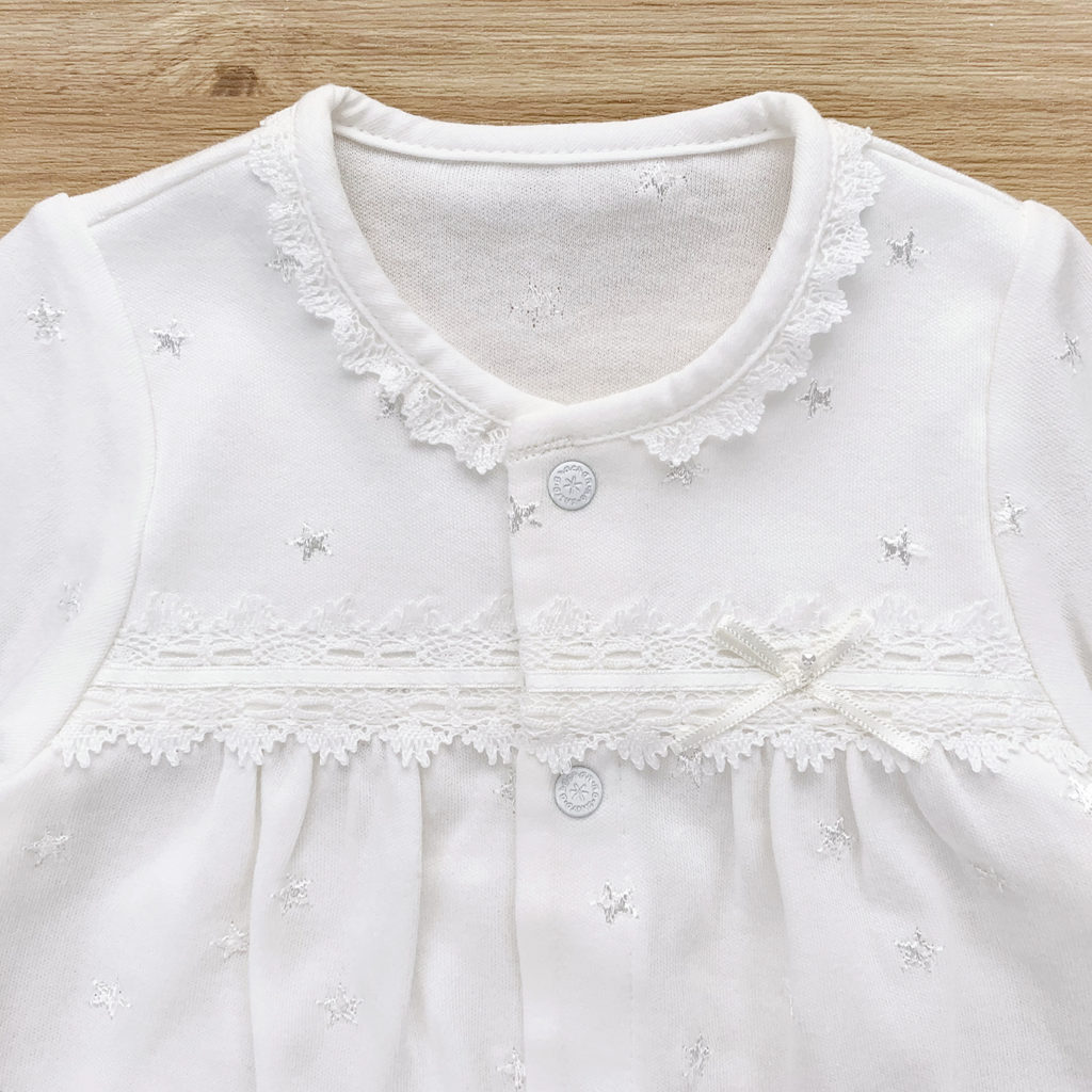 繊細な刺繍が全体に入った生地に美しいレースが付いた豪華なドレスです。肌触りの良いスムース素材で、秋から春先まで活躍します。 生まれてすぐは足を包むドレスタイプ。足をばたばた出来るようになったらボタンを留め替えて、カバーオールタイプにもなるツーウェイ仕様です。胸元の美しいデザインは写真映えも良く、イベント事やお披露目にも最適です。出産準備はもちろん、ギフトにもおすすめです。