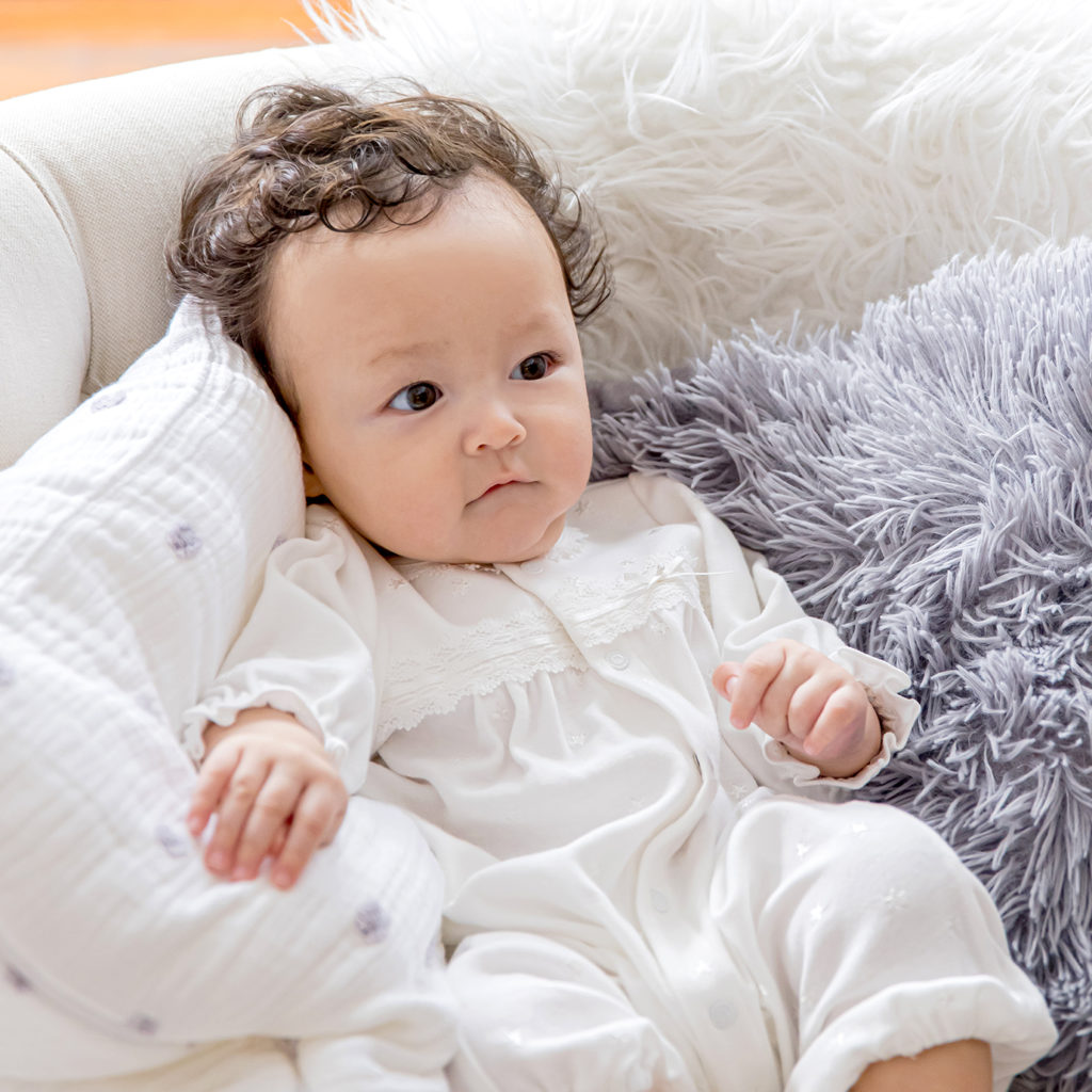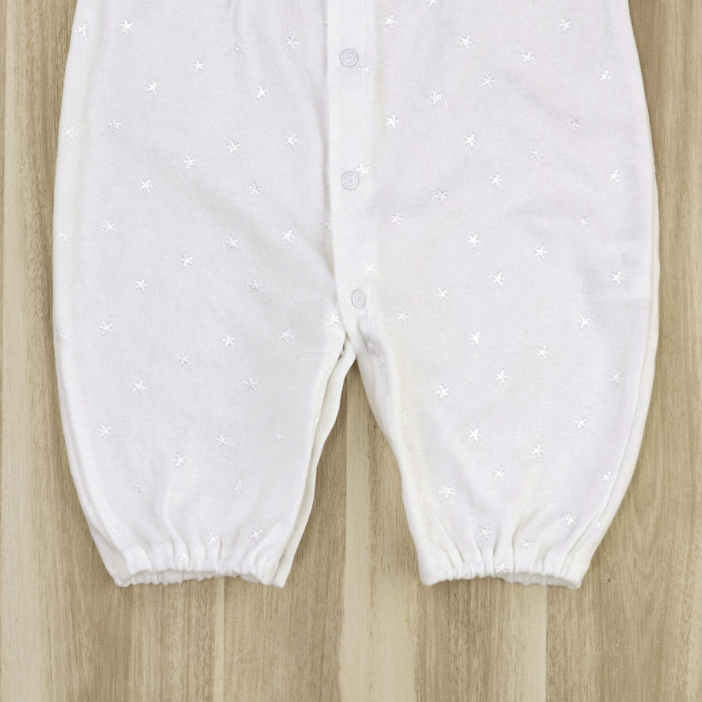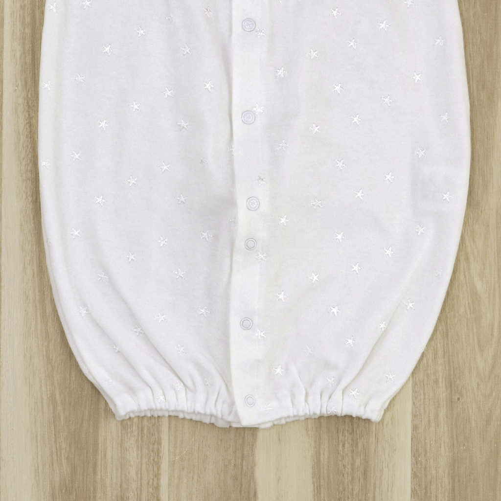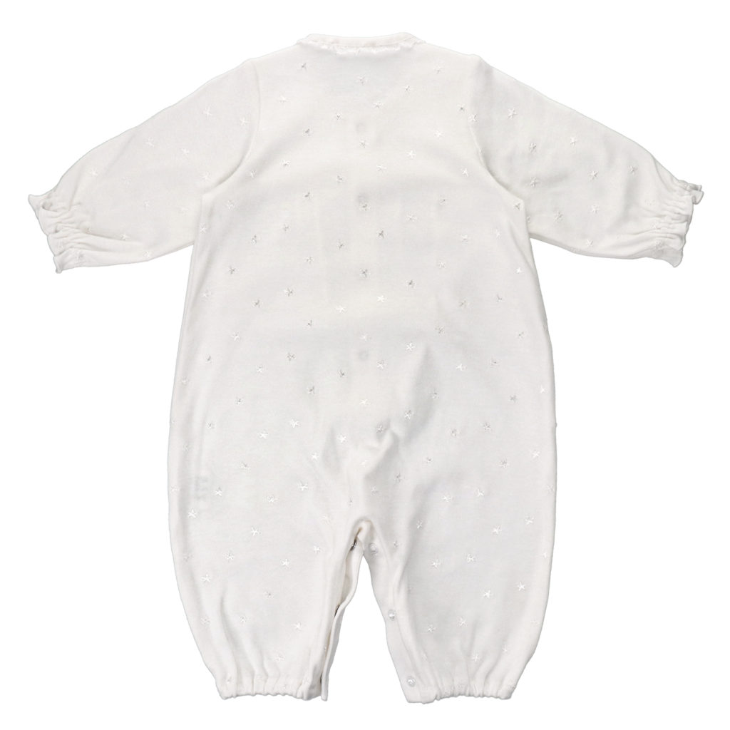 繊細な刺繍が全体に入った生地に美しいレースが付いた豪華なドレスです。肌触りの良いスムース素材で、秋から春先まで活躍します。 生まれてすぐは足を包むドレスタイプ。足をばたばた出来るようになったらボタンを留め替えて、カバーオールタイプにもなるツーウェイ仕様です。胸元の美しいデザインは写真映えも良く、イベント事やお披露目にも最適です。出産準備はもちろん、ギフトにもおすすめです。