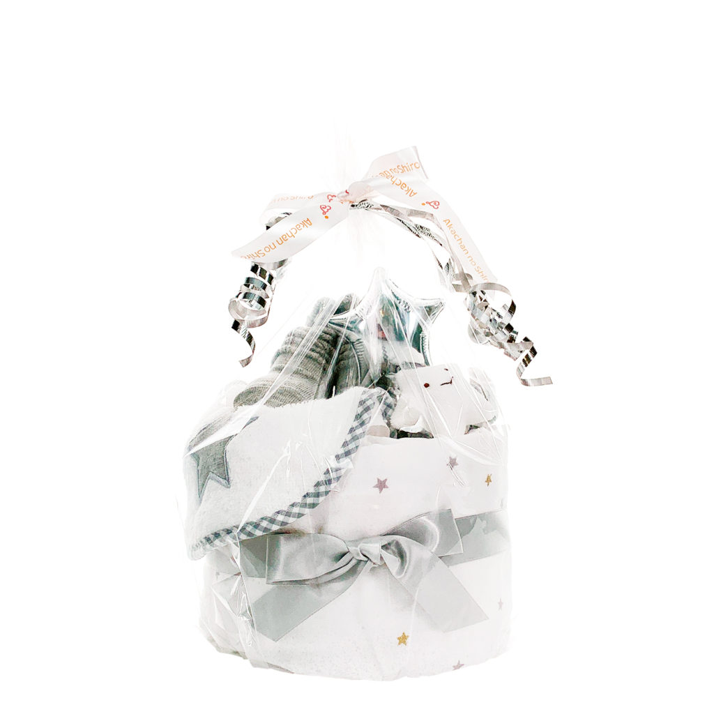 星モチーフのアイテムでそろえたギフトセットはシックなグレーがおしゃれ。 出産のお祝いにおすすめの華やかなおむつケーキです。 男女問わないデザインと充実のセット内容、安心・安全の日本製にこだわりました。