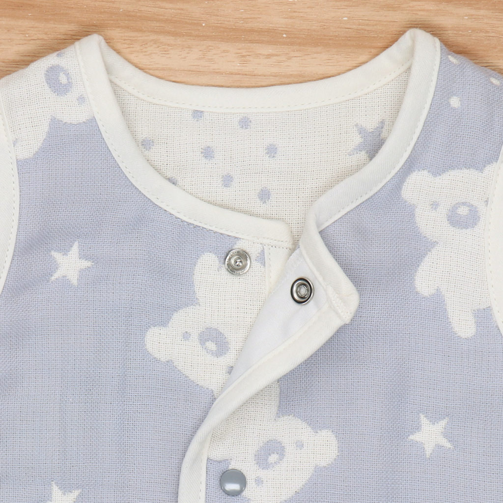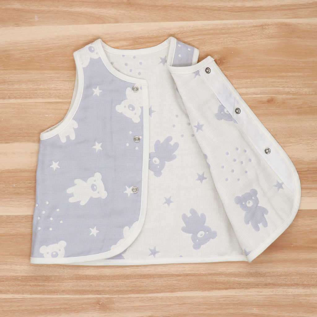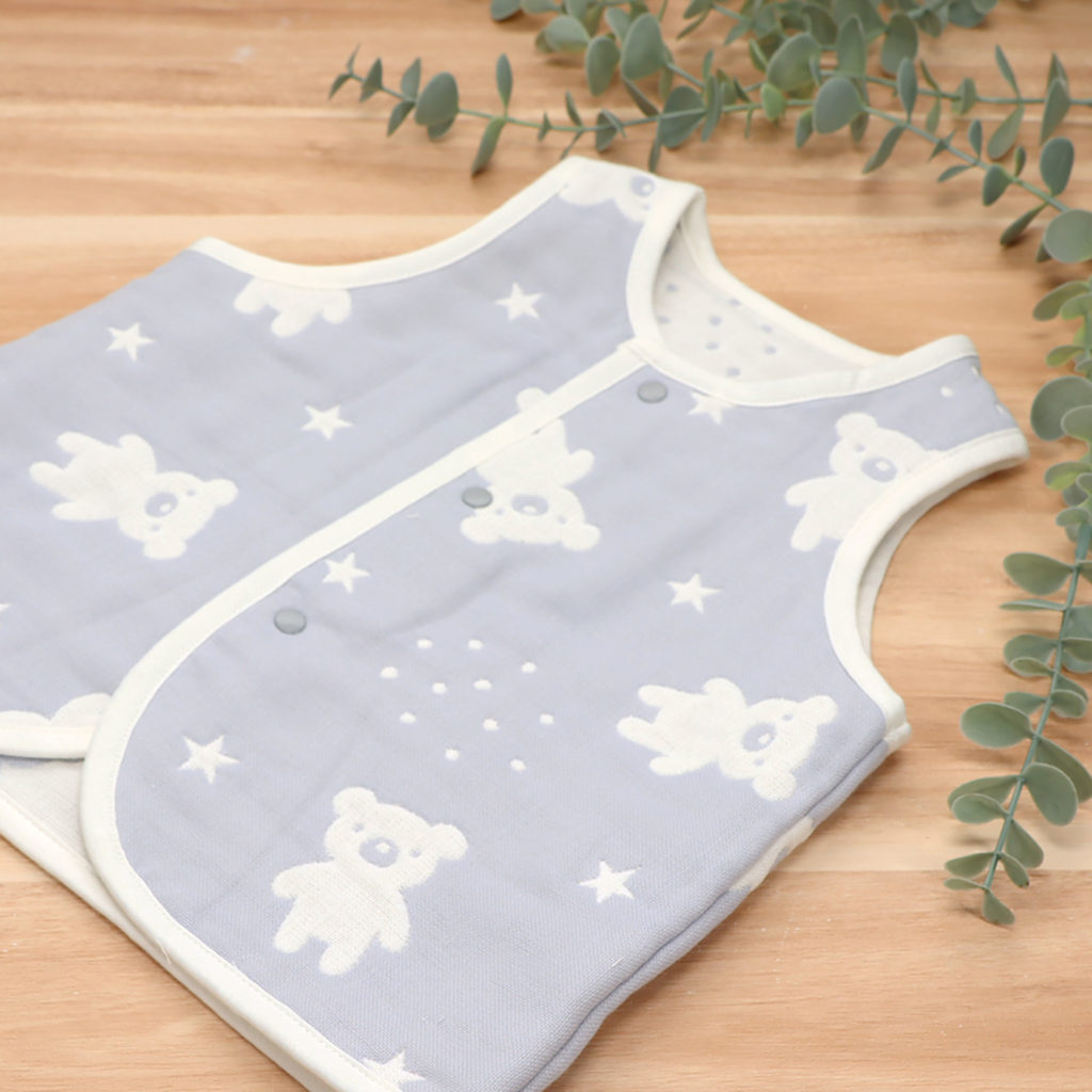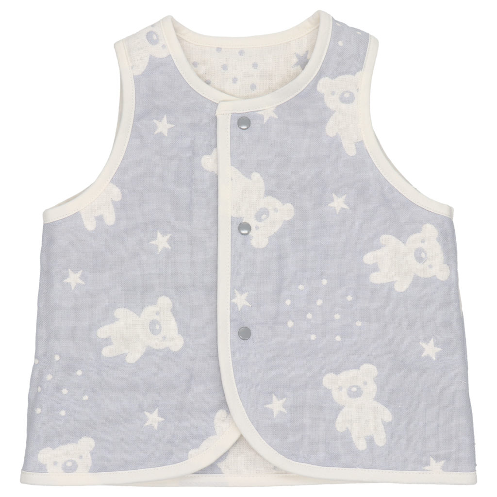 落ち着いた色合いのグレーにくまの織り柄がかわいいデザイン。 手軽に羽織れるベストは、お外でも室内でも、赤ちゃんの体温調節にとても便利なアイテムです。