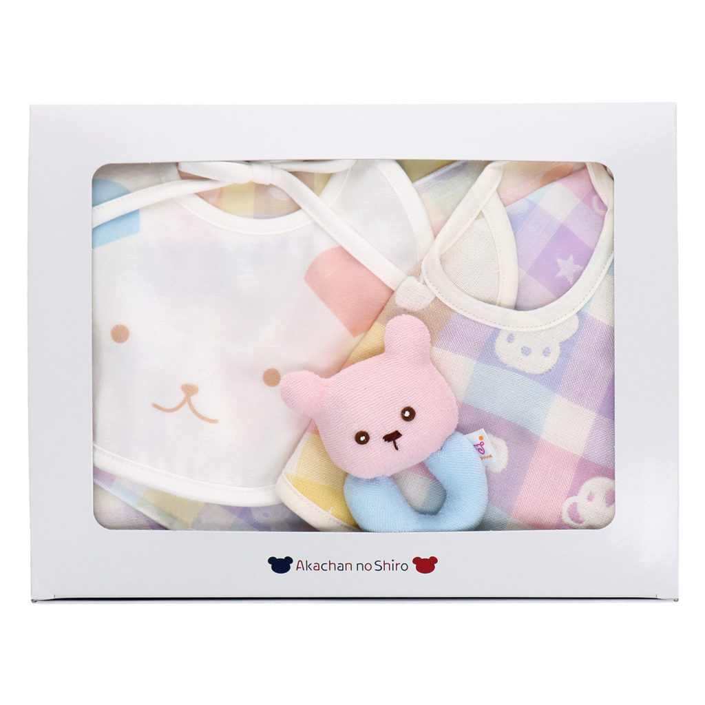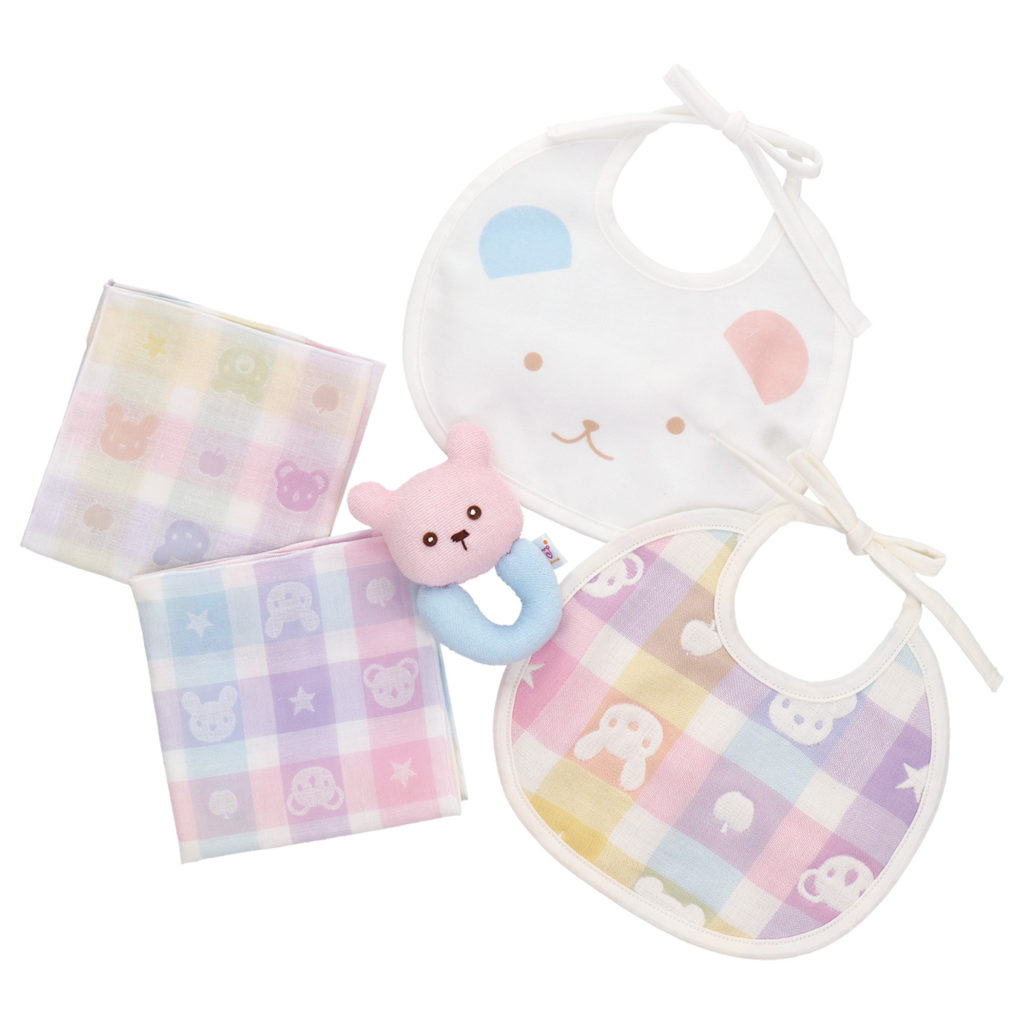 パステルチェックと動物柄が可愛い、男の子にも女の子にも人気のデザインです。 実用的なハンカチやスタイに、かわいいガラガラが入ったセット。 出産のお祝いにぴったりのギフトです。