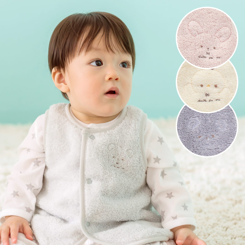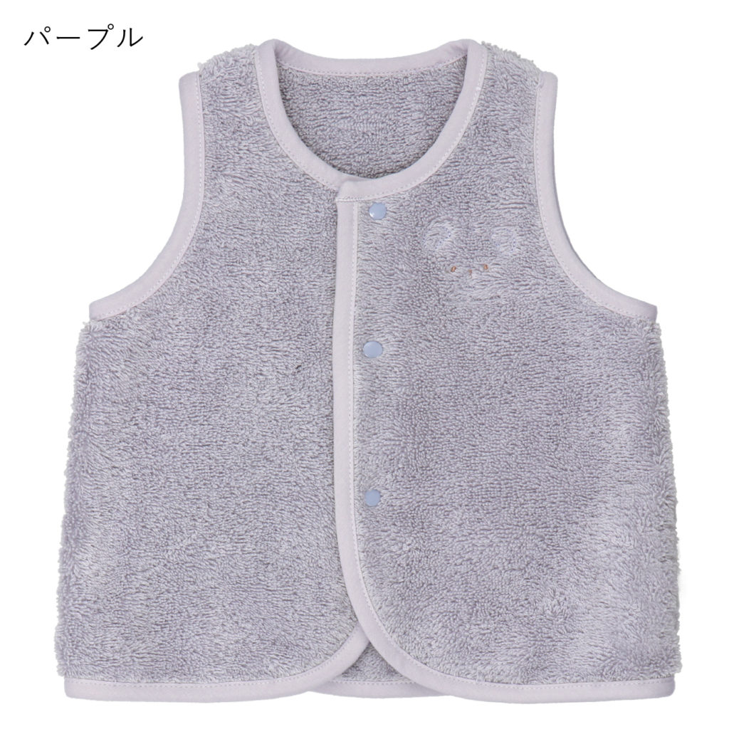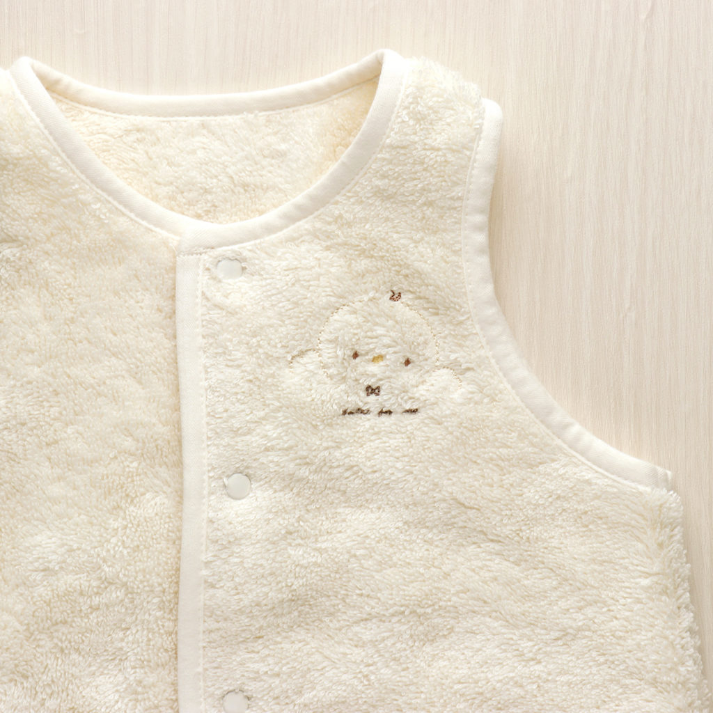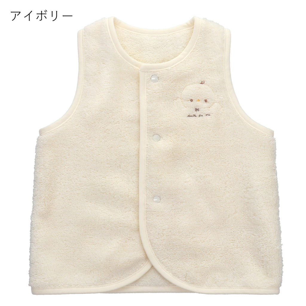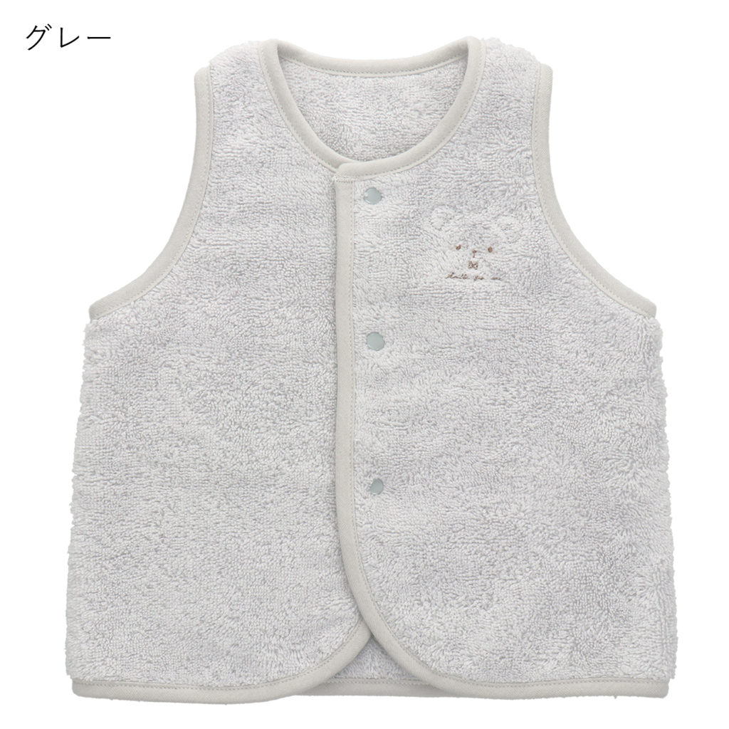 お洋服ともコーディネートしやすいシンプルなデザインで胸元の刺しゅうがアクセントになったベストです。 たっぷり空気を含んだやわらかなエアーかおるタオル素材。おうちの中でもおそとでも手軽に羽織れ、赤ちゃんの体温調節に便利なアイテムです。