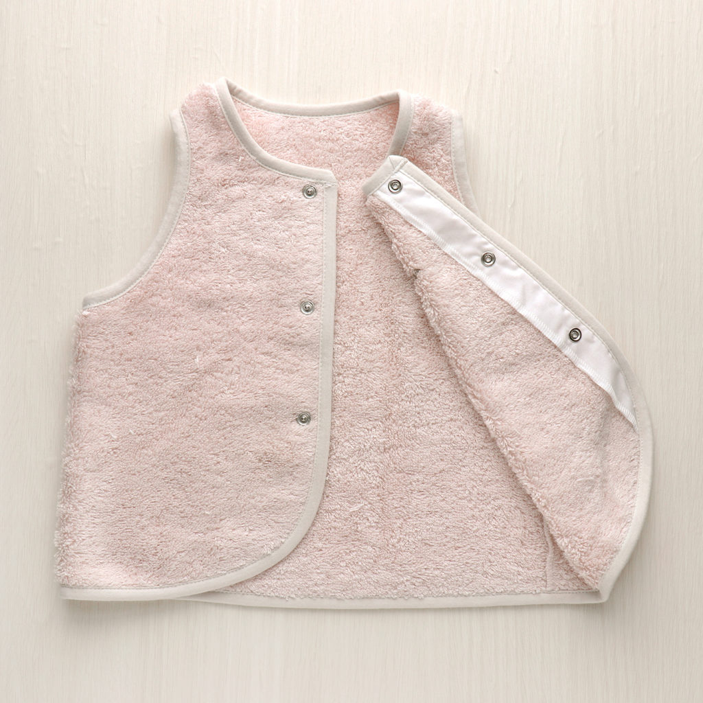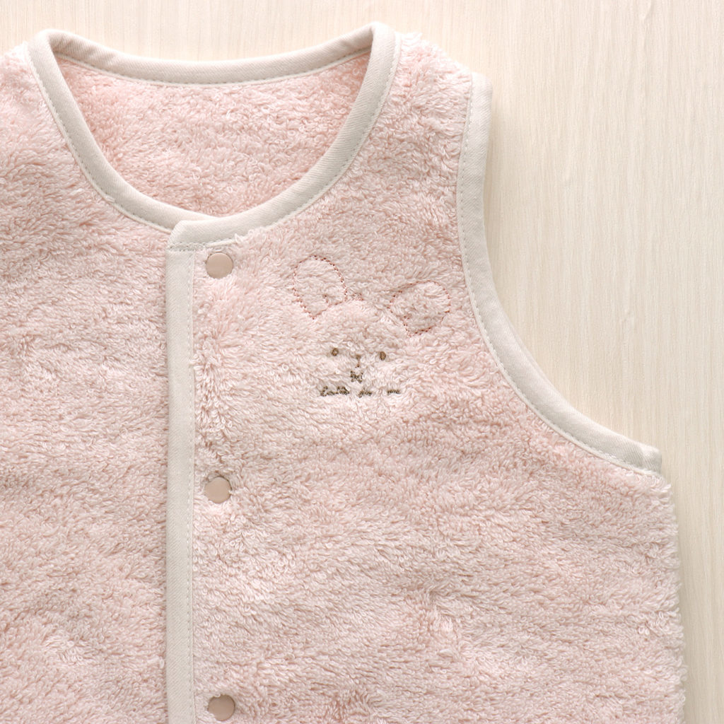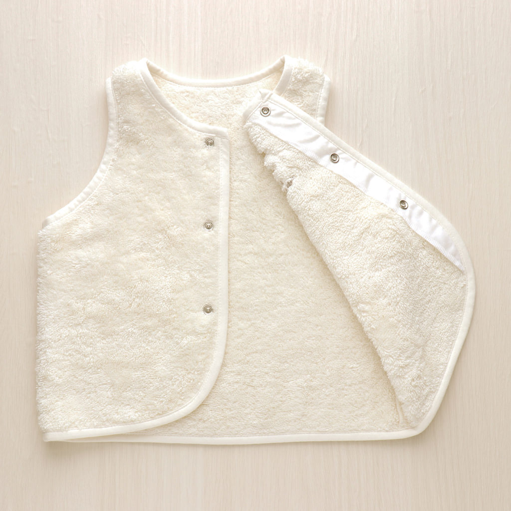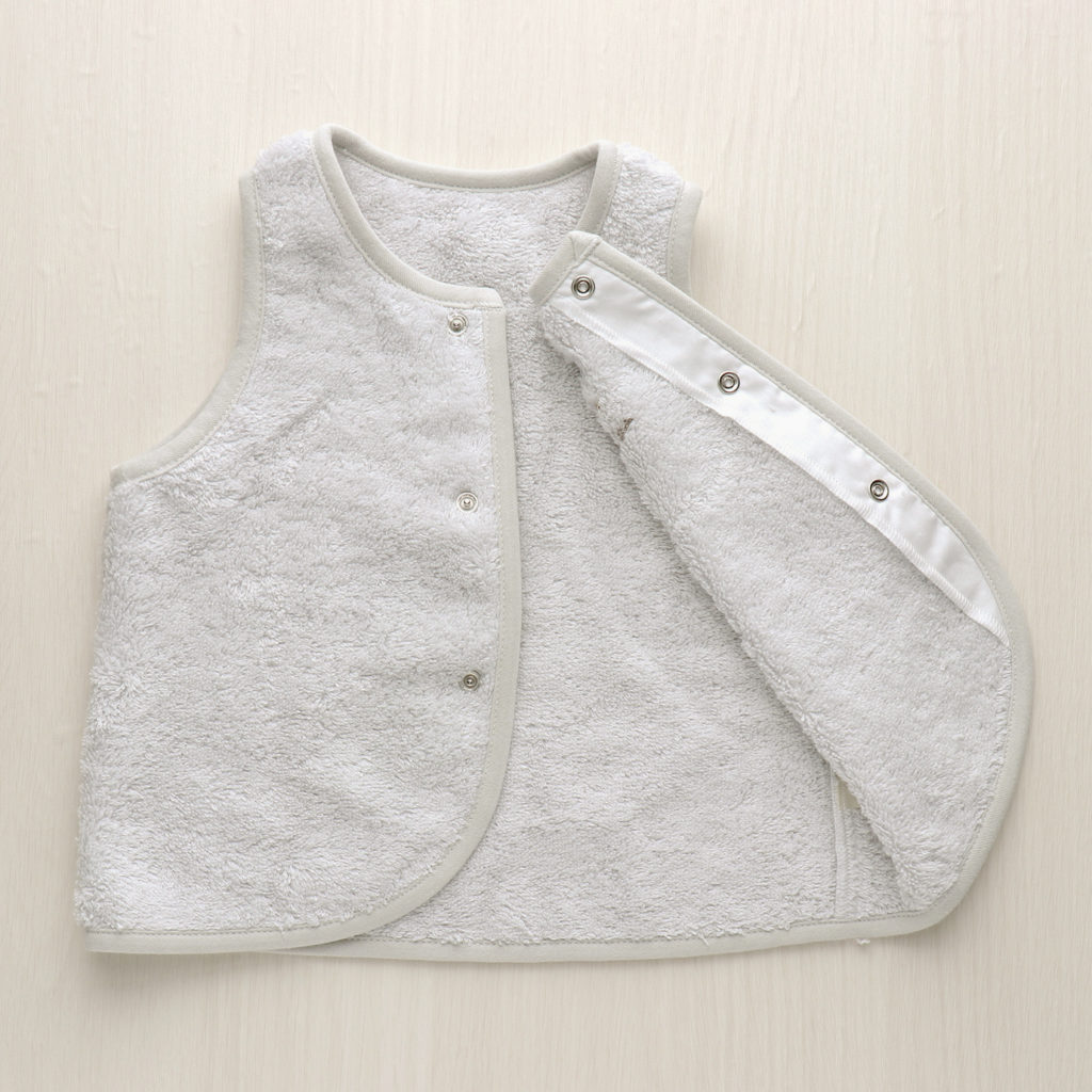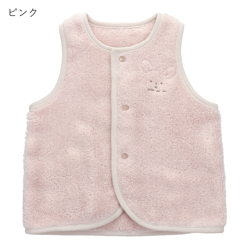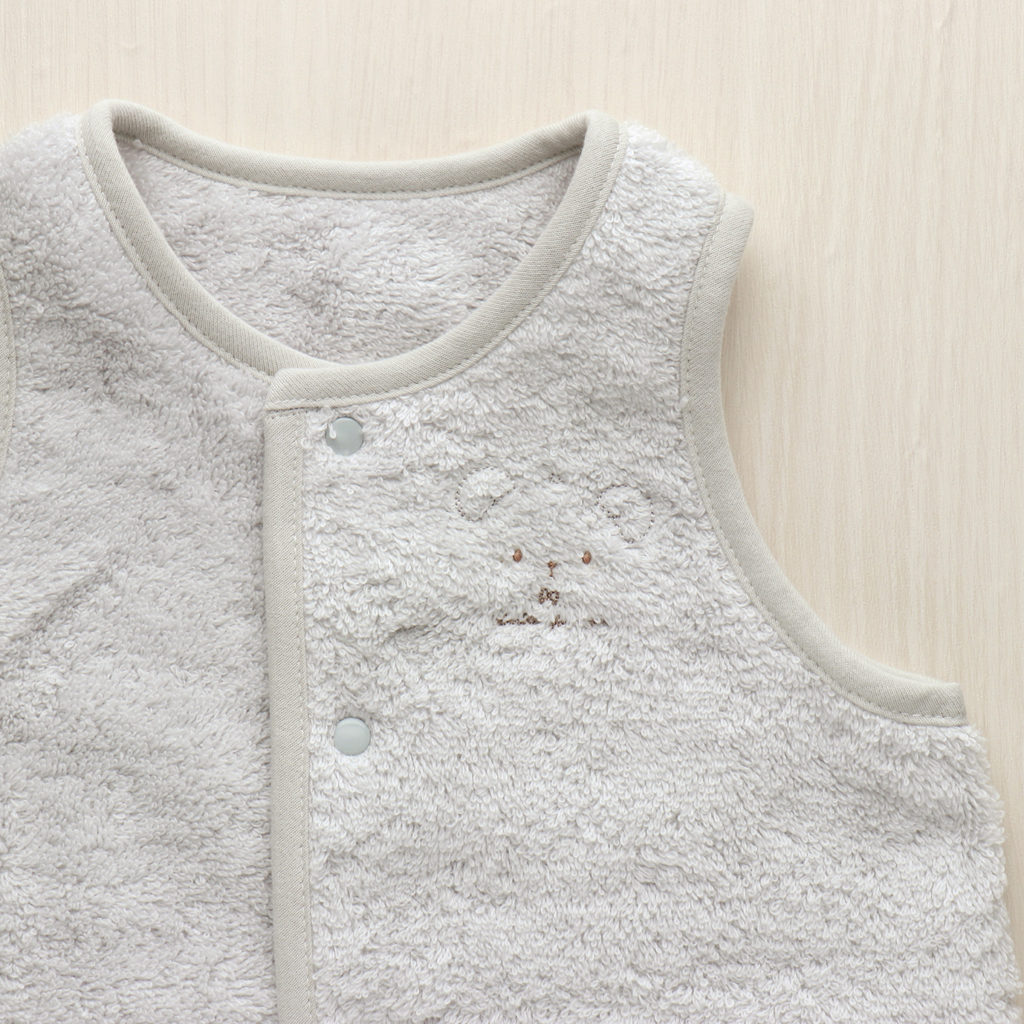 お洋服ともコーディネートしやすいシンプルなデザインで胸元の刺しゅうがアクセントになったベストです。 たっぷり空気を含んだやわらかなエアーかおるタオル素材。おうちの中でもおそとでも手軽に羽織れ、赤ちゃんの体温調節に便利なアイテムです。