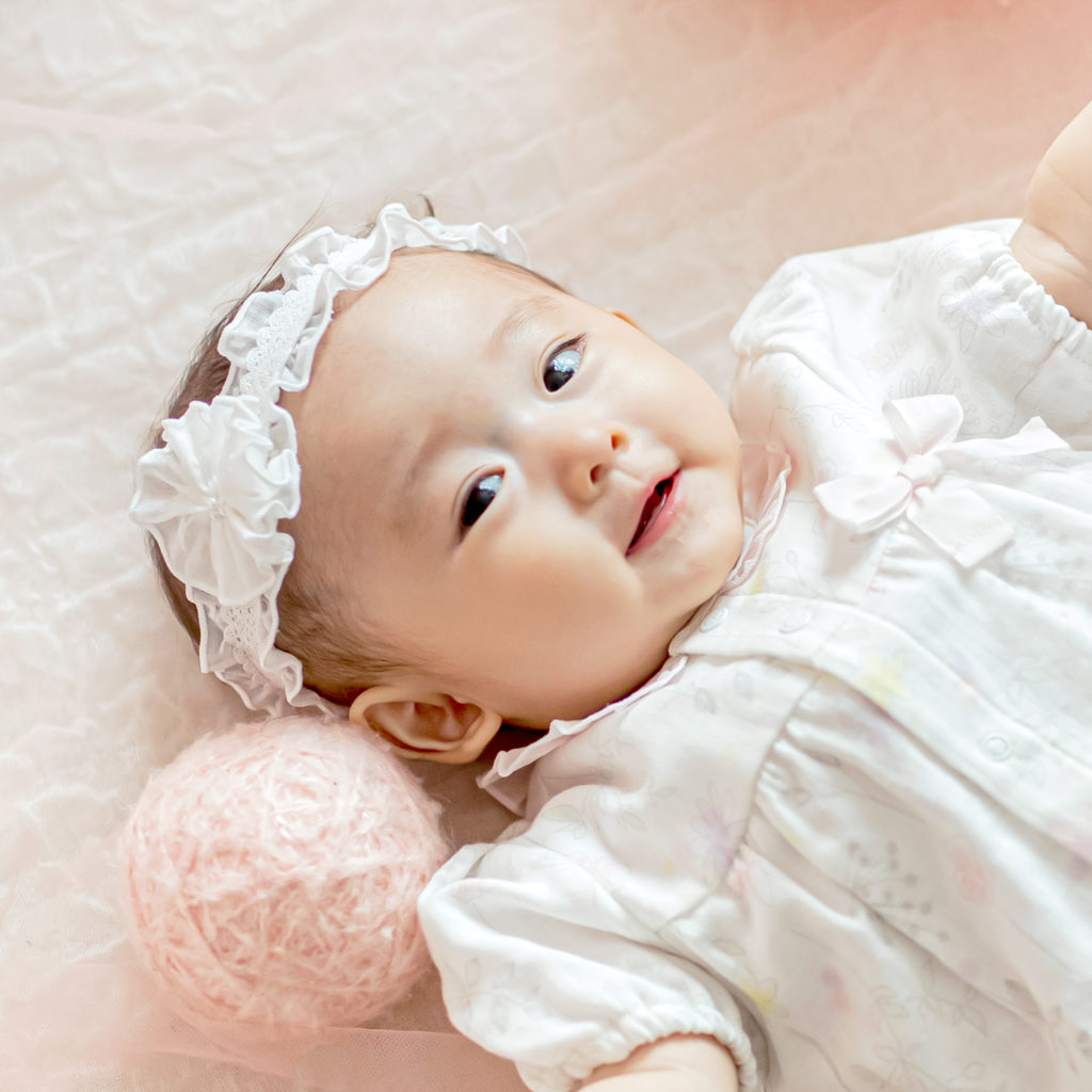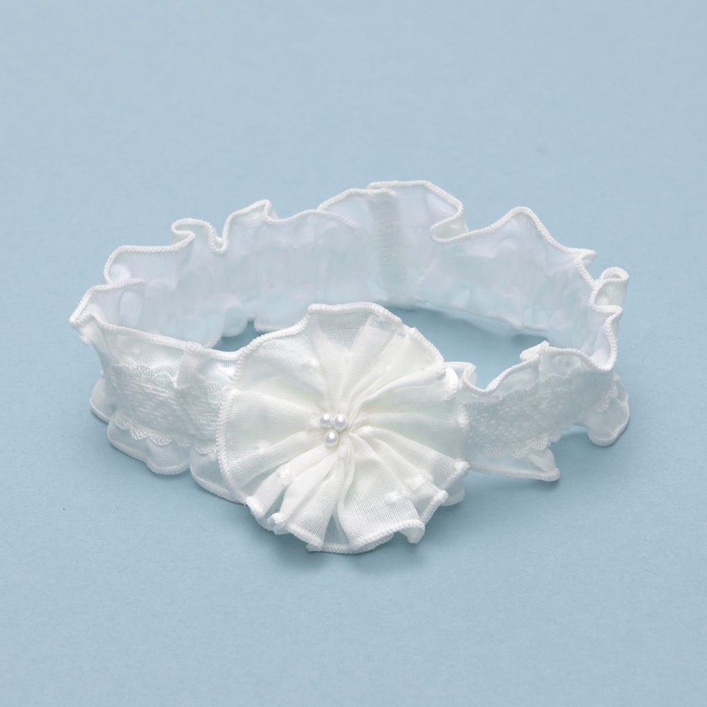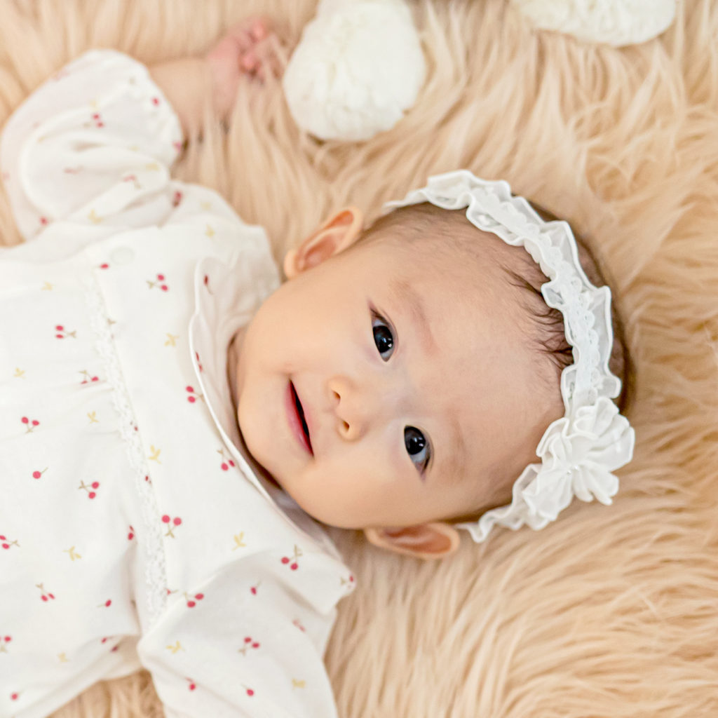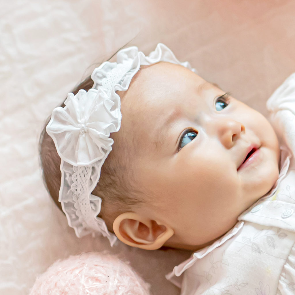 お花のようなフリルがかわいい髪飾り。 中央のパールビーズが可憐なデザインです。 伸縮性のあるレースを使用しているので、頭にやさしくフィットします。 ご退院やお披露目はもちろん、普段使いにも活躍するアイテムです。