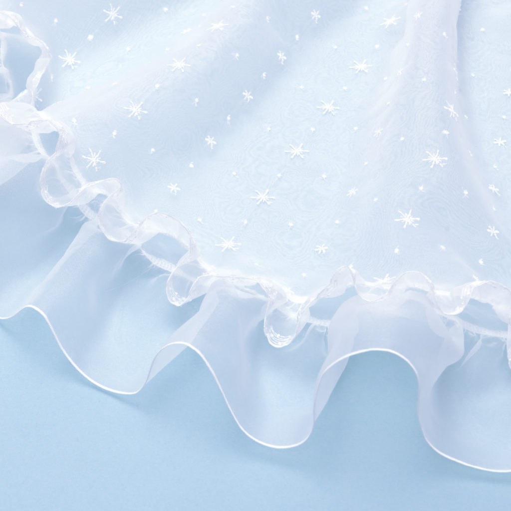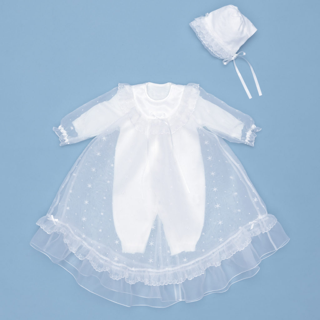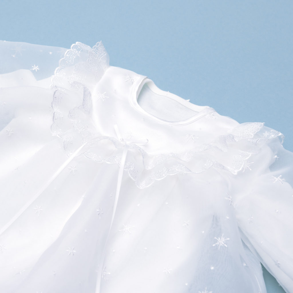 コートドレスにツーウェイオール、更にフードまで揃った豪華な3点セット。やわらかな光沢と透け感が美しいオーガンジーに繊細な刺繍をほどこしました。たっぷりとあしらわれたレースが赤ちゃんのお顔まわりを華やかに演出します。 インナーのツーウェイオールはフライス素材を使用しているので、年間を通してお使い頂けます。 お宮参りだけでなく、ご退院やお食い初めなど、赤ちゃんとご家族の大切な記念日を彩ります。