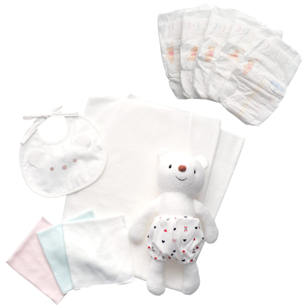 | サイズ・寸法 | ●おむつMサイズ(8枚) ●バスタオル 75×75cm ●スタイ ●ハンカチ(3枚) ●ぬいぐるみ |