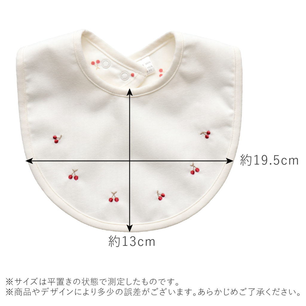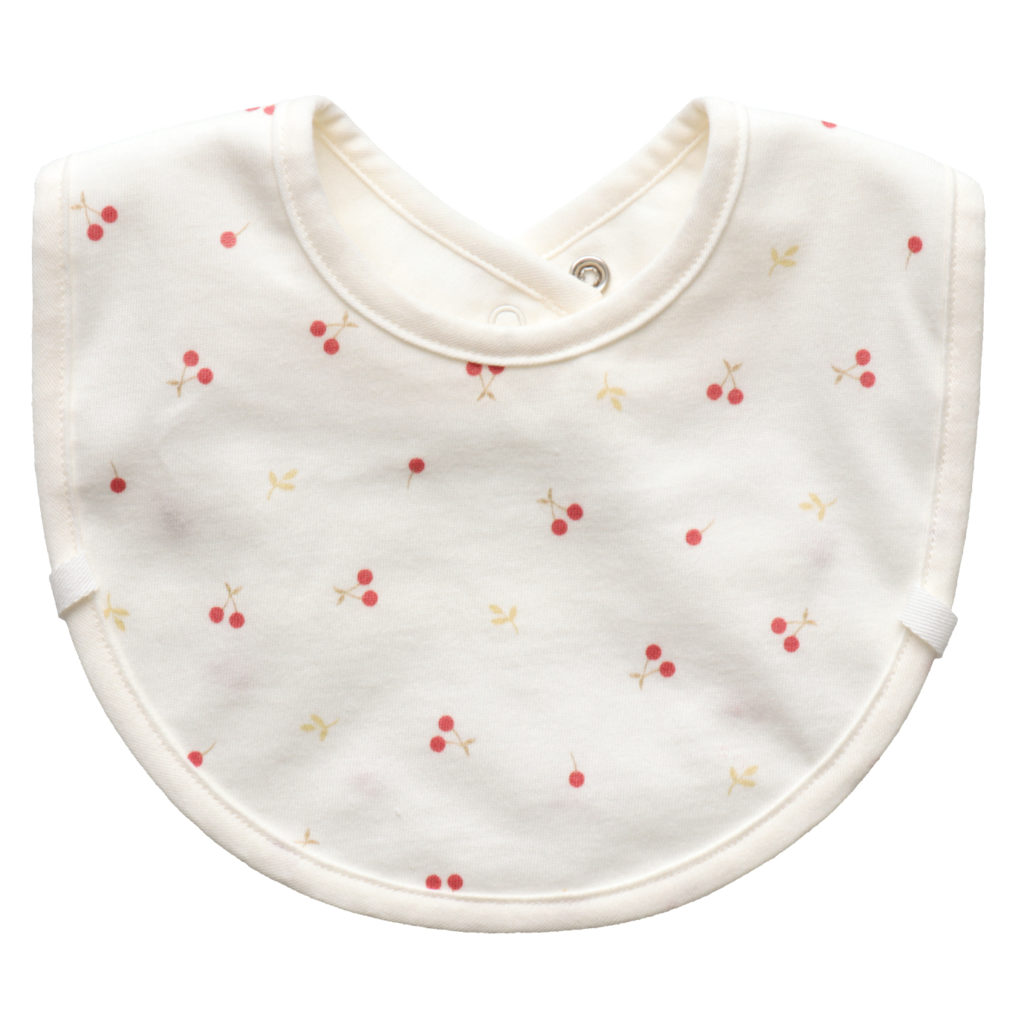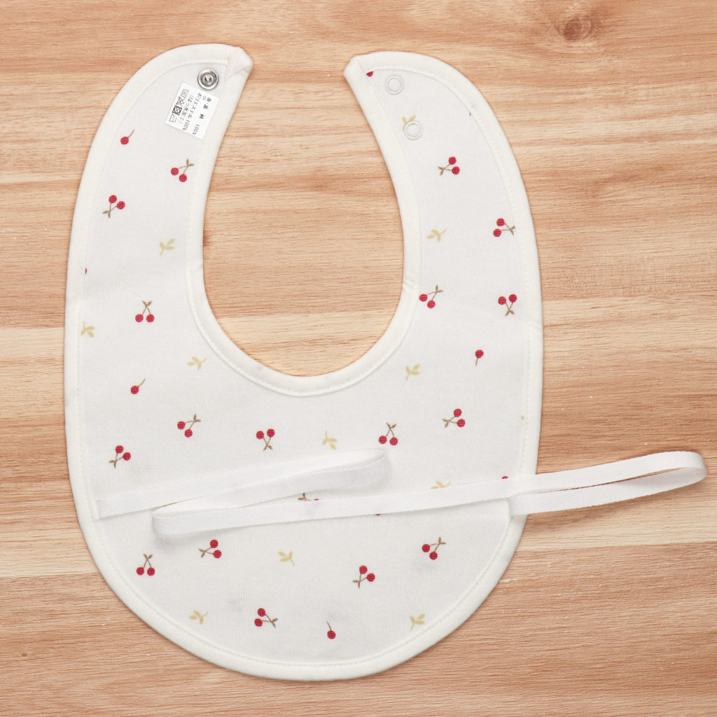 かわいいさくらんぼ柄のスタイです。 中には撥水加工の生地を使用しているので、機能性もばっちり。 リバーシブル仕様で、表も裏も可愛い! 何枚あっても便利なスタイは、出産準備の必需品。 プレゼントにも喜ばれる人気アイテムです。 スタイの裏側には、めくれて顔にかかる事を防止する紐が付いています。 中央で切るか、そのまま結んでお使いください。