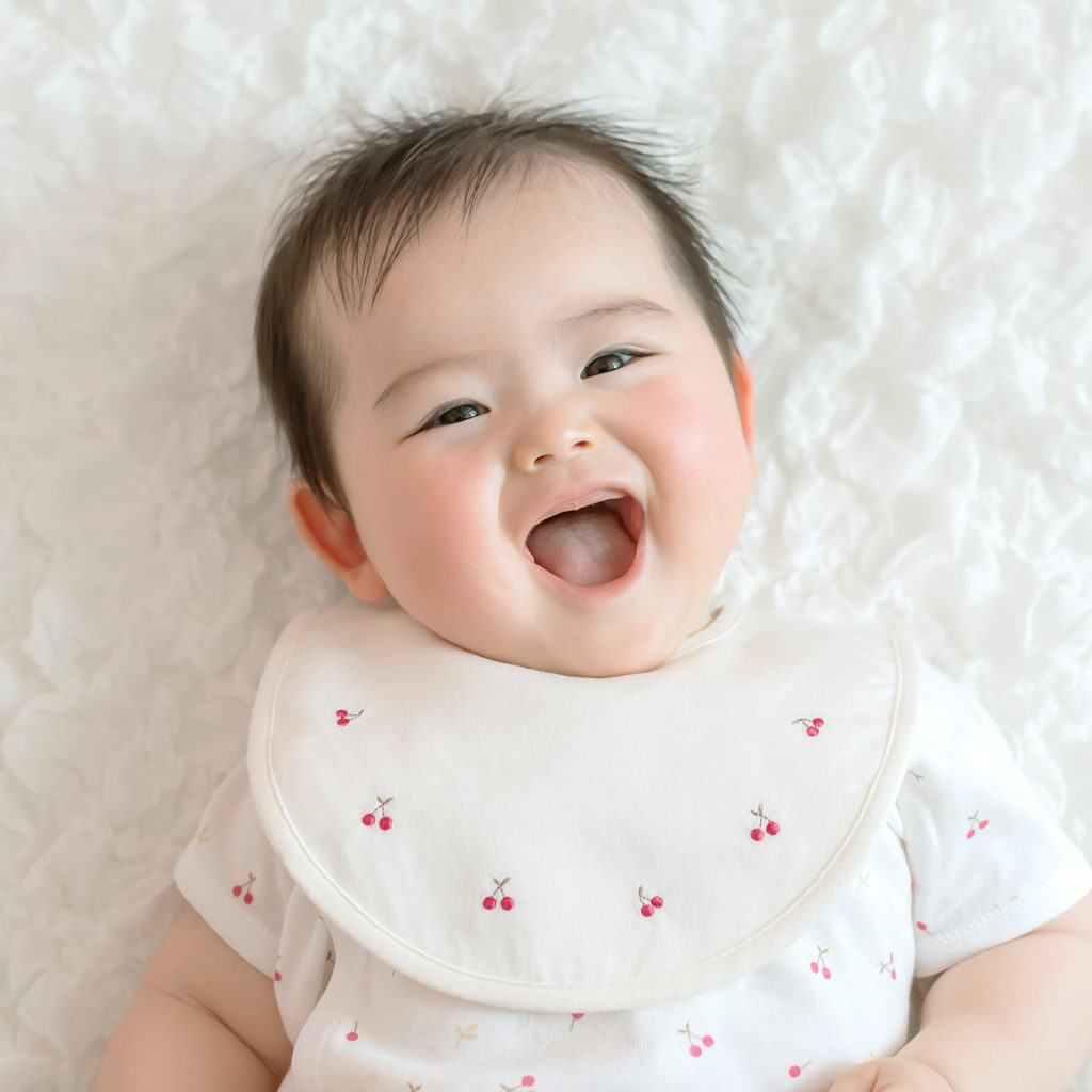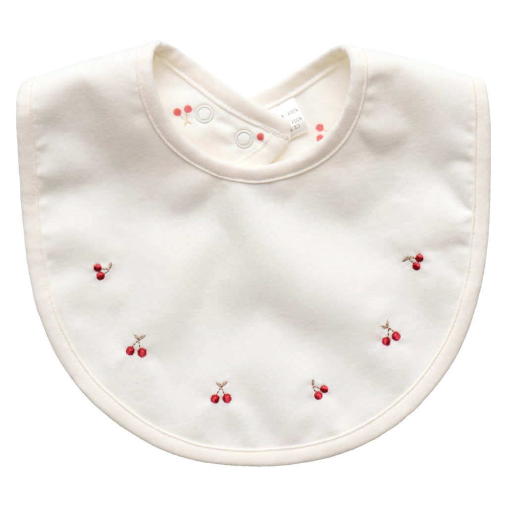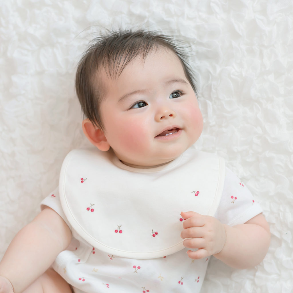 かわいいさくらんぼ柄のスタイです。 中には撥水加工の生地を使用しているので、機能性もばっちり。 リバーシブル仕様で、表も裏も可愛い! 何枚あっても便利なスタイは、出産準備の必需品。 プレゼントにも喜ばれる人気アイテムです。 スタイの裏側には、めくれて顔にかかる事を防止する紐が付いています。 中央で切るか、そのまま結んでお使いください。