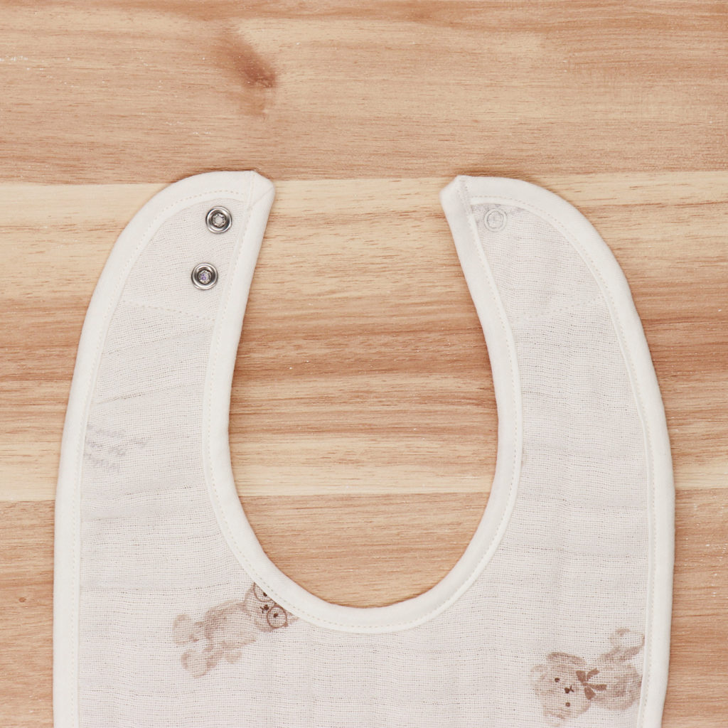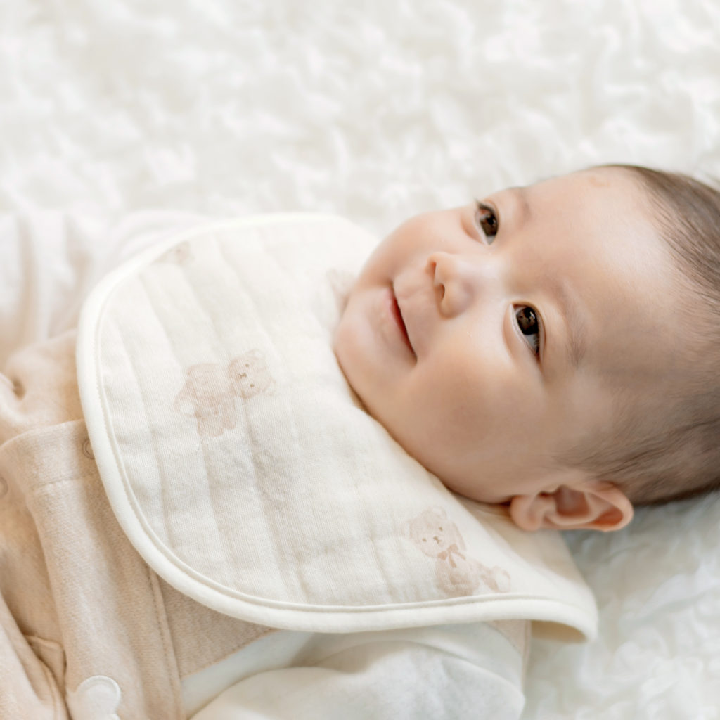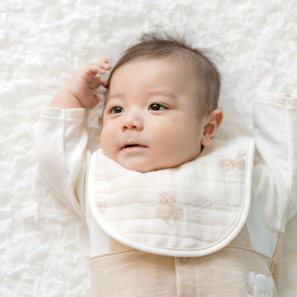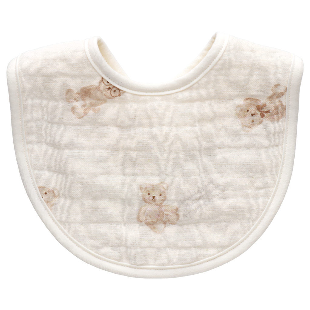 男女兼用のかわいいくま柄プリントのスタイです。 やわらかなワッシャー加工の六重ガーゼで、よだれをしっかり吸収します。 何枚あっても便利なスタイは、出産準備の必需品。 プレゼントにも喜ばれる人気アイテムです。 スタイの裏側には、めくれて顔にかかる事を防止する紐が付いています。 中央で切るか、そのまま結んでお使いください。