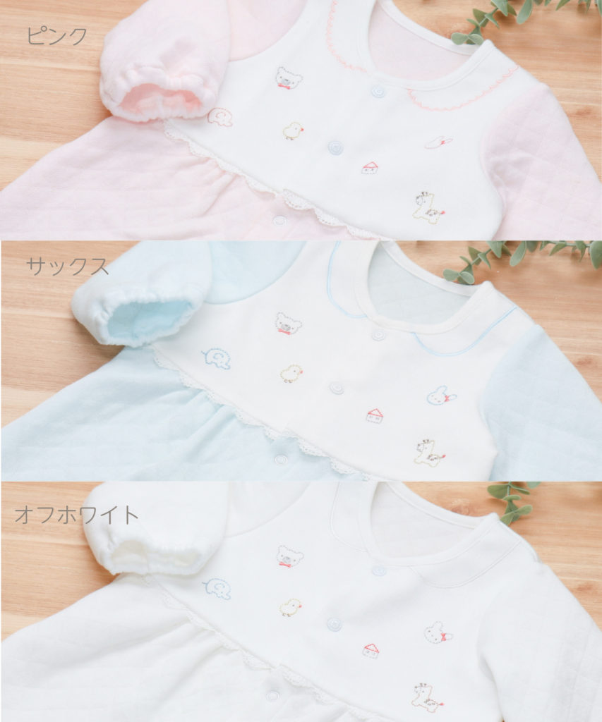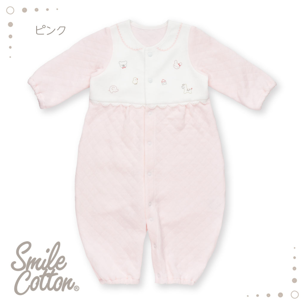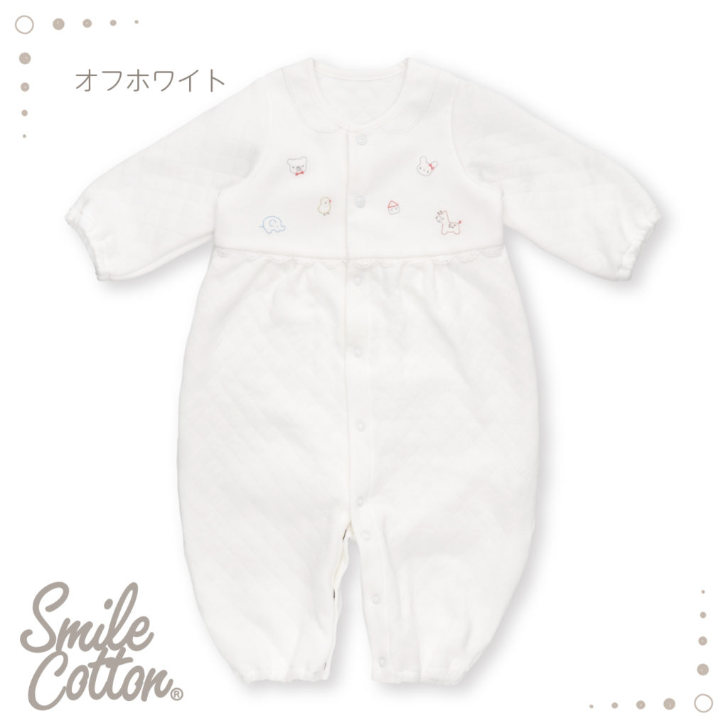 洗っても硬くならず、軽くてふわふわのやわらかさを追求したスマイルコットンを使用した、秋から冬にぴったりのウェアです。 肌への刺激が少なく、赤ちゃんのデリケートな肌にもやさしい素材です。 生まれてすぐはすっぽり足を包むドレスタイプ。 足がばたばたできるようになったらボタンを留め替えてカバーオールタイプにもなるツーウェイ仕様です。