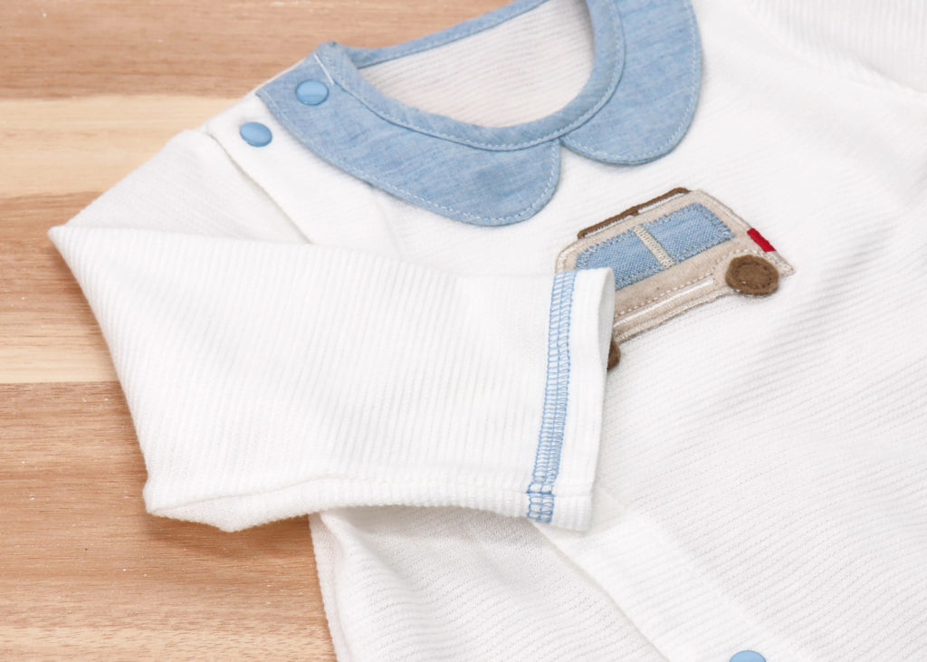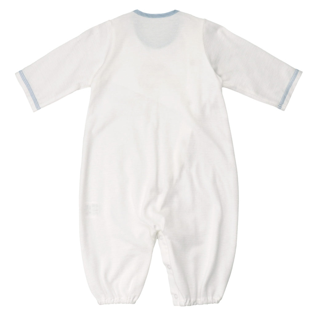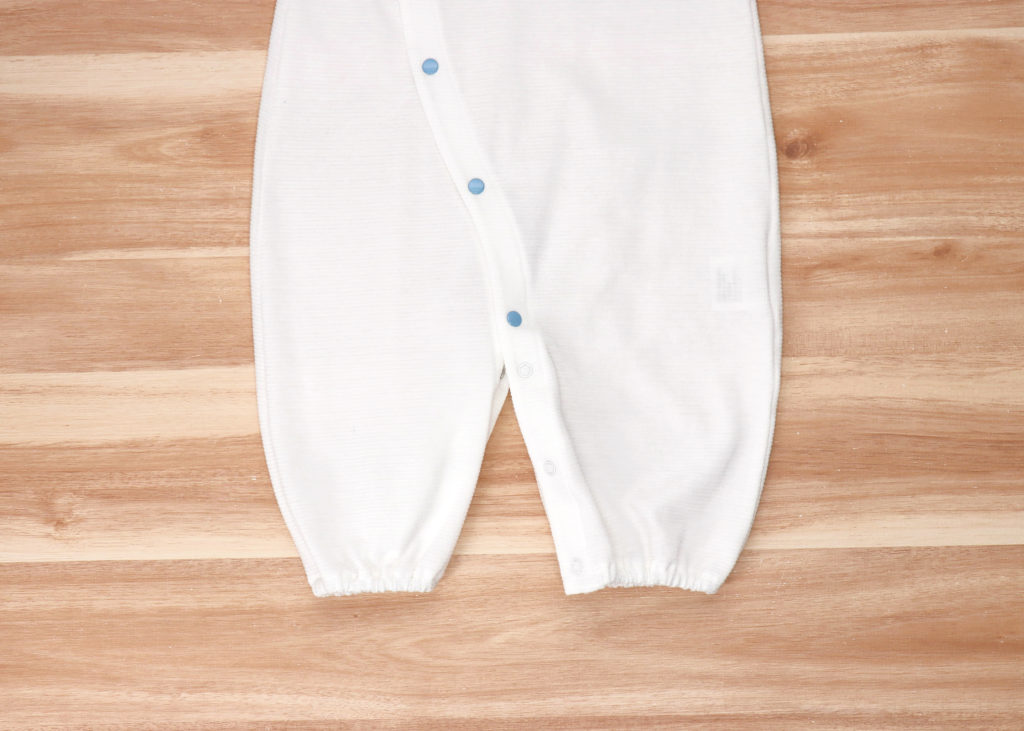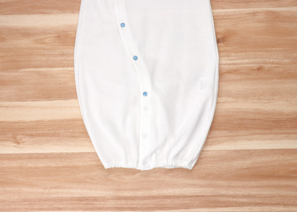 生まれてすぐは足を包むドレスタイプ。 足をばたばた出来るようになったらボタンを留め替えて、カバーオールタイプにもなるツーウェイ仕様です。