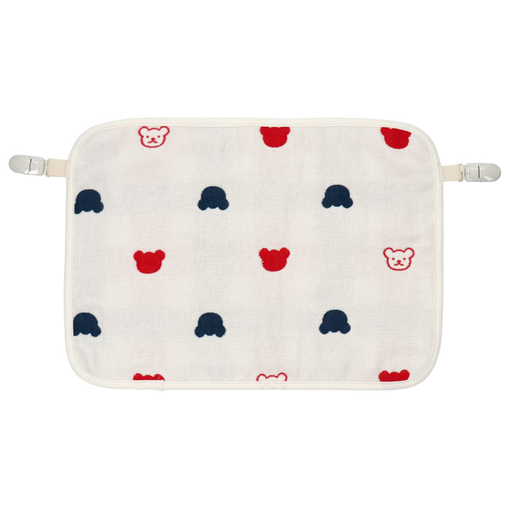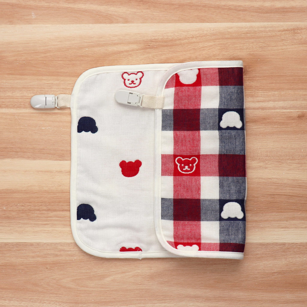 抱っこひもにクリップで取り付けます。ボリュームのある六重ガーゼでよだれをしっかり吸収。前向き抱っこの時も対面抱っこの時も、取り付けが出来るので、ママ・パパのお洋服や抱っこひもをよだれからガードします。