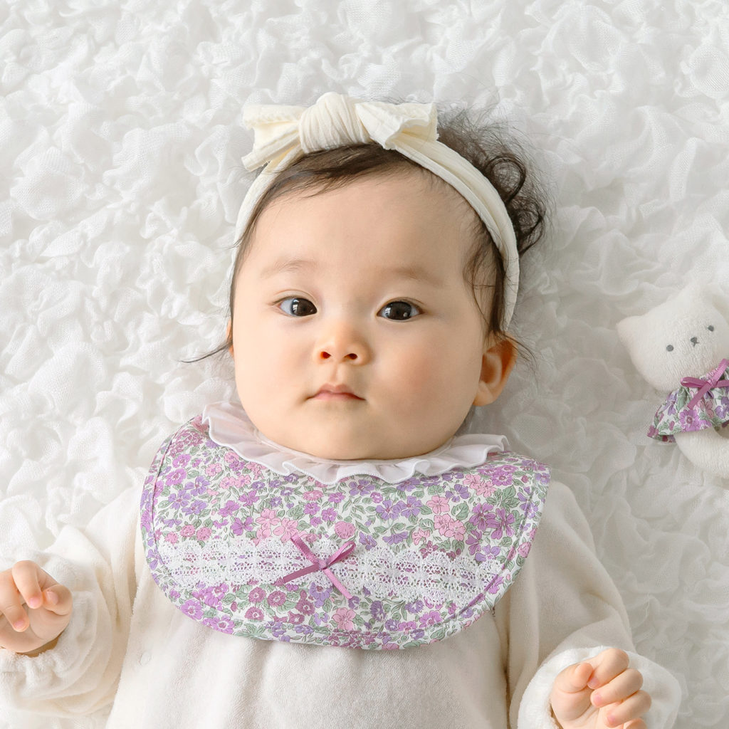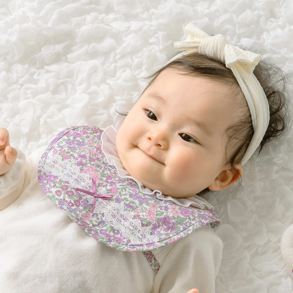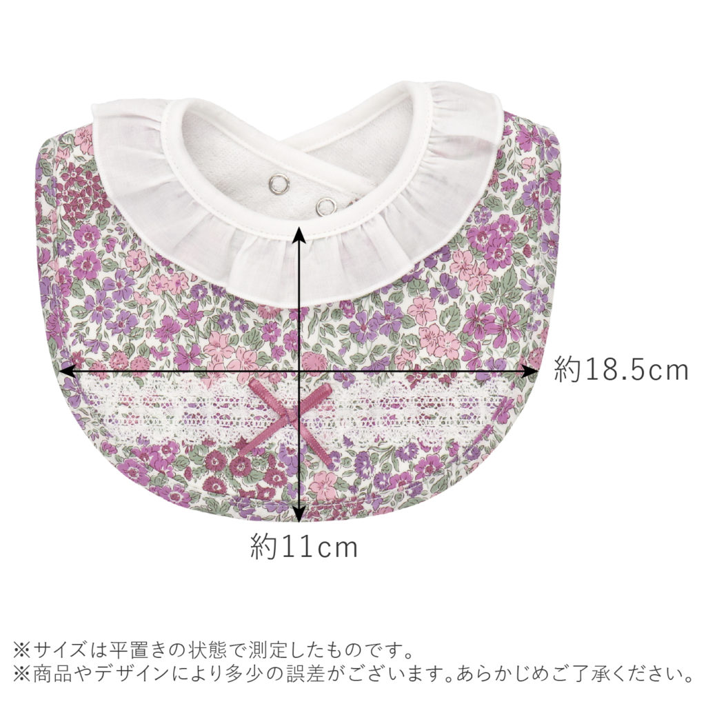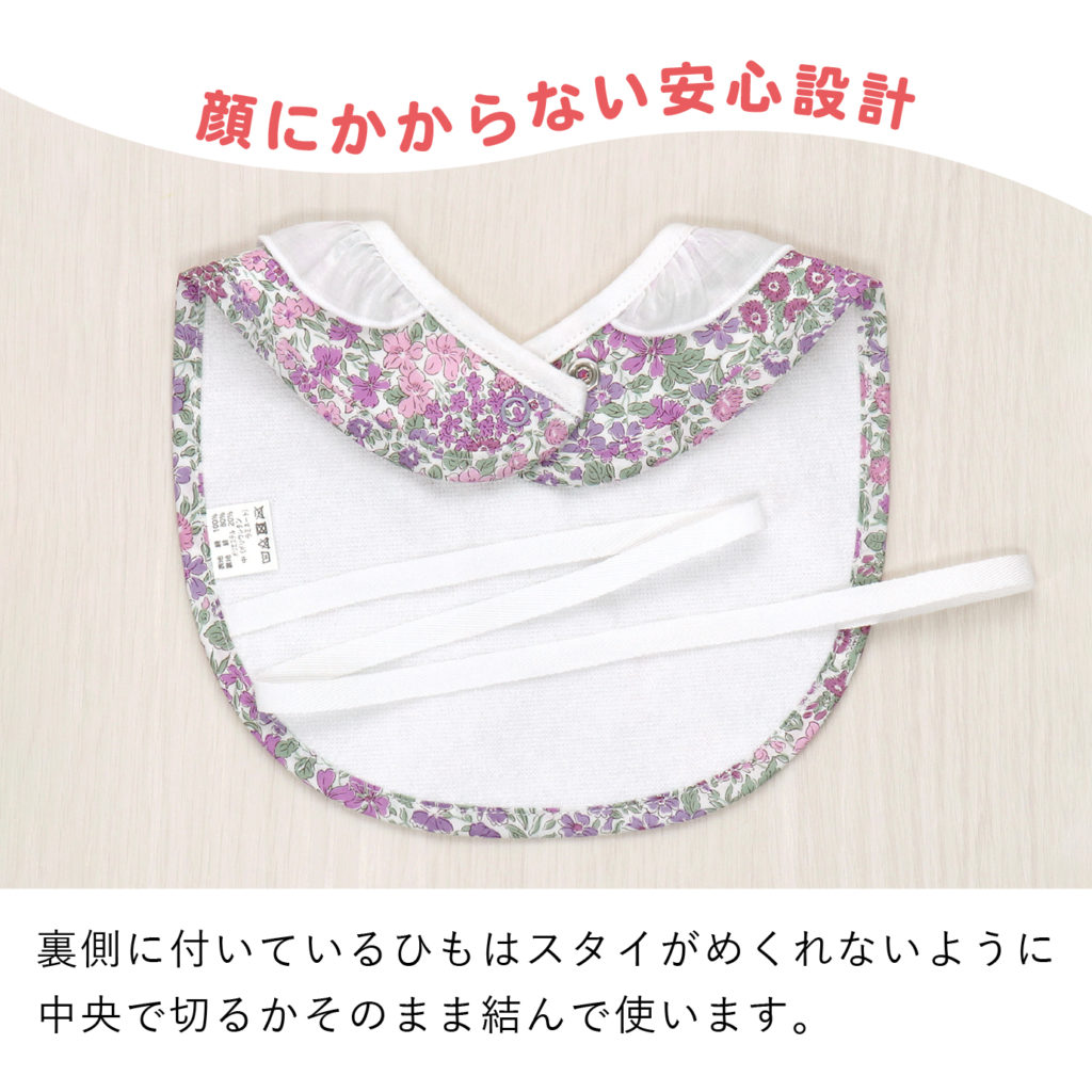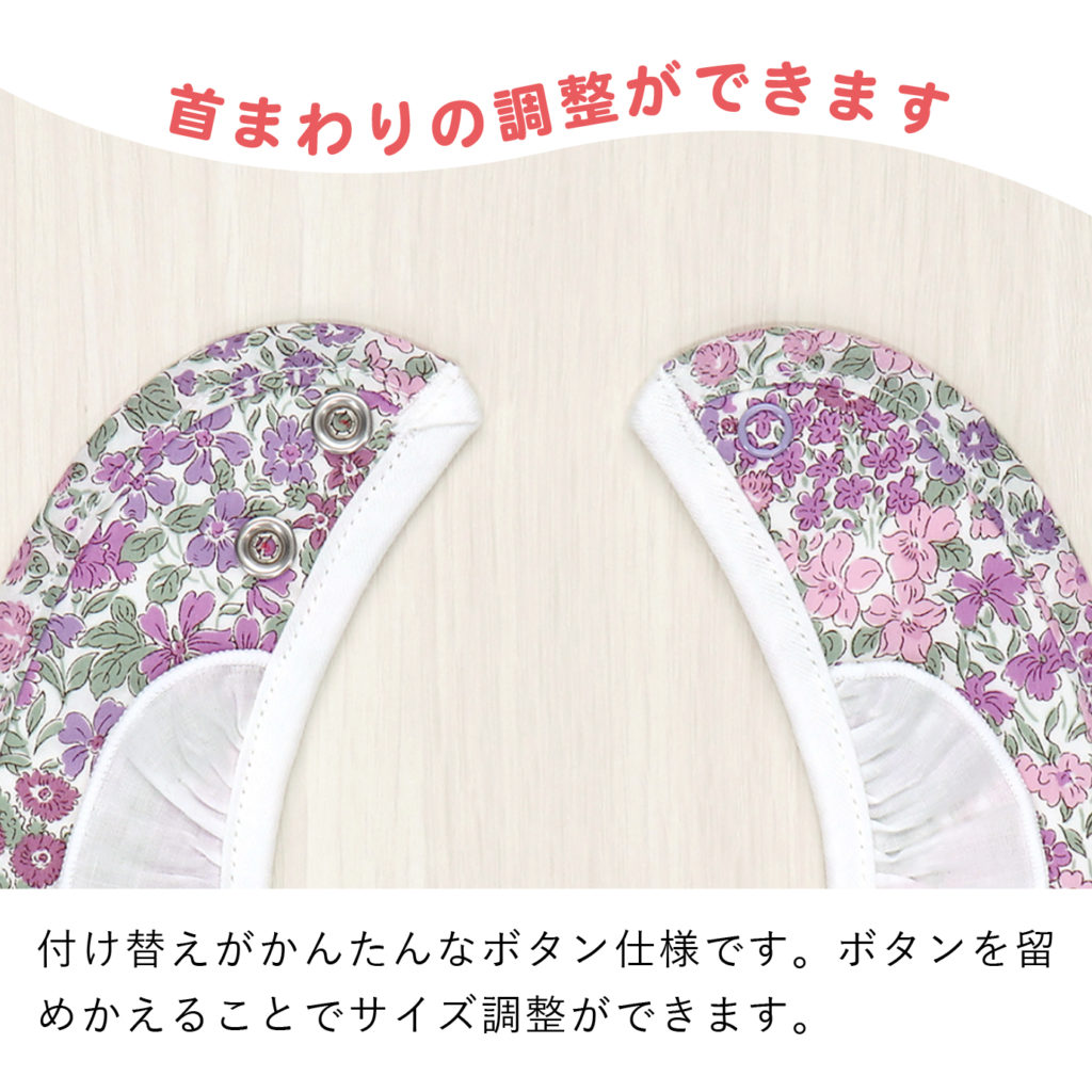 どんなお洋服にも映えるリバティの生地を使用した、華やかでかわいらしいスタイです。表はやわらかなパイル素材。裏面には防水パイルを使用しているので、機能性もばっちり!何枚あっても便利なスタイは、出産準備の必需品。プレゼントにも喜ばれる人気アイテムです。