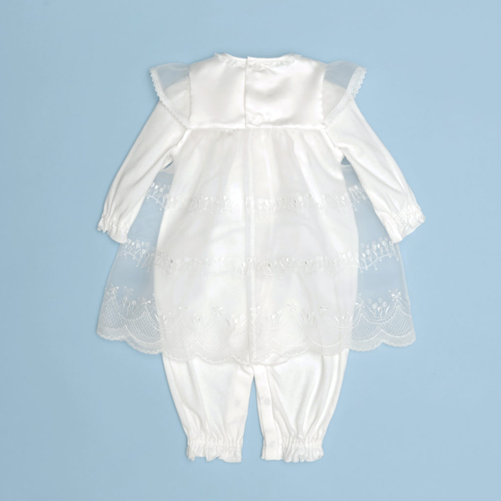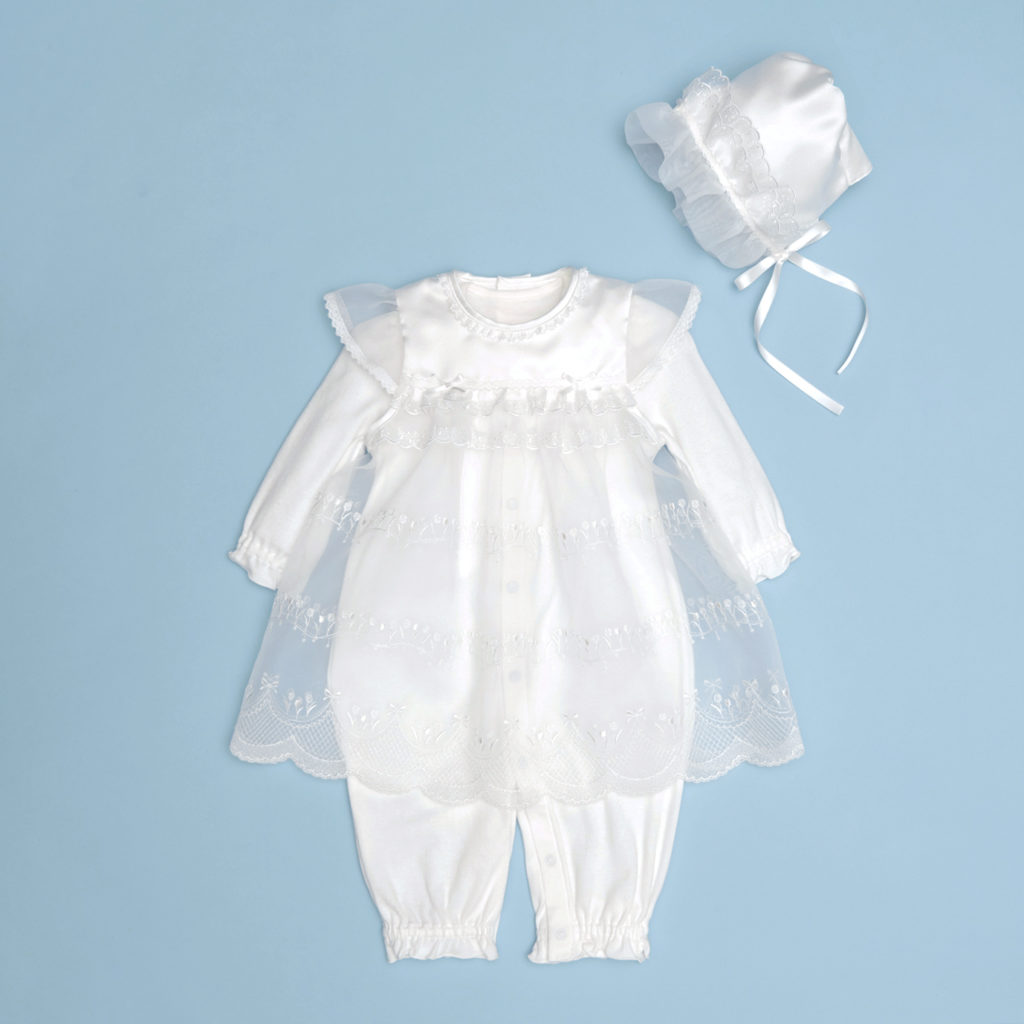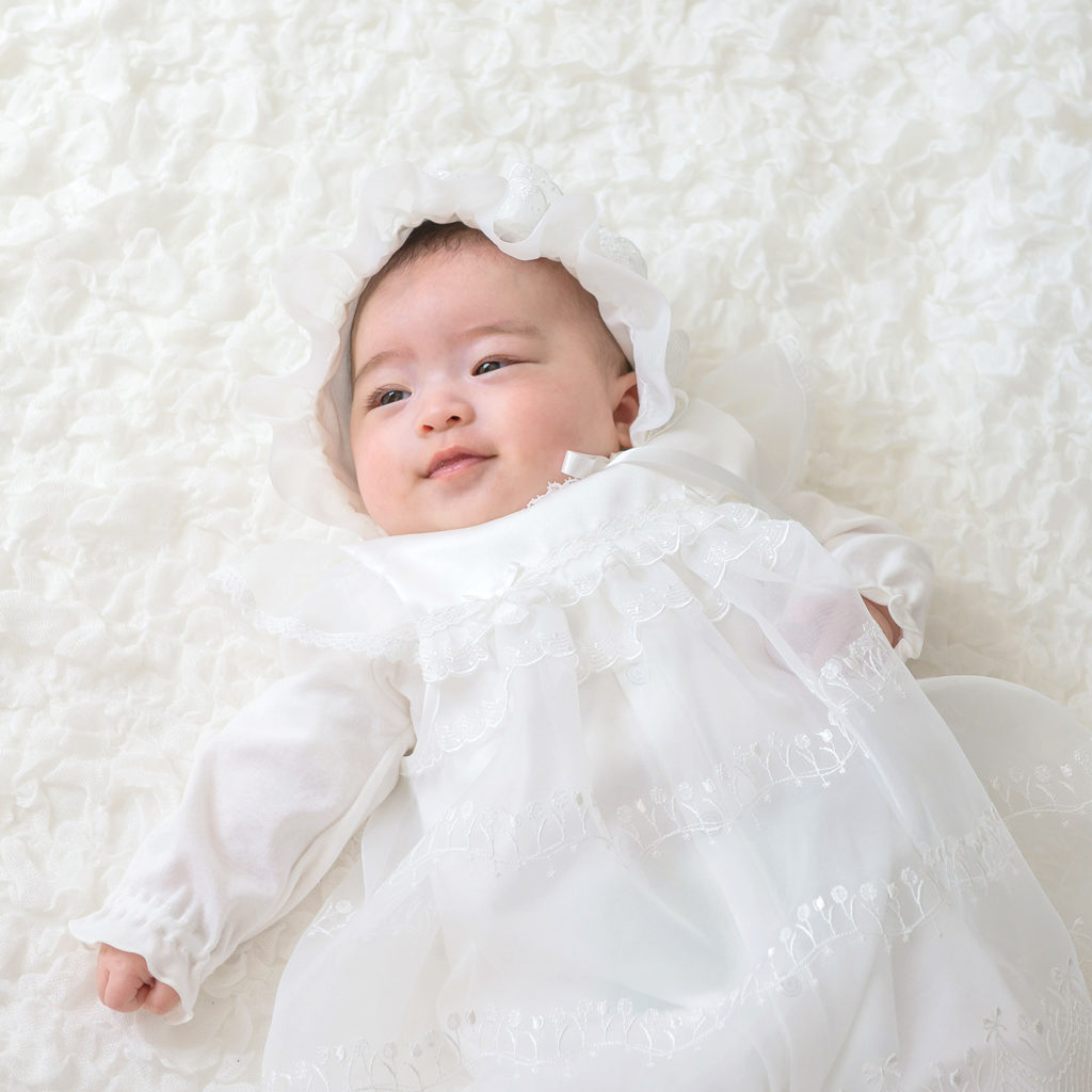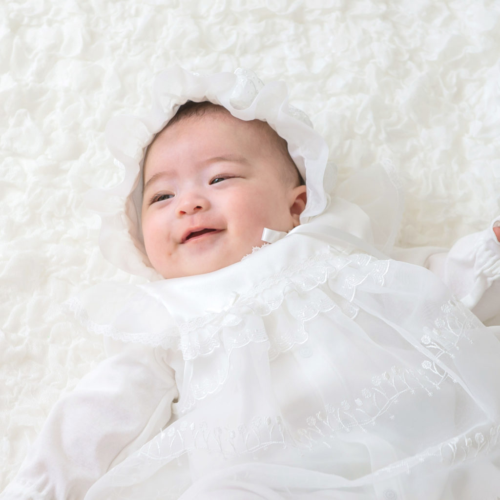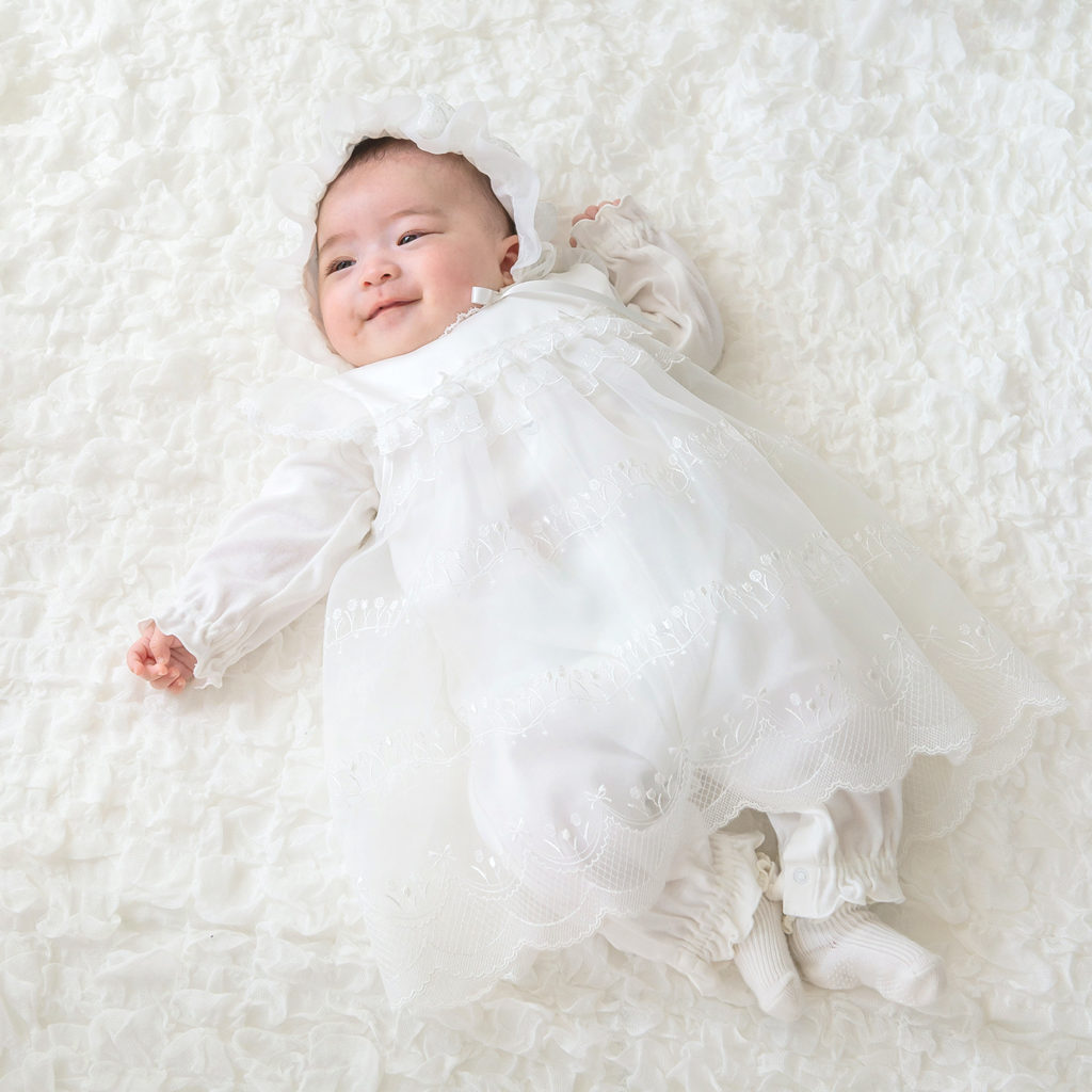 軽やかで可愛らしいショート丈のセレモニードレスです。 コートドレスにツーウェイドレス、更にフードまで揃った豪華な3点セット。 インナーのツーウェードレスはフライス素材を使用しているので、年間を通してお使い頂けます。 お宮参りだけでなく、ご退院やお食い初めなど、赤ちゃんとご家族の大切な記念日を彩ります。