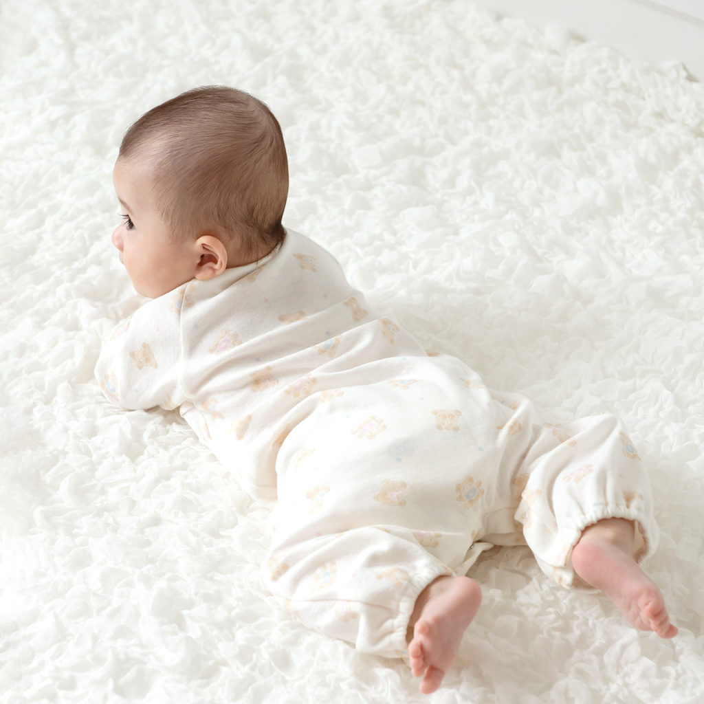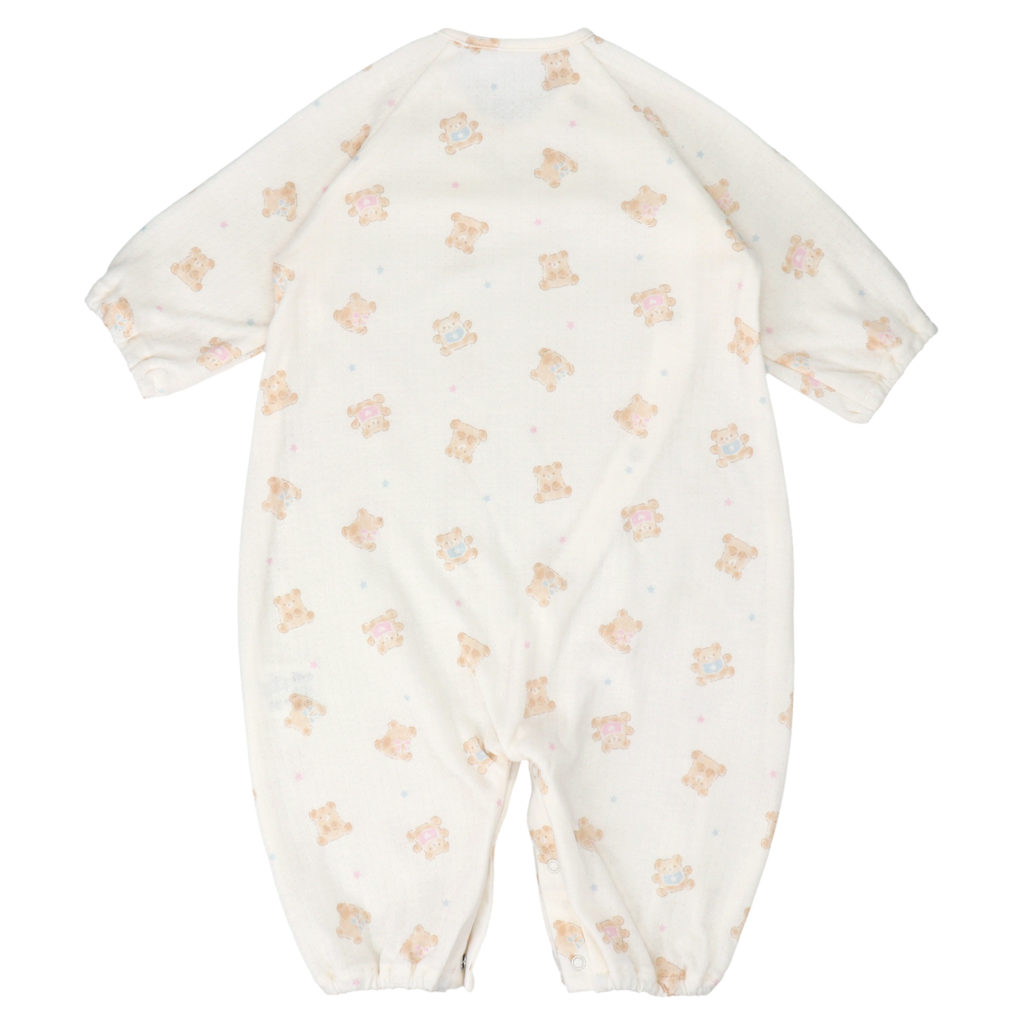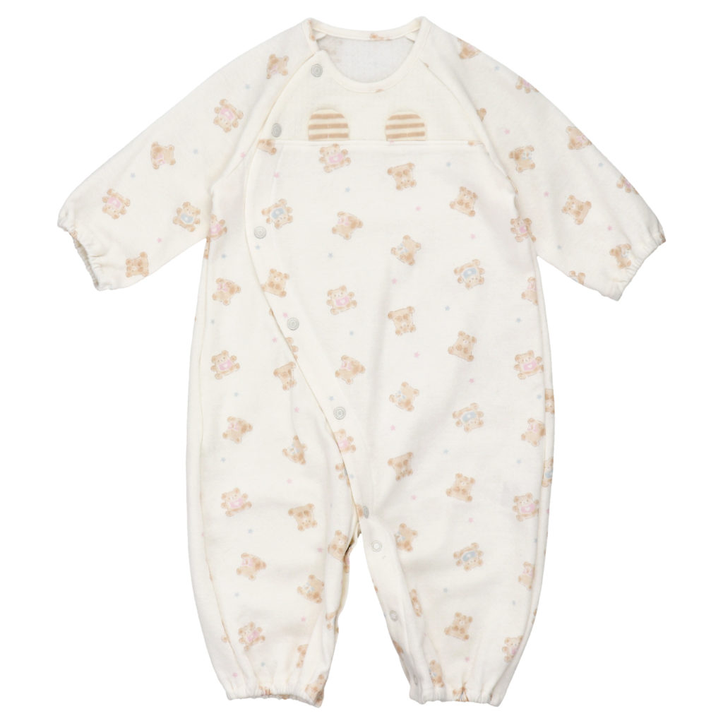 ちょこんと出たくまみみが可愛い優しい色合いのプリント柄のウェアです。ふんわりした雰囲気が赤ちゃんによく似合います。やわらかく保温性のある接結素材で、秋から春先まで活躍します。生まれてすぐは足を包むドレスタイプ。足をばたばた出来るようになったらボタンを留め替えて、カバーオールタイプにもなるツーウェイ仕様です。