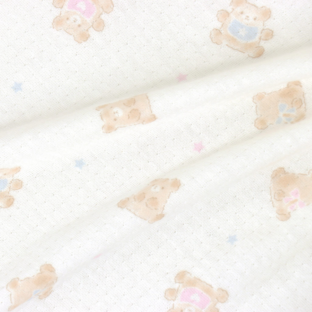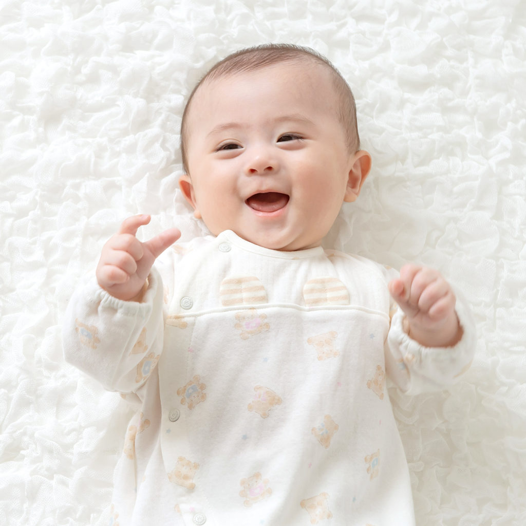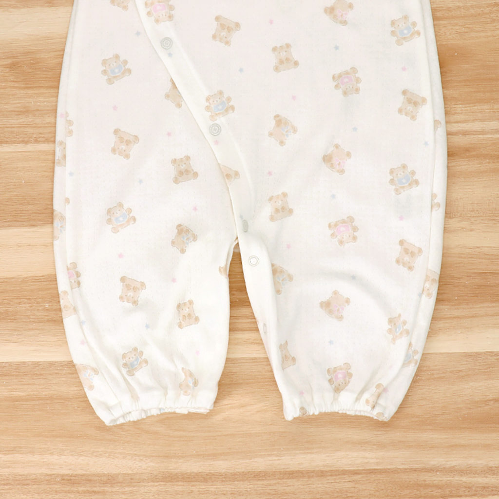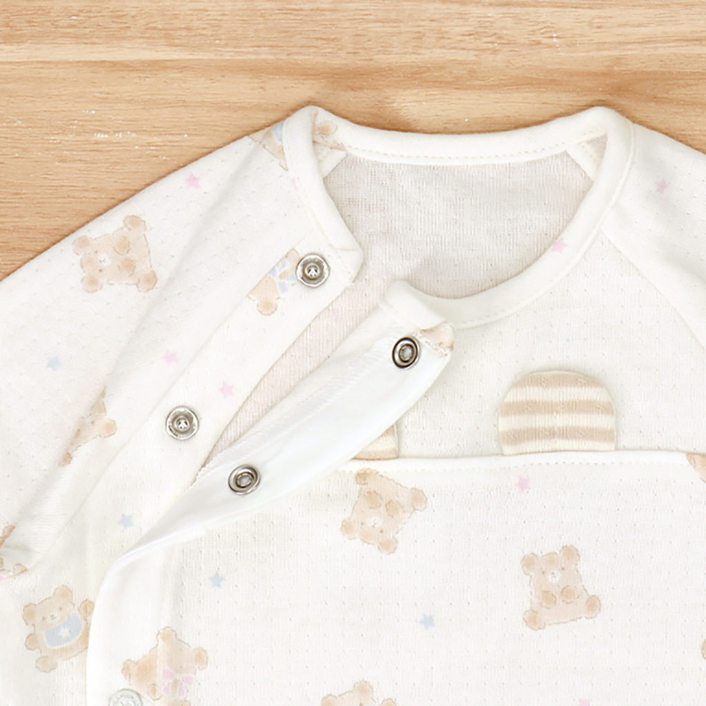 ちょこんと出たくまみみが可愛い優しい色合いのプリント柄のウェアです。ふんわりした雰囲気が赤ちゃんによく似合います。やわらかく保温性のある接結素材で、秋から春先まで活躍します。生まれてすぐは足を包むドレスタイプ。足をばたばた出来るようになったらボタンを留め替えて、カバーオールタイプにもなるツーウェイ仕様です。