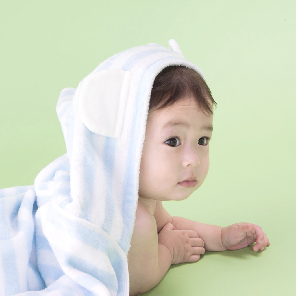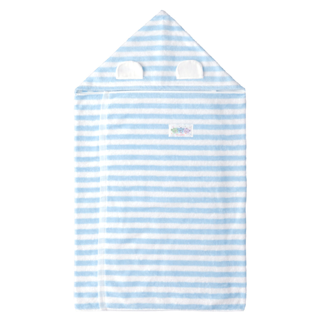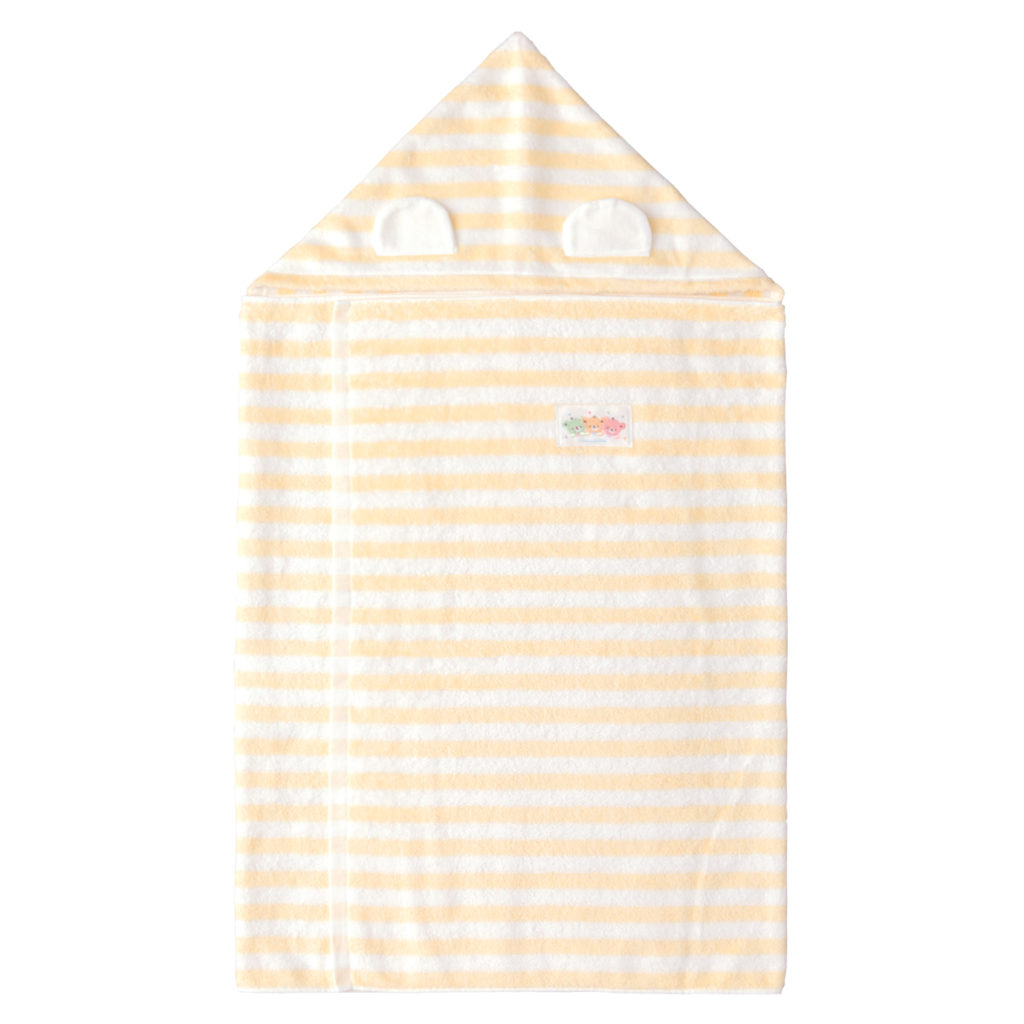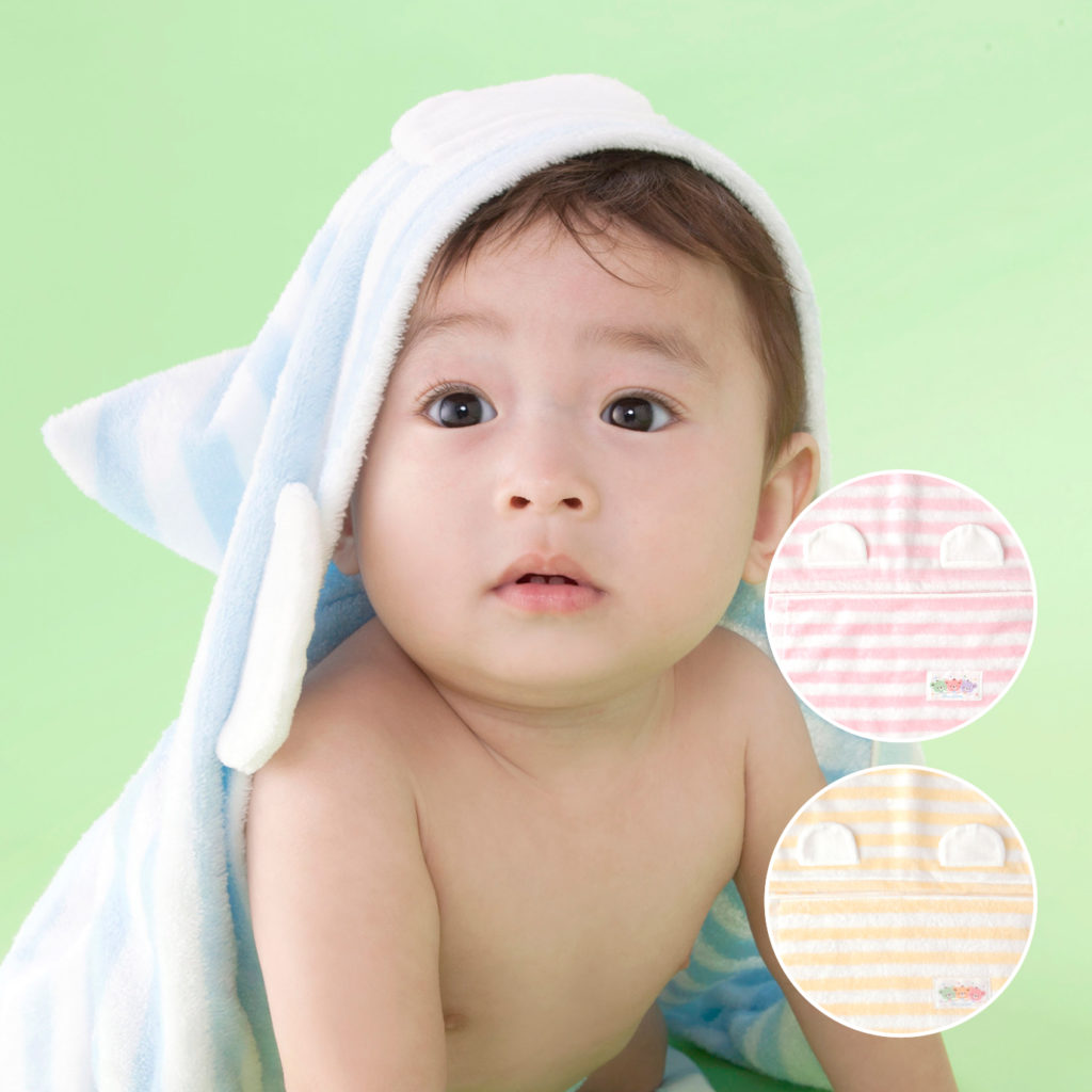 シンプルなボーダーとくまの刺繍がかわいいフード付きバスタオルです。今治タオル独自の品質基準をクリアしたふわふわのタオル素材は、優れた吸水性とやわらかい肌触りが特徴。デリケートな赤ちゃんの肌に最適です。沐浴やお風呂上りに便利なアイテムです。【承認番号:第2013-265号】