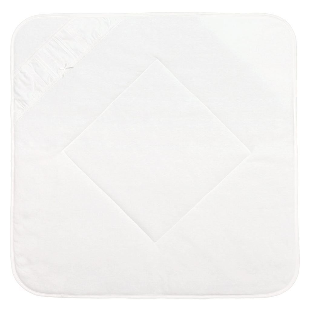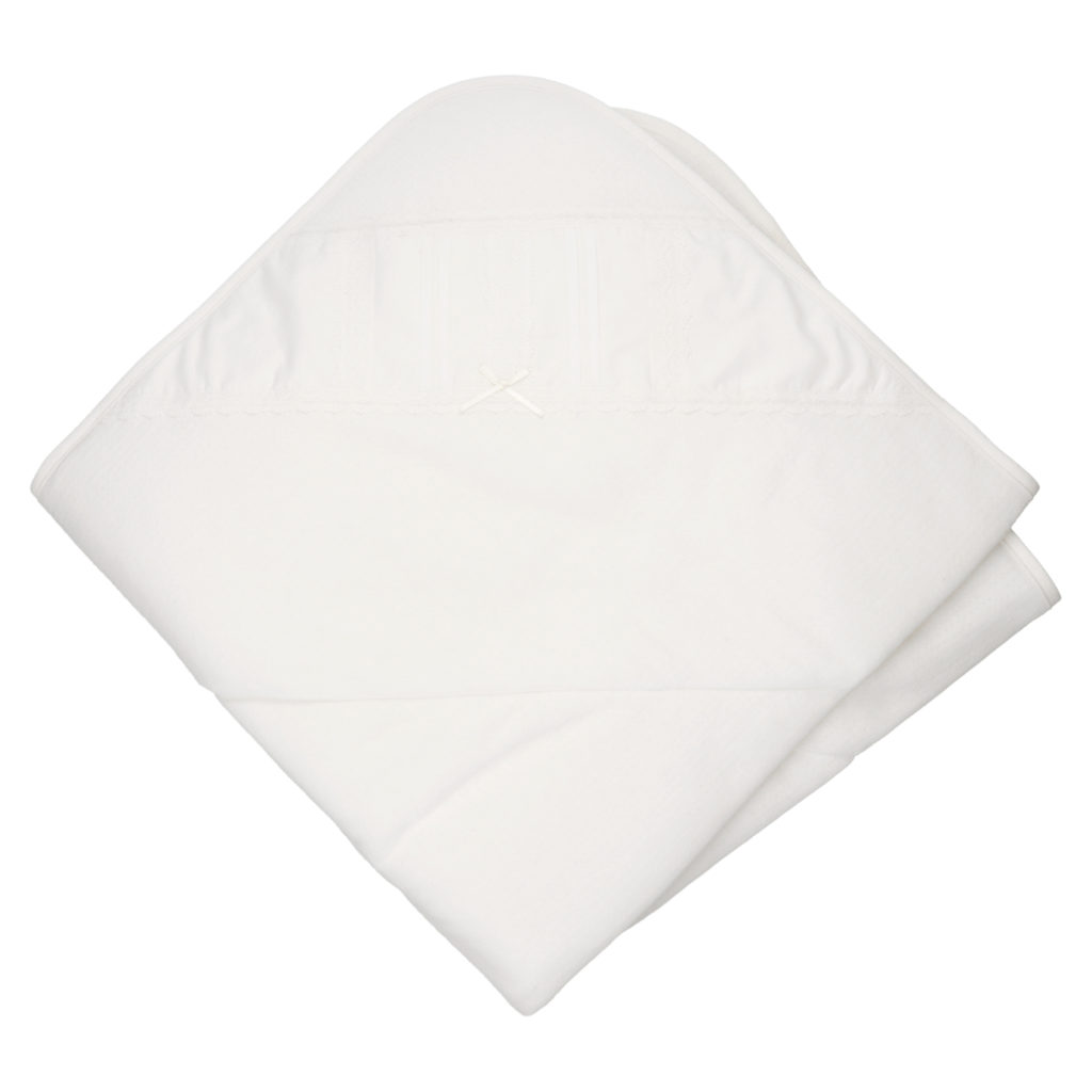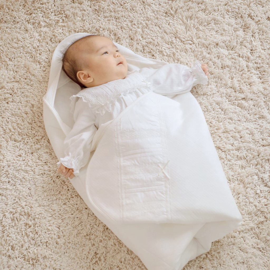 オフホワイトのやわらかい接結素材に繊細なレースとピンタックが入った上品なアフガンです。お出掛けの時や普段使いにも、包んだり掛けたり敷いたり色々使える便利なアイテムです。男女問わずお使い頂けます。