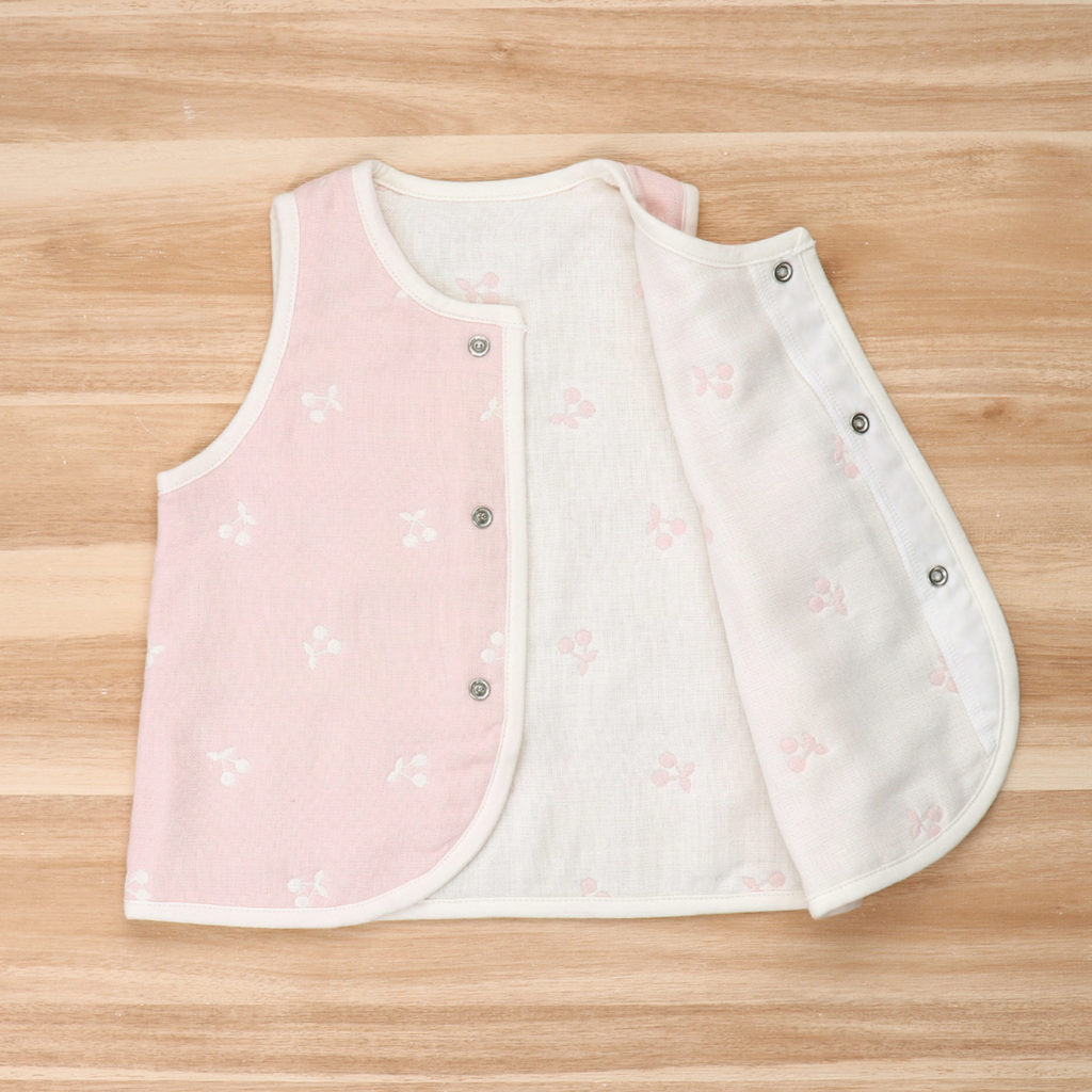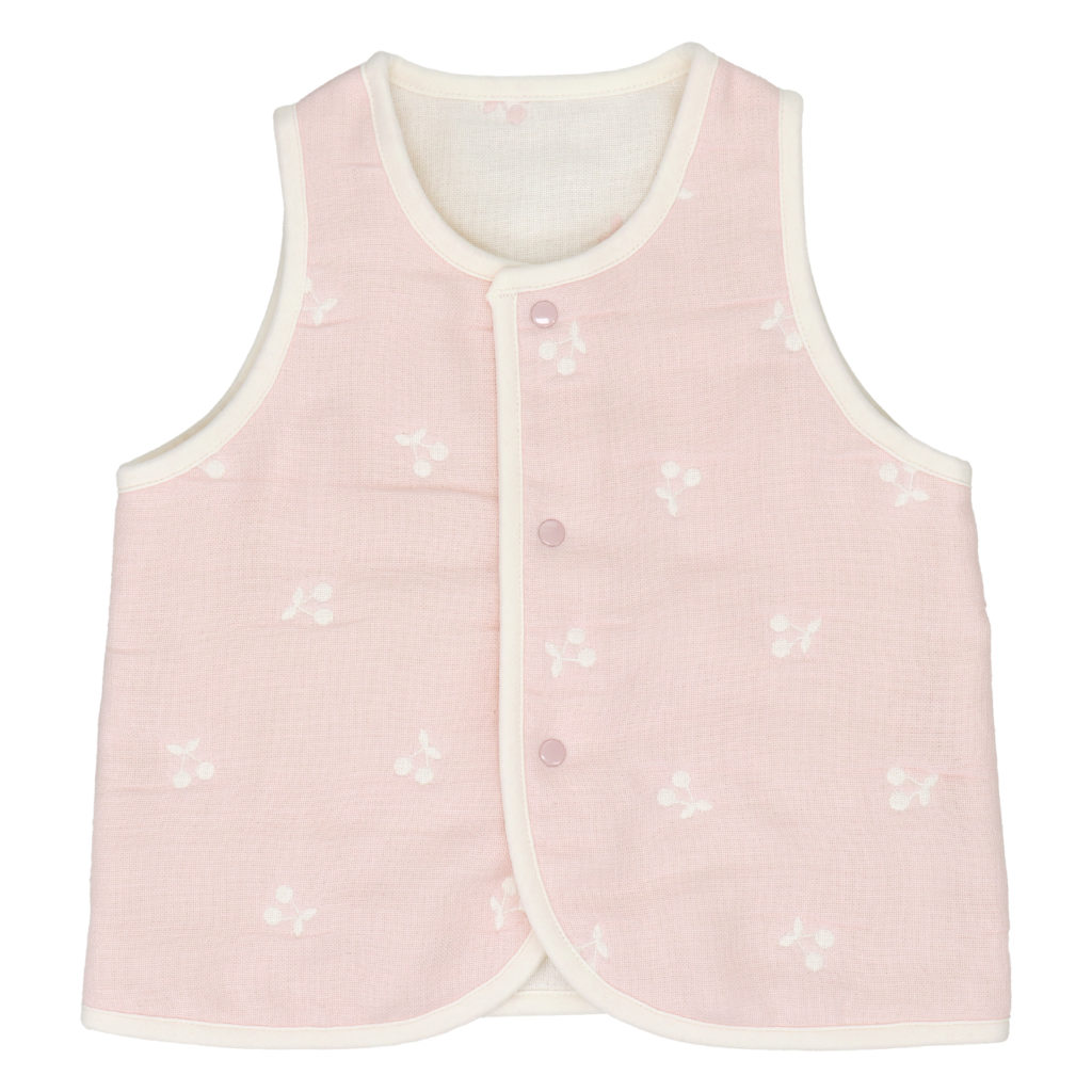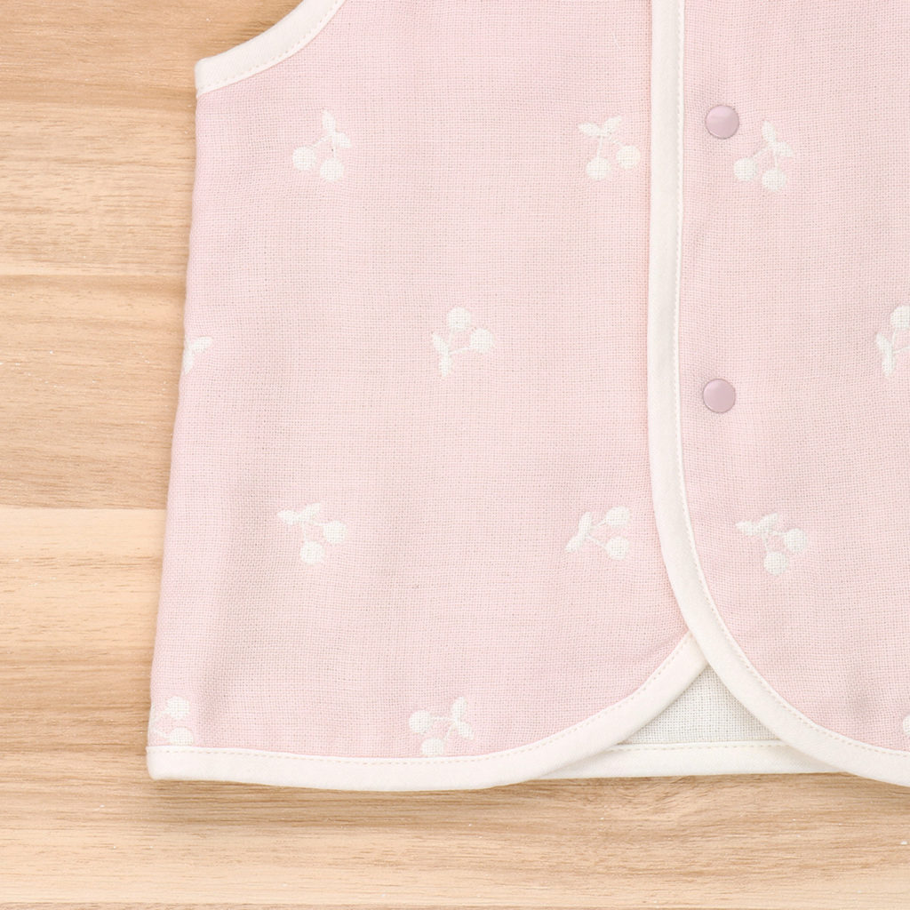 少しくすんださくらんぼの織り柄が可愛いベストは、女の子におすすめです。 手軽に羽織れるので、お外でも室内でも、赤ちゃんの体温調節にとても便利なアイテムです。