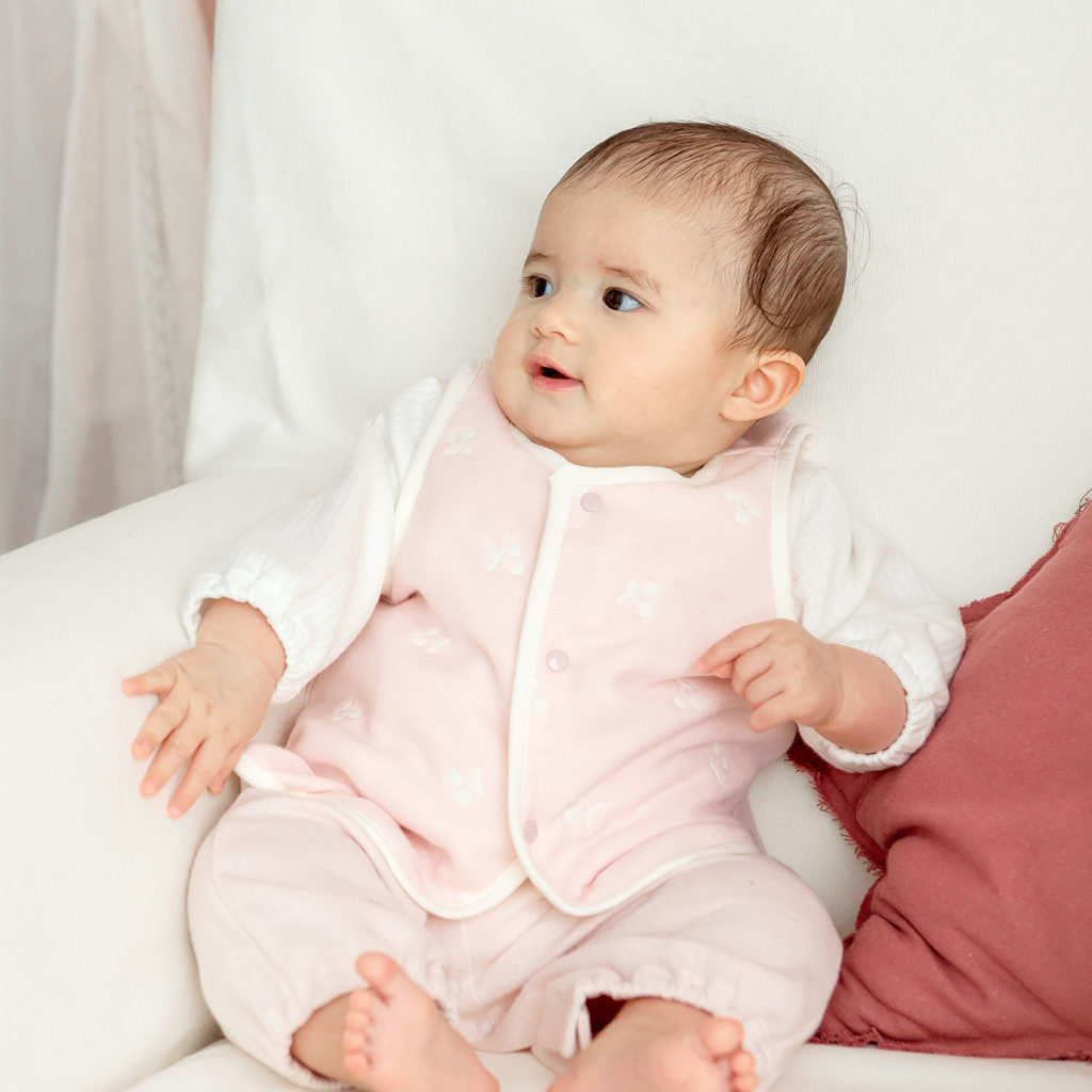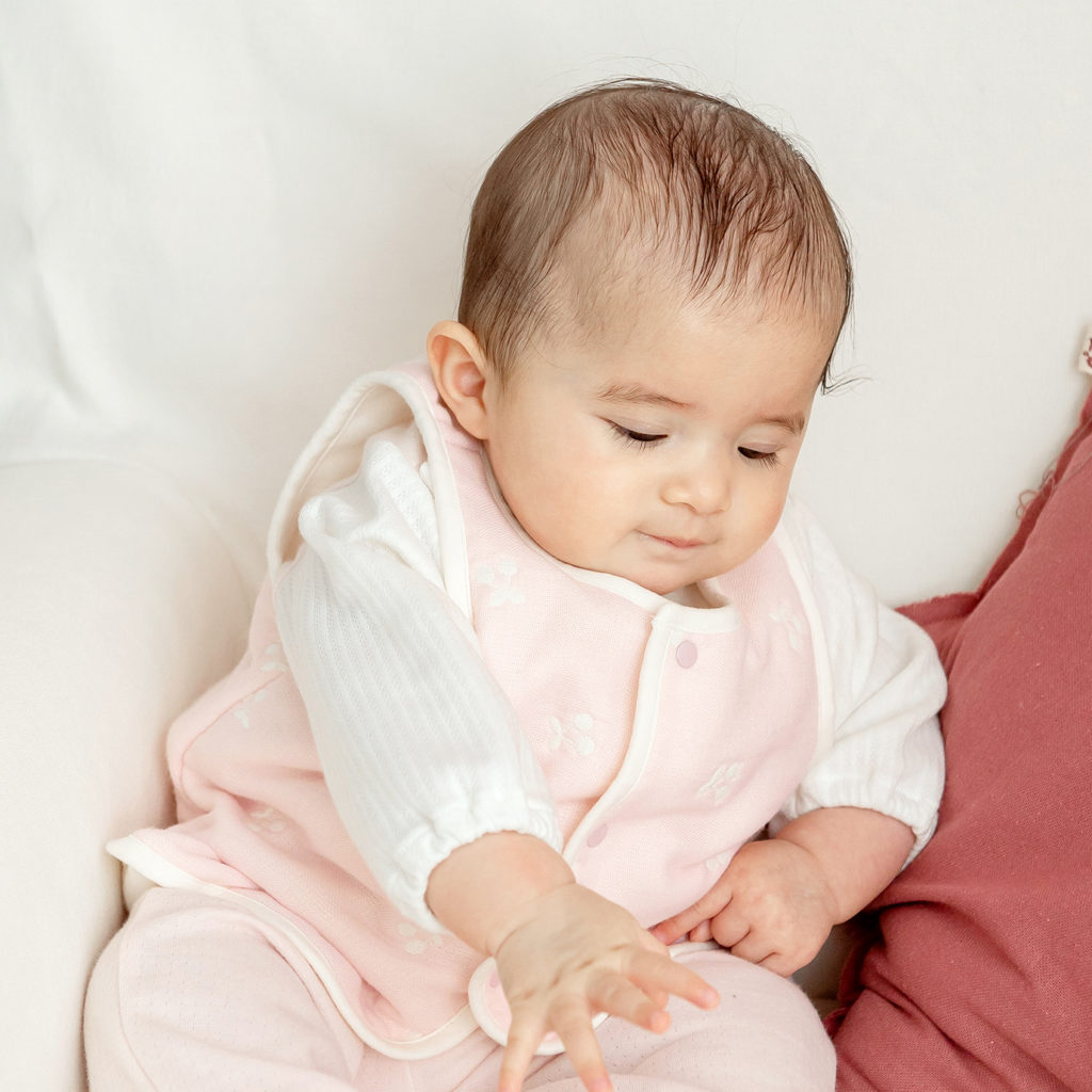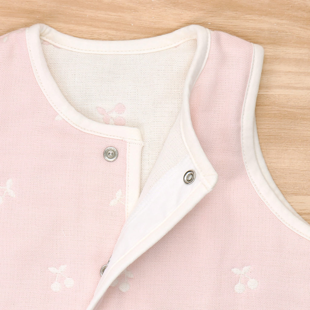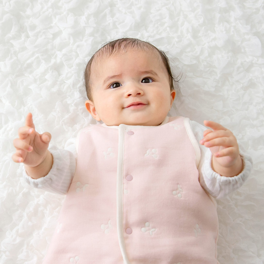 少しくすんださくらんぼの織り柄が可愛いベストは、女の子におすすめです。 手軽に羽織れるので、お外でも室内でも、赤ちゃんの体温調節にとても便利なアイテムです。