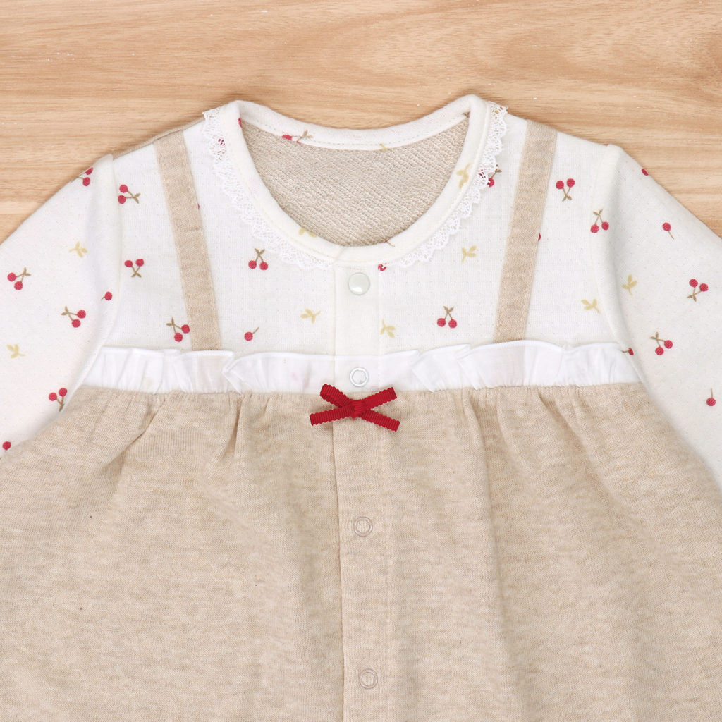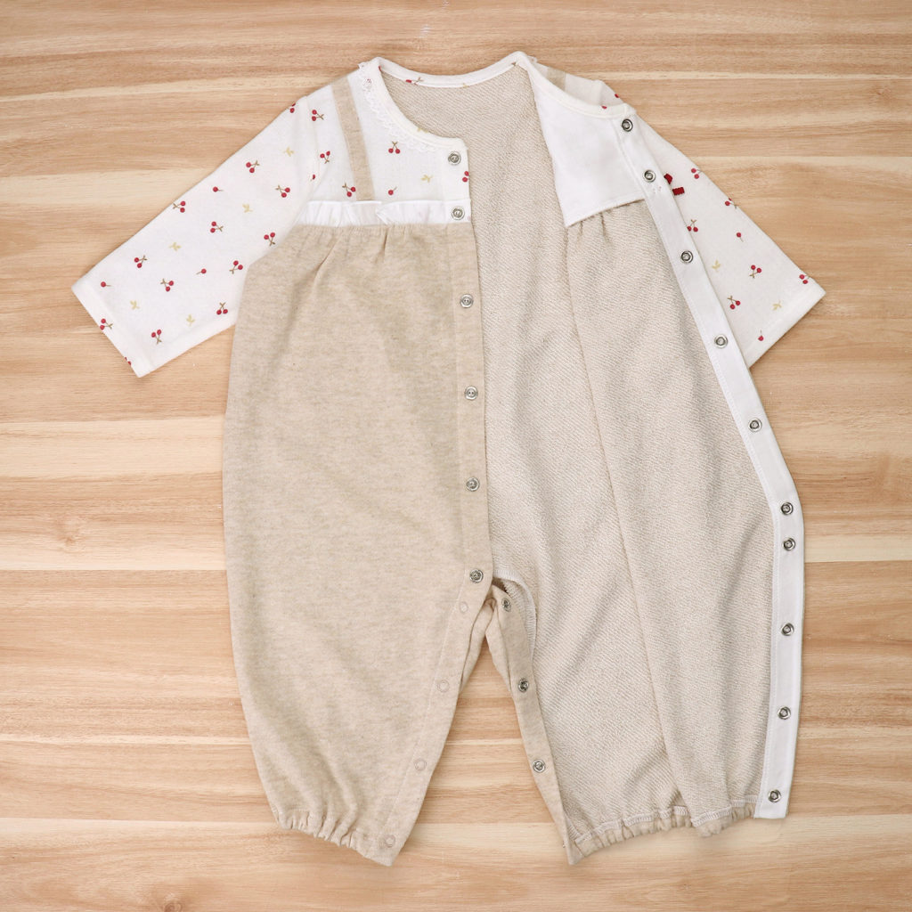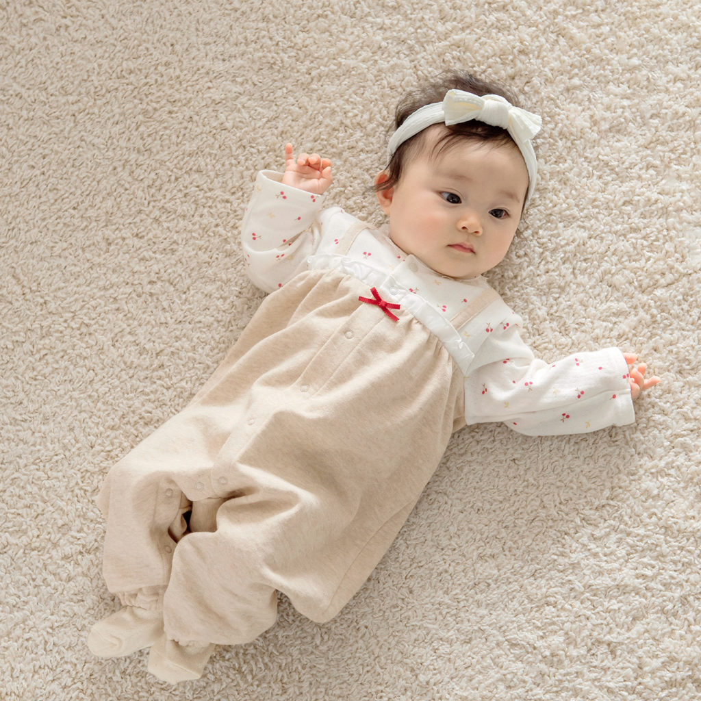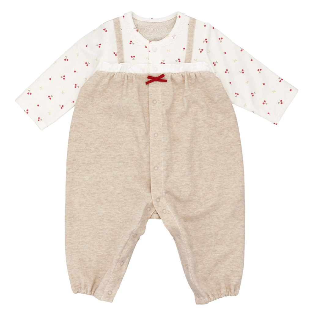 やわらかく保温性のある接結素材と裏毛で、秋から春先まで活躍します。 おなかが出ないカバーオールは元気いっぱいな赤ちゃんにぴったり。 デイリーウェアとして定番のアイテムです。