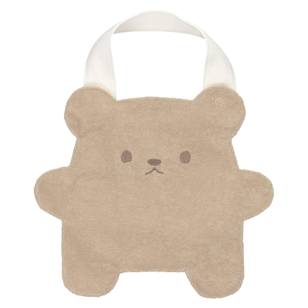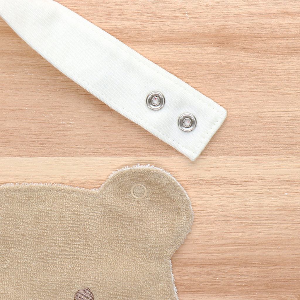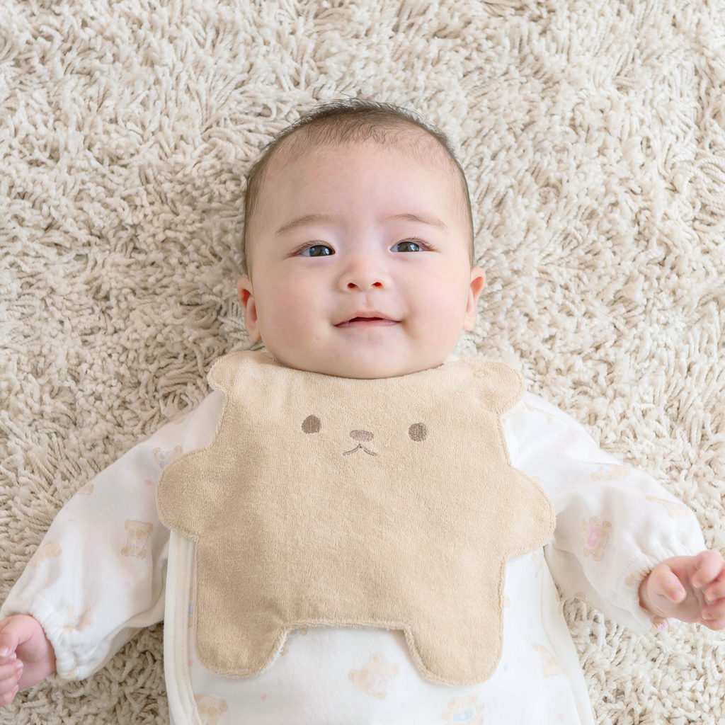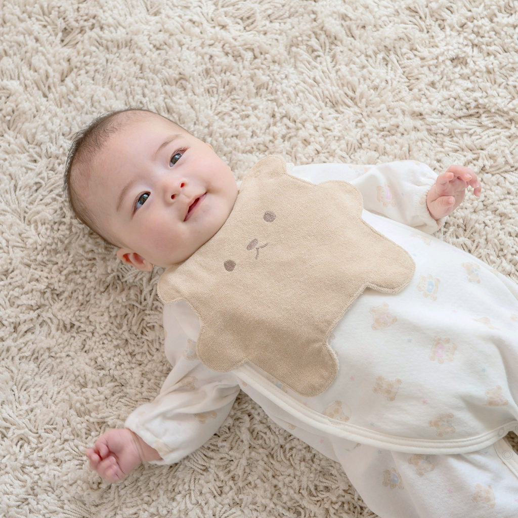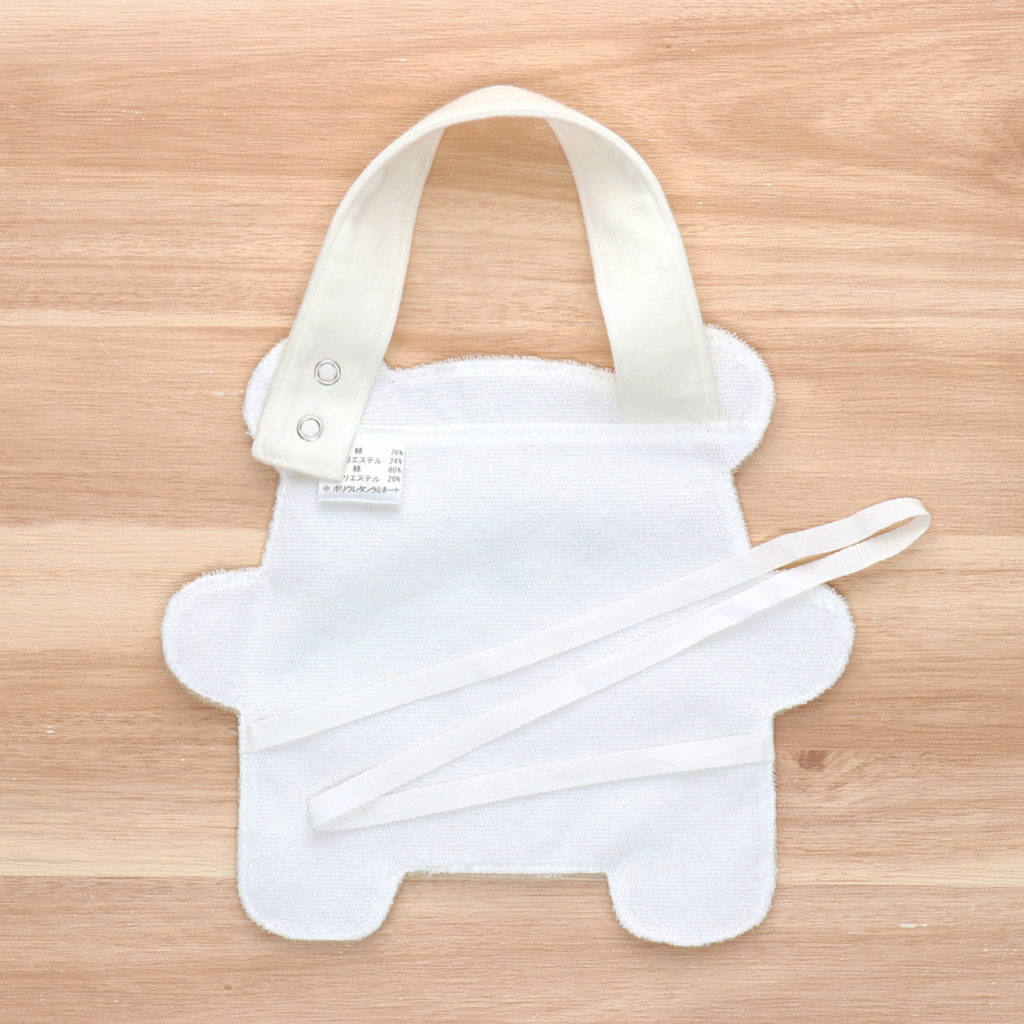 かわいいくまの形のスタイです。 裏面には防水パイルを使用しているので、機能性もばっちり! 何枚あっても便利なスタイは、出産準備の必需品。 プレゼントにも喜ばれる人気アイテムです。 スタイの裏側には、めくれて顔にかかる事を防止する紐が付いています。 中央で切るか、そのまま結んでお使いください。