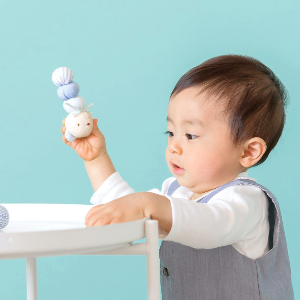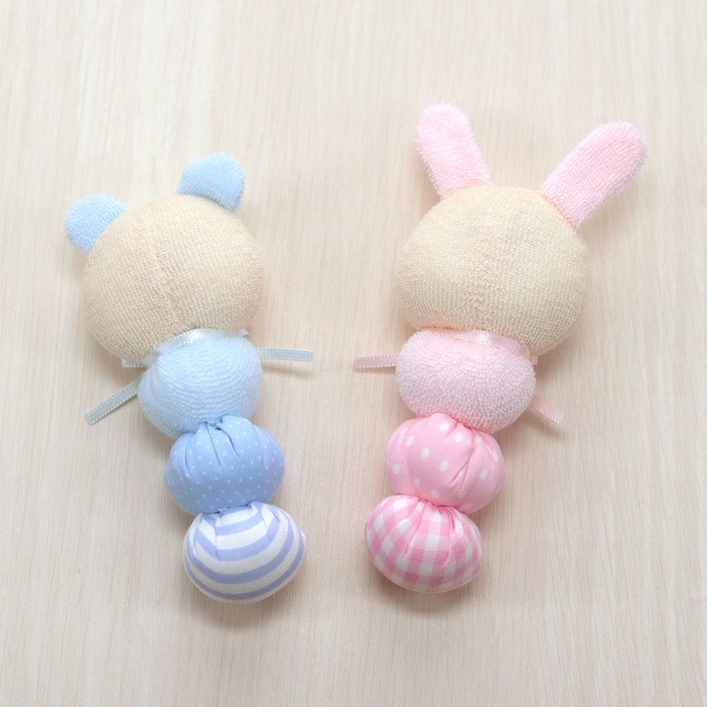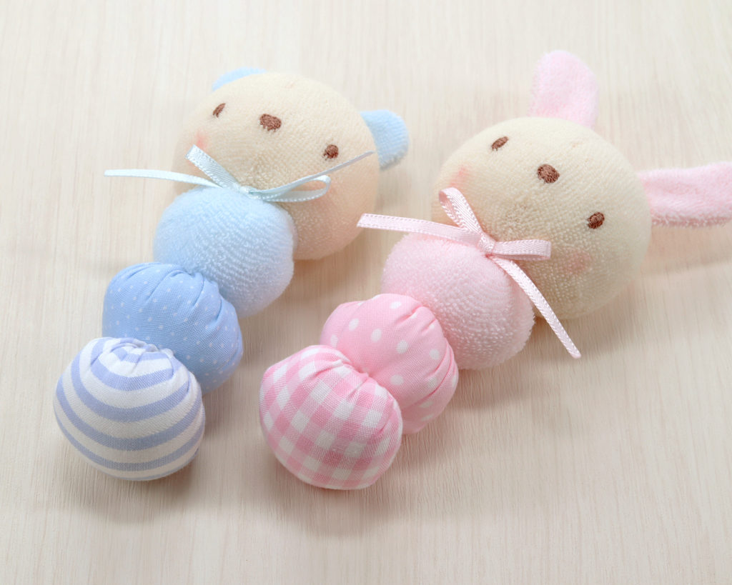 パステルカラーのかわいいおもちゃです。やさしい鈴の音とやわらかい触り心地で、赤ちゃんがなめても安全な布製です。お洗濯は軽く手洗いをして、よく乾燥をさせてください。