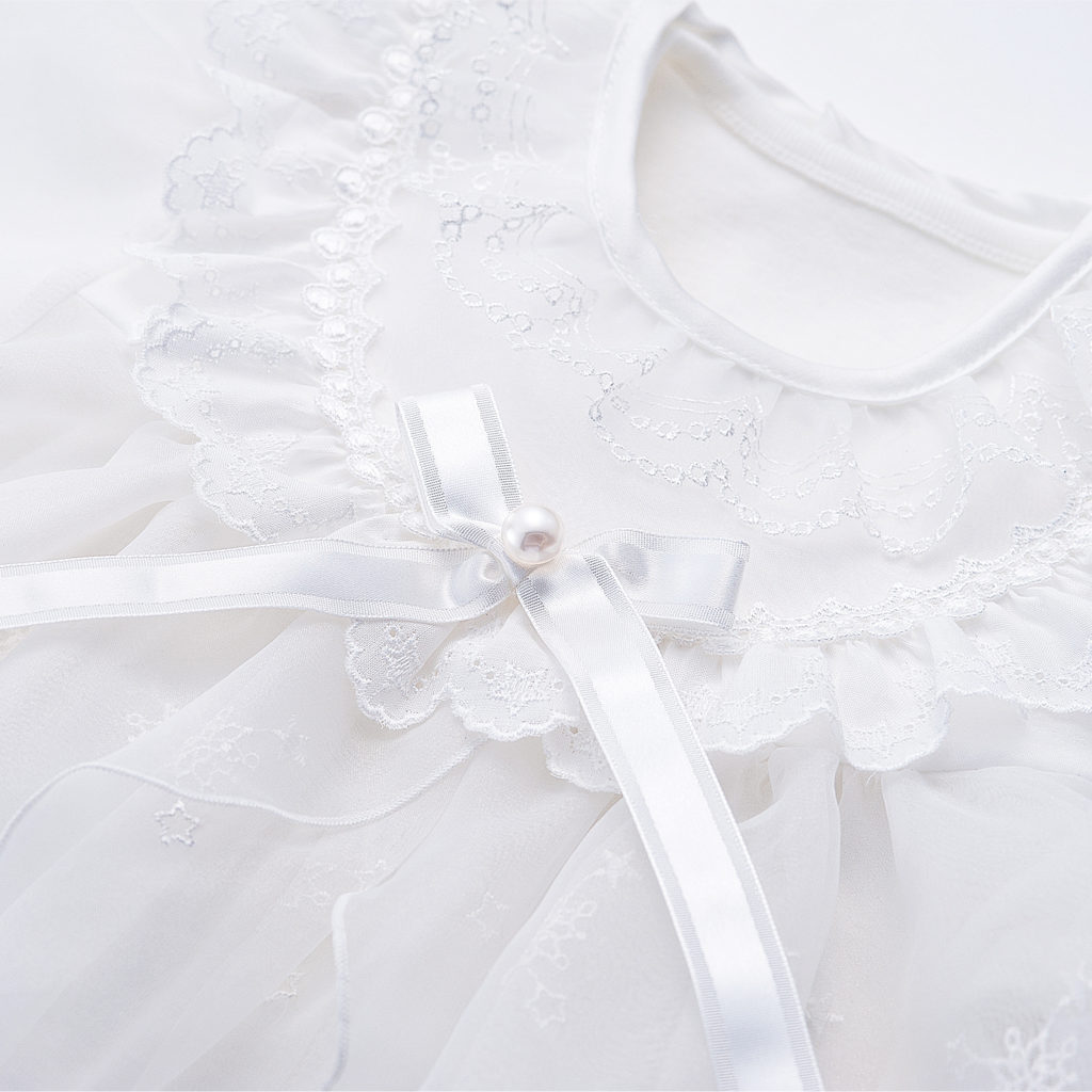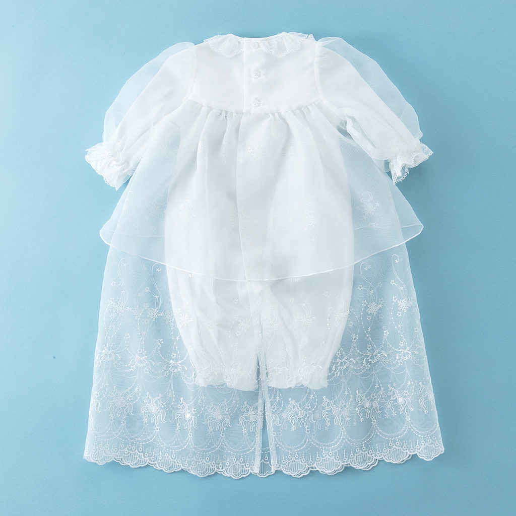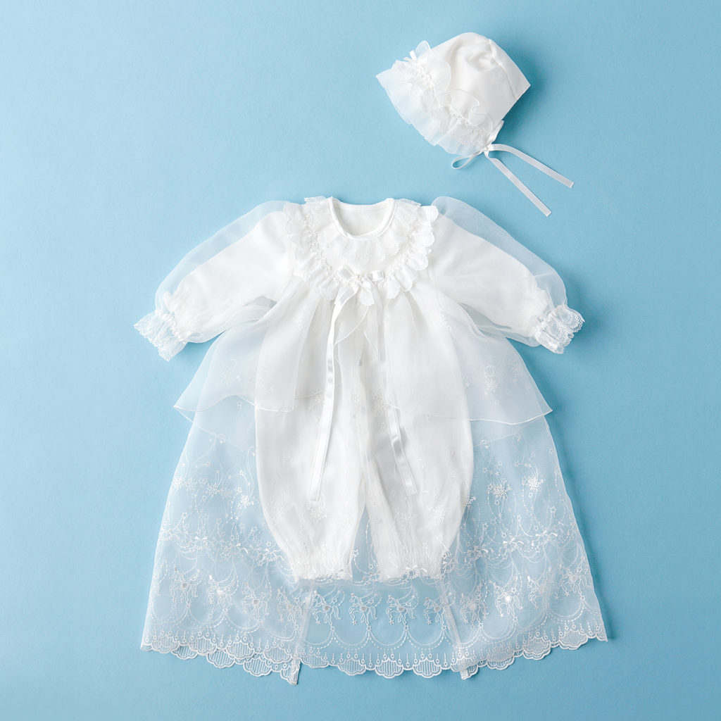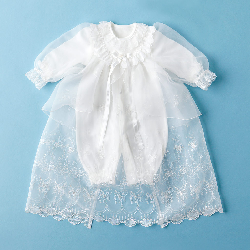 コートドレスにツーウェイドレス、更にフードまで揃った豪華な3点セット。やわらかな光沢と透け感が美しいオーガンジーに繊細な刺繍をほどこしました。たっぷりとあしらわれたレースが赤ちゃんのお顔まわりを華やかに演出します。 インナーのツーウェイドレスはフライス素材を使用しているので、年間を通してお使い頂けます。 お宮参りだけでなく、ご退院やお食い初めなど、赤ちゃんとご家族の大切な記念日を彩ります。