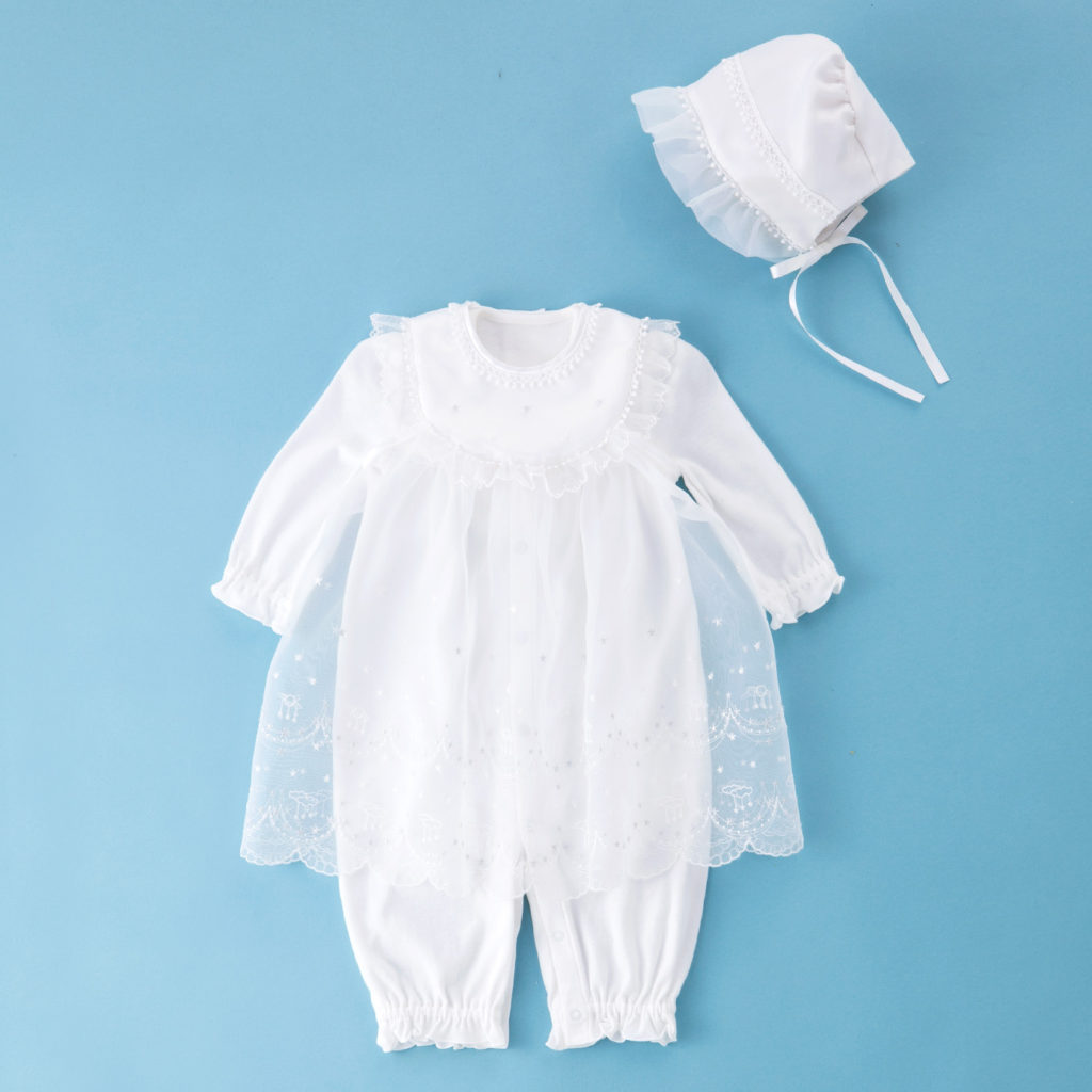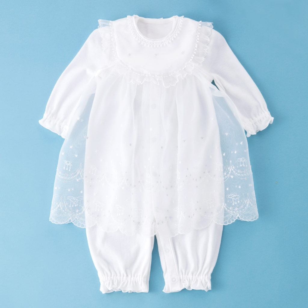 軽やかで可愛らしいショート丈のセレモニードレスです。 コートドレスにツーウェイドレス、更にフードまで揃った豪華な3点セット。 インナーのツーウェードレスはフライス素材を使用しているので、年間を通してお使い頂けます。 お宮参りだけでなく、ご退院やお食い初めなど、赤ちゃんとご家族の大切な記念日を彩ります。