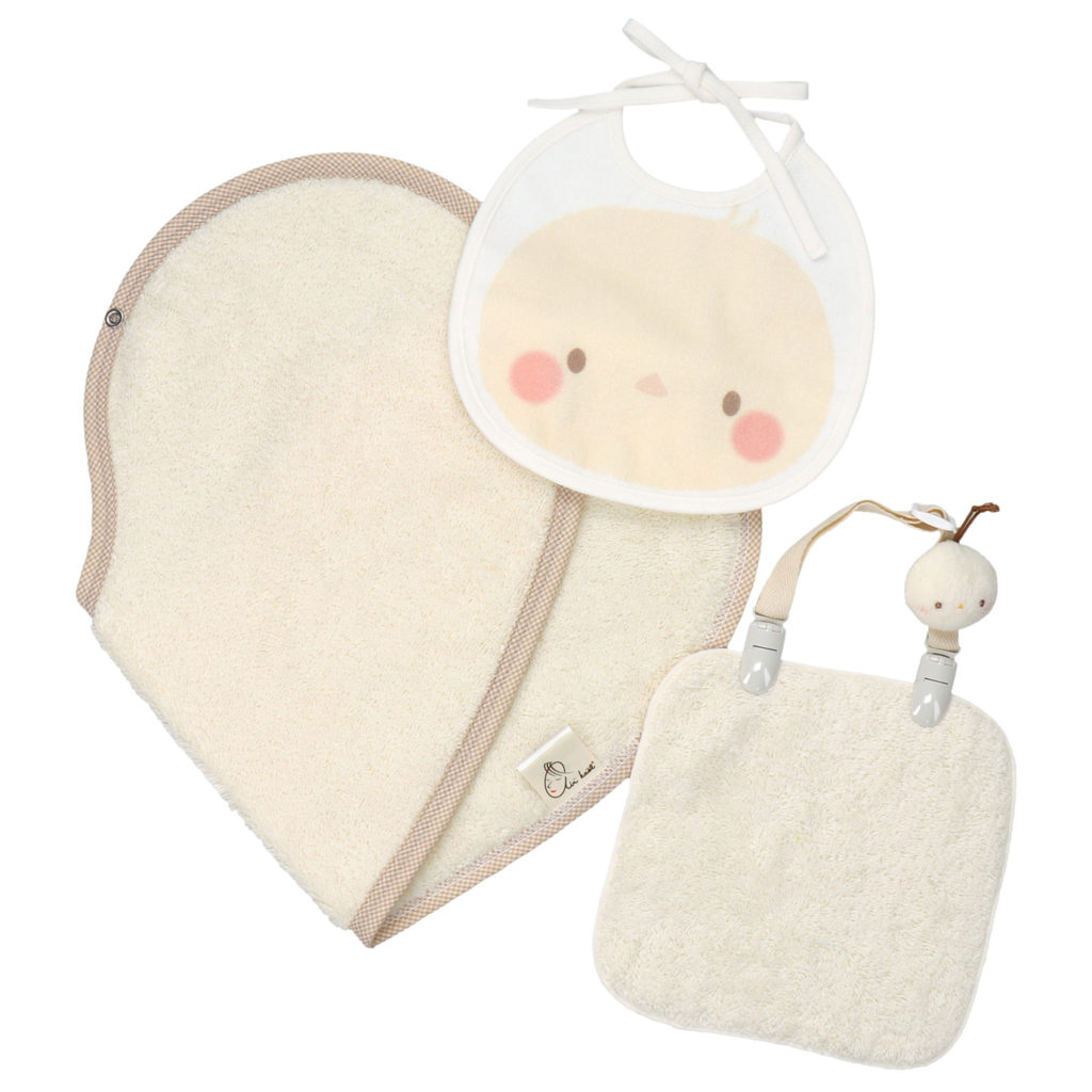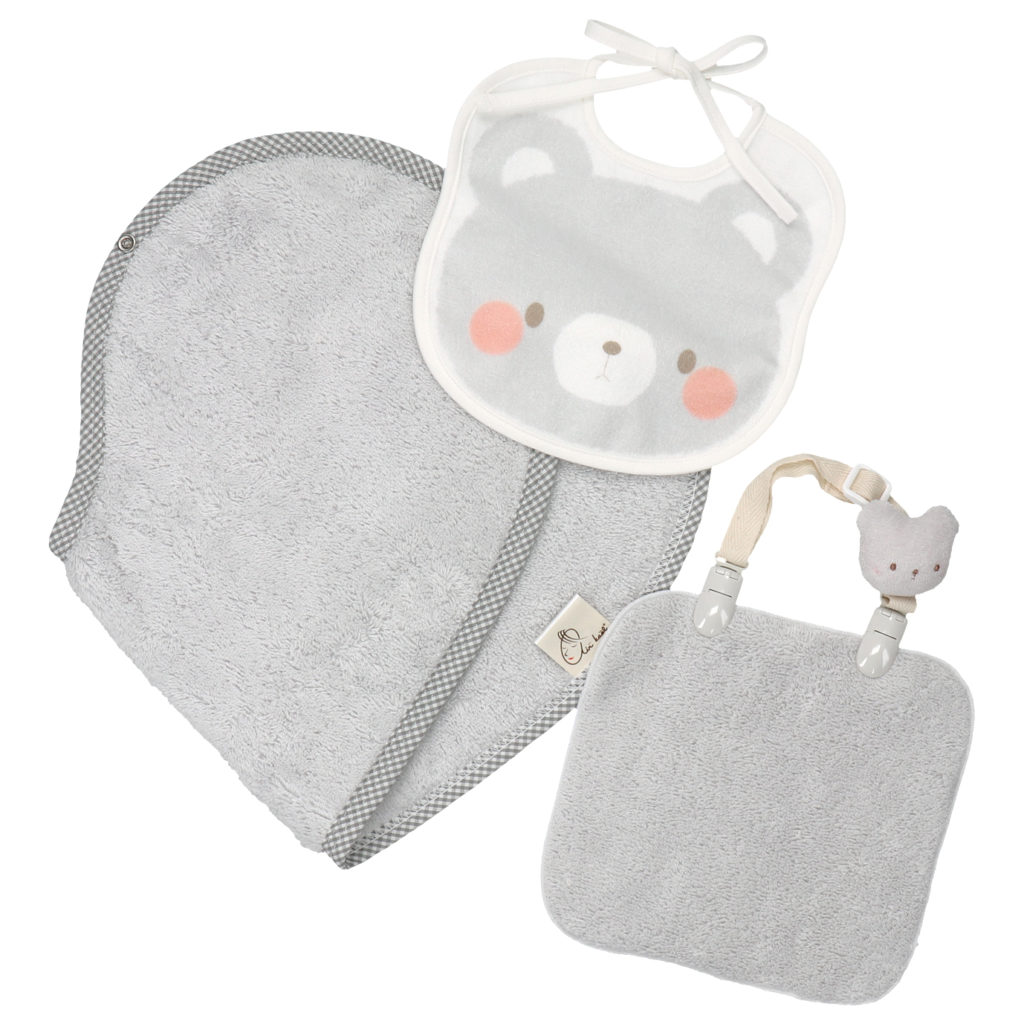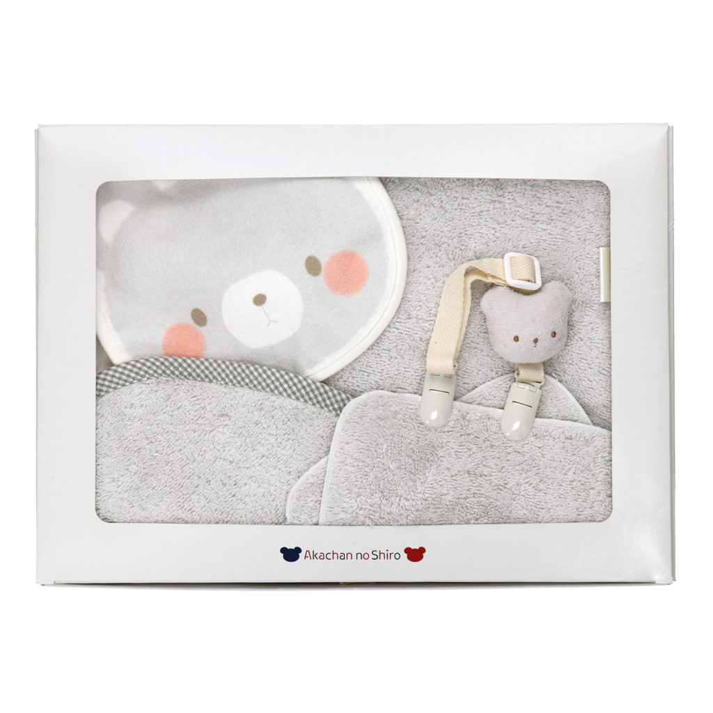 たっぷり空気を含んでやわらかな「エアーかおるタオル」素材を使用。実用的なバープクロスやスタイに、かわいいマスコットがついたクリップスタイが入っています。ベビーには珍しいくすみカラーを使用しており、やさしい使い心地で人気の高いセットです。