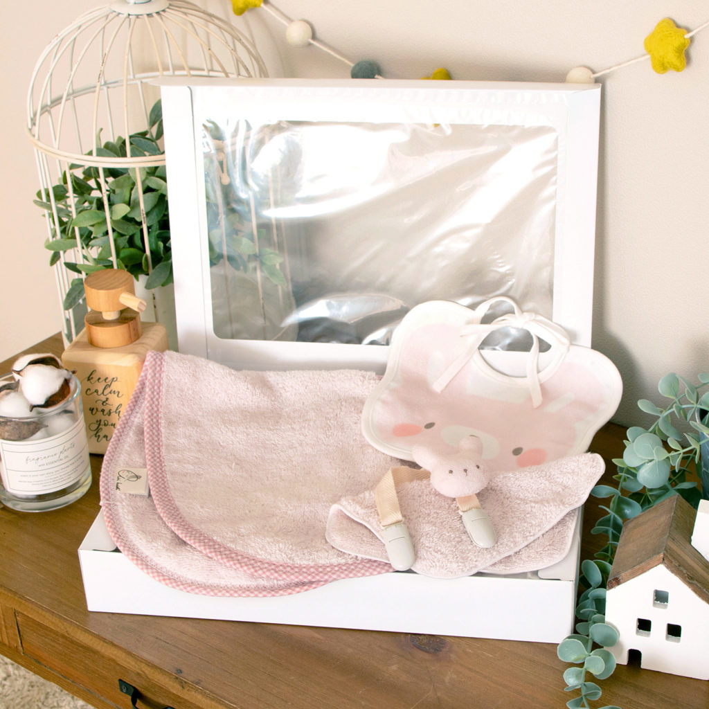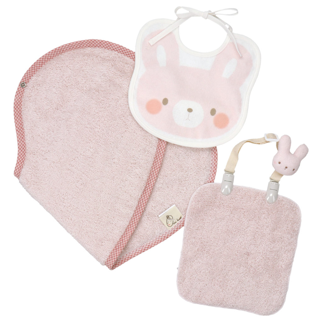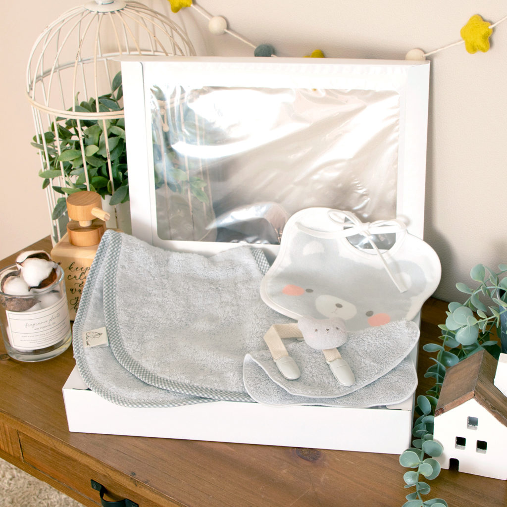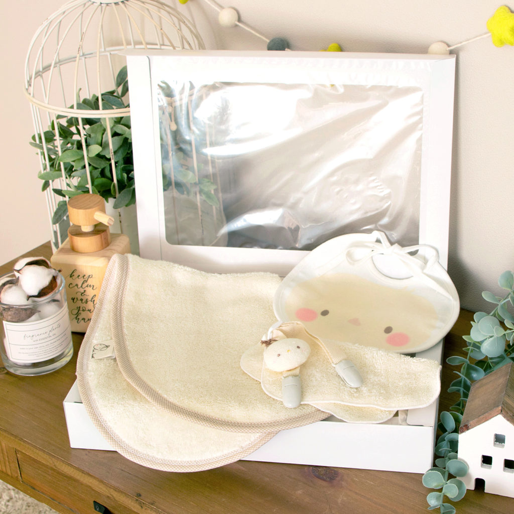たっぷり空気を含んでやわらかな「エアーかおるタオル」素材を使用。実用的なバープクロスやスタイに、かわいいマスコットがついたクリップスタイが入っています。ベビーには珍しいくすみカラーを使用しており、やさしい使い心地で人気の高いセットです。
