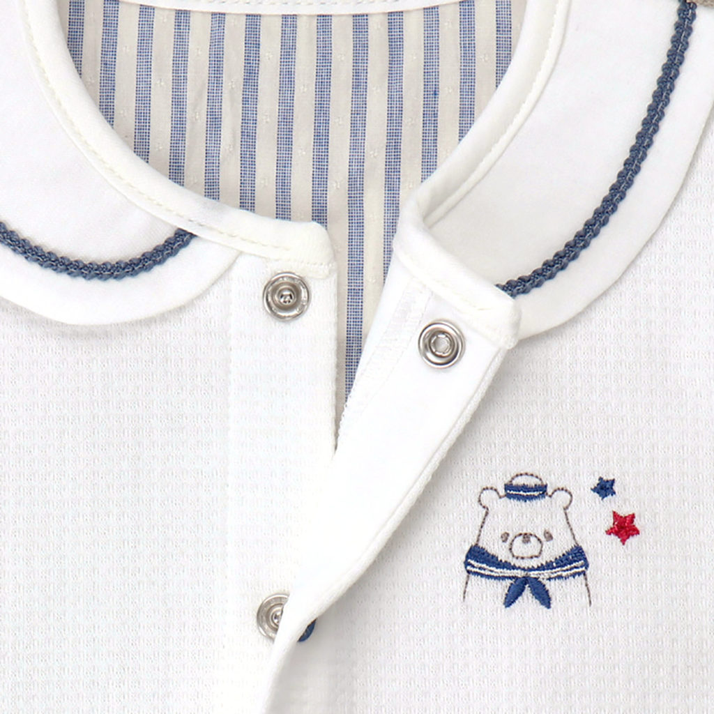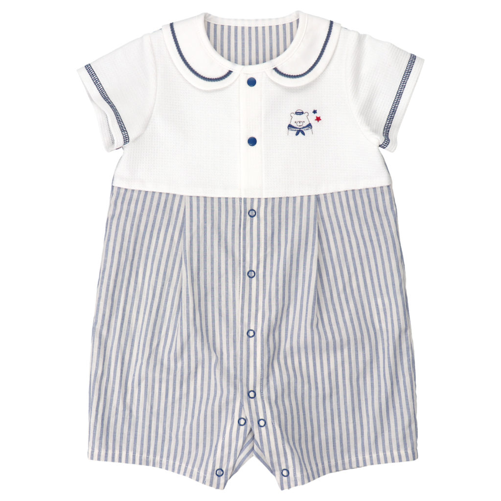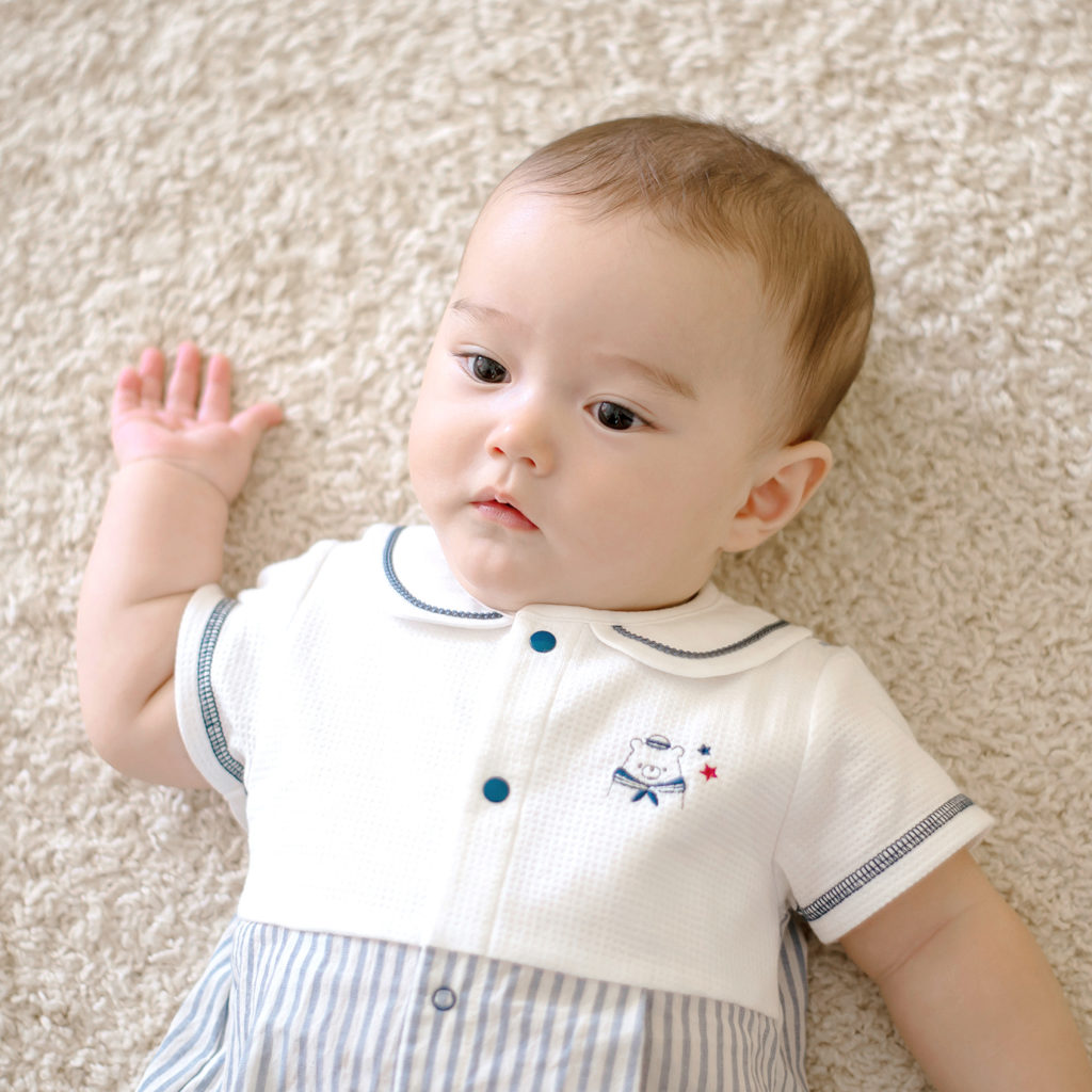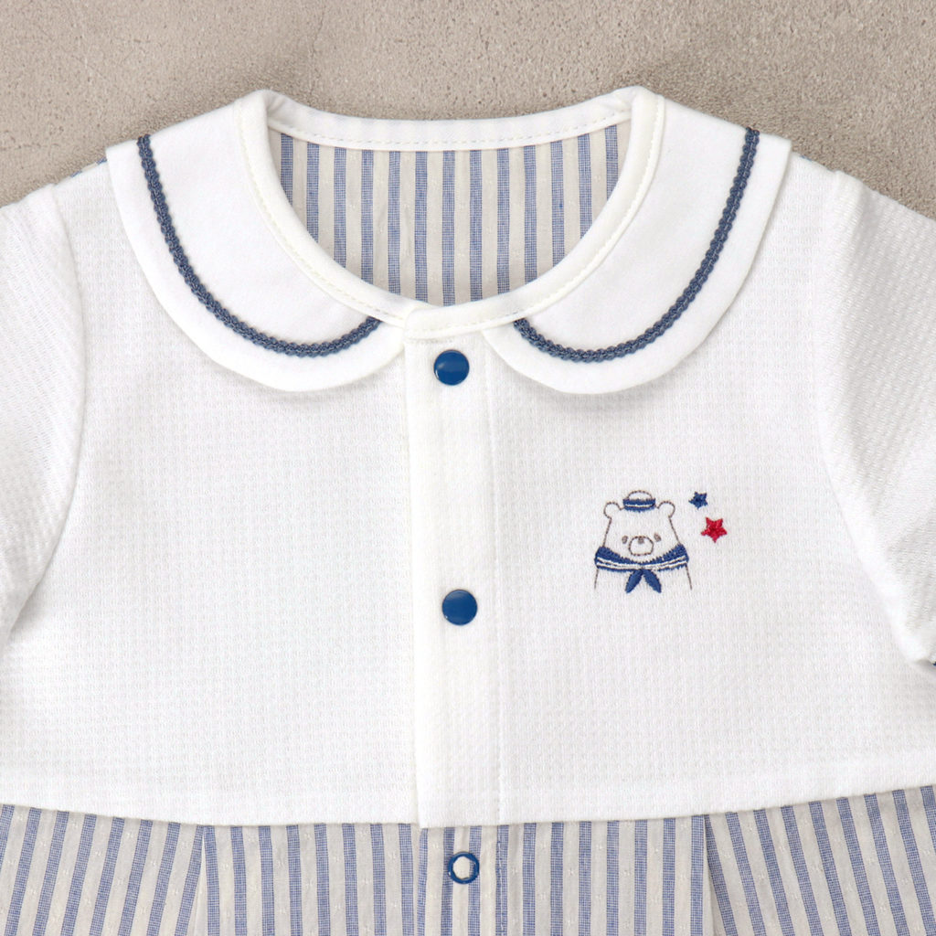 くまの刺繍が可愛いマリンデザインは夏にぴったり! 軽くて薄い編地でさらっとした肌触りが気持ちいい天竺素材に薄手のローン生地は暑い季節ににおすすめです。 おなかが出ないロンパースは元気いっぱいな赤ちゃんにおすすめです。