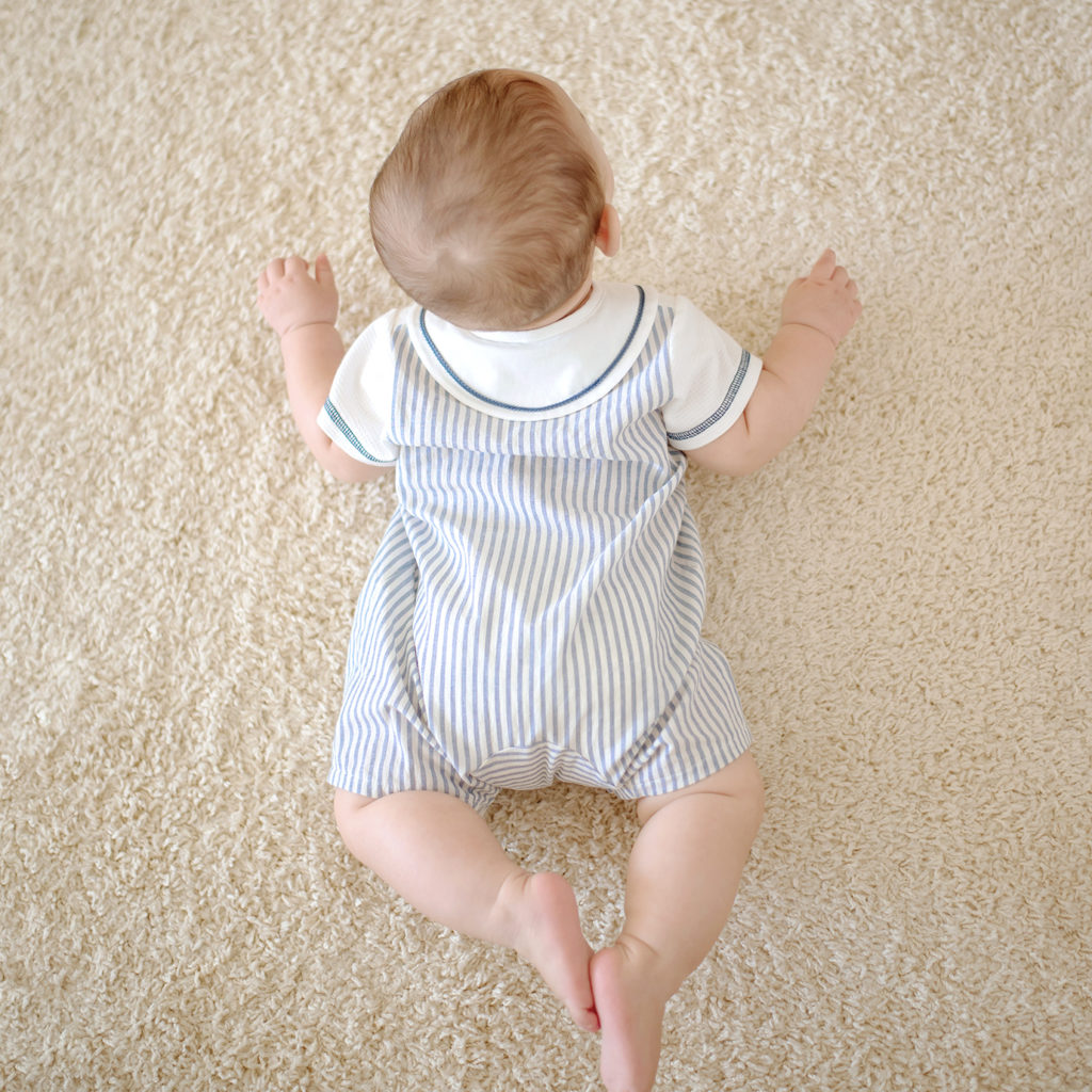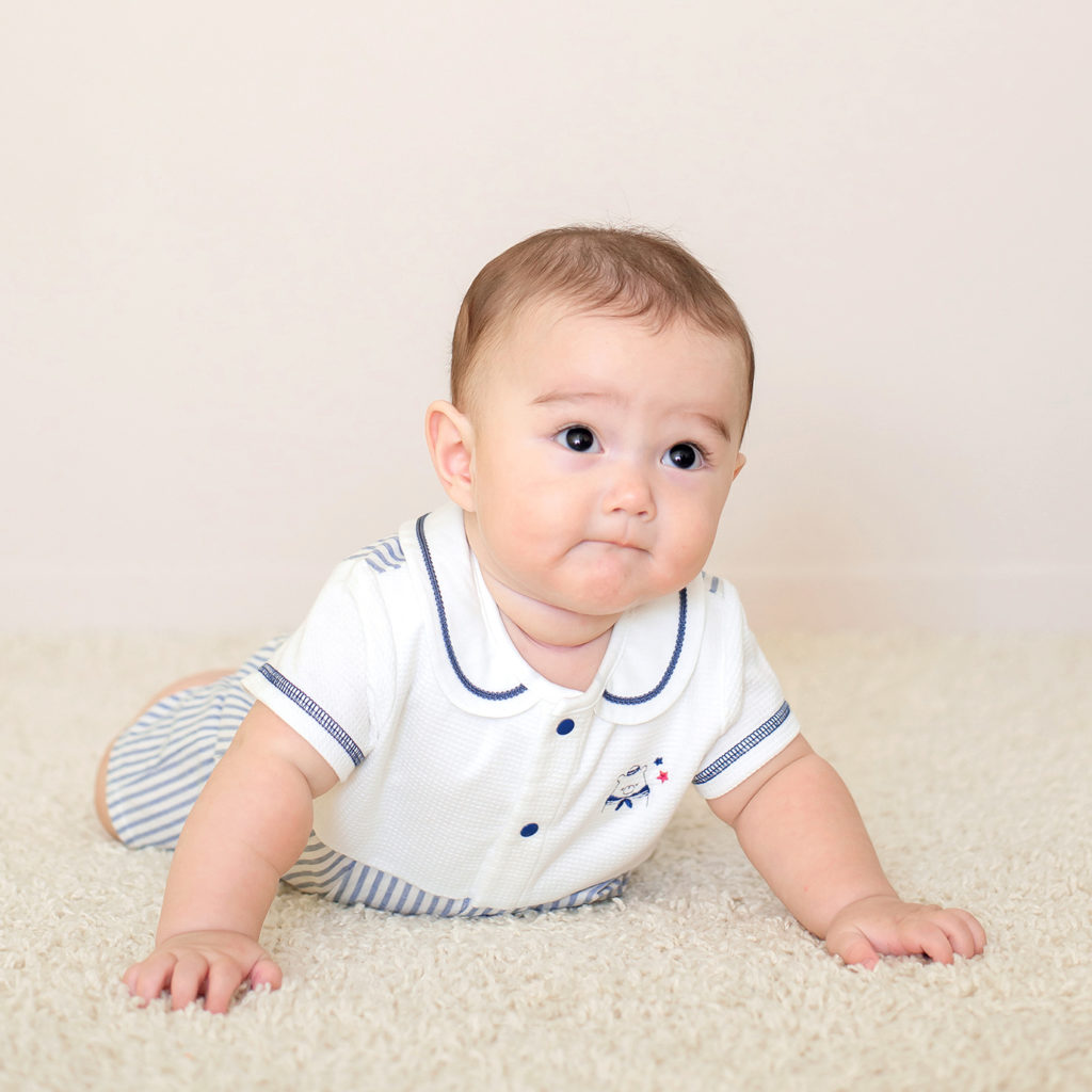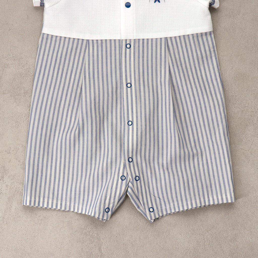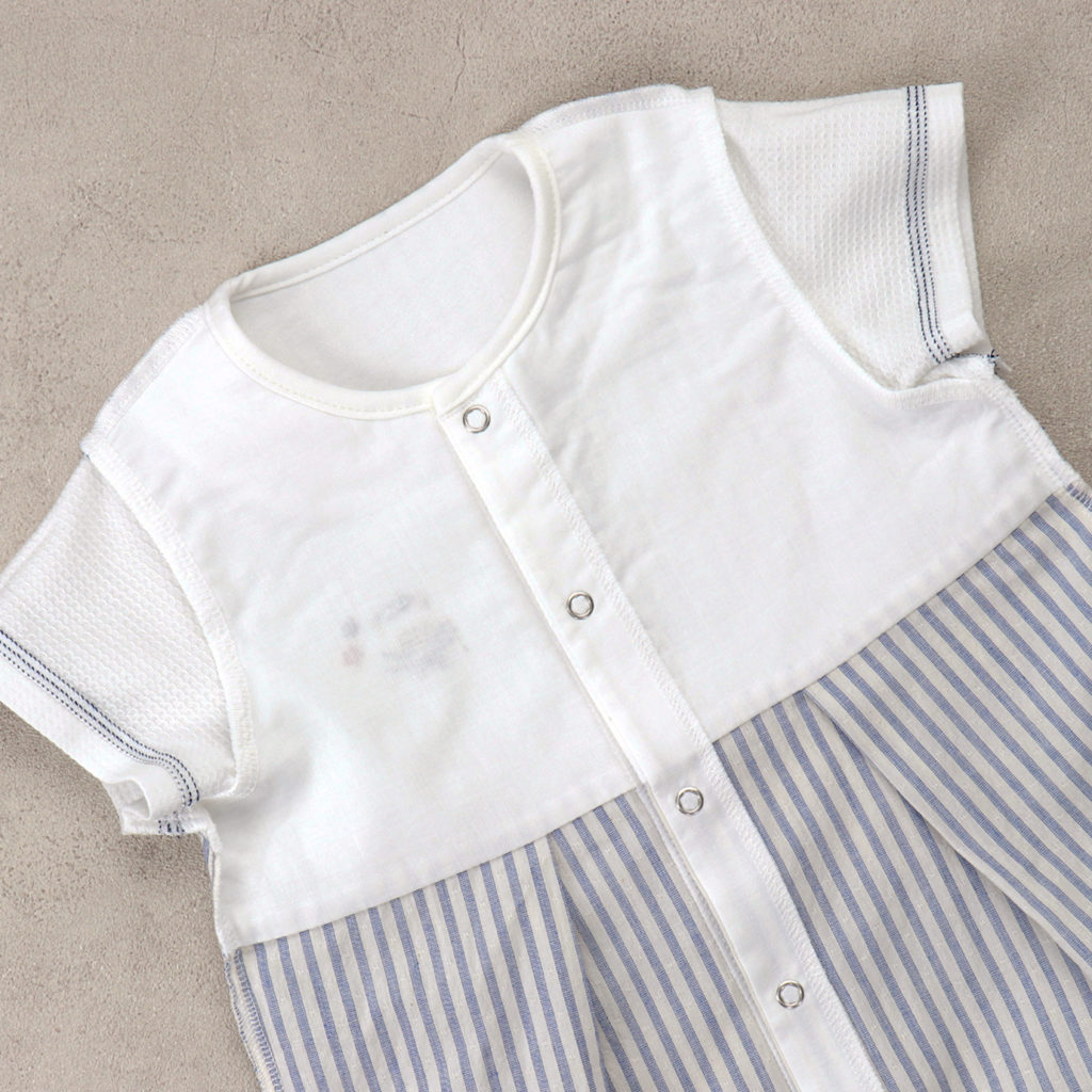 くまの刺繍が可愛いマリンデザインは夏にぴったり! 軽くて薄い編地でさらっとした肌触りが気持ちいい天竺素材に薄手のローン生地は暑い季節ににおすすめです。 おなかが出ないロンパースは元気いっぱいな赤ちゃんにおすすめです。