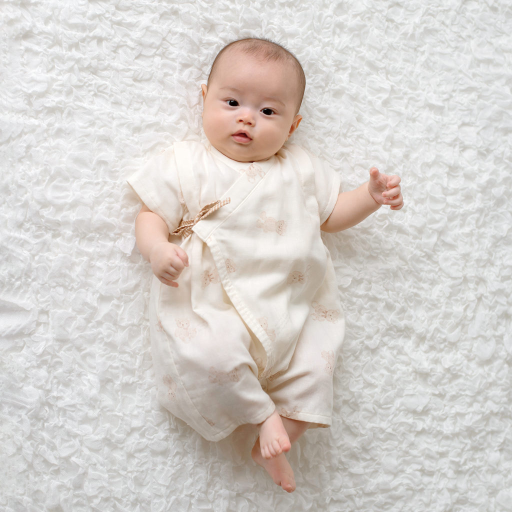 肌ざわりのよい二重ガーゼを使用したロンパースタイプの甚平です。寝かせたままでもお着替えラクチンな前開きタイプ。おなかが出ないので、ルームウェアやナイトウェアにしても体が冷える心配がありません。お好きなデザインの1枚が赤ちゃんの夏を彩ります。普段使いはもちろんお出かけにも。夏に大活躍のアイテムです。