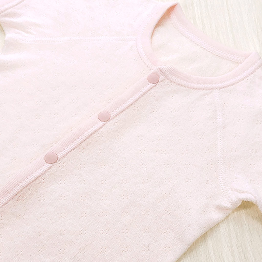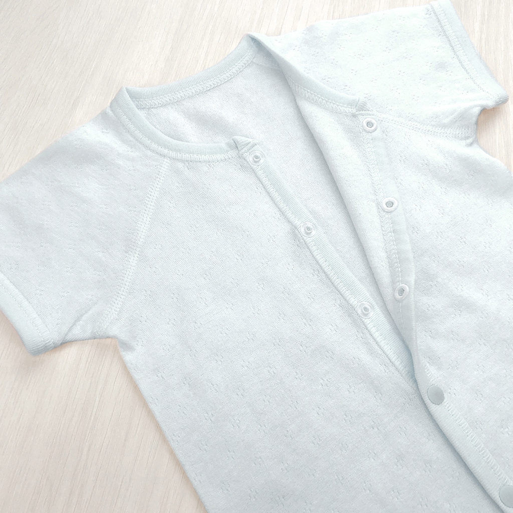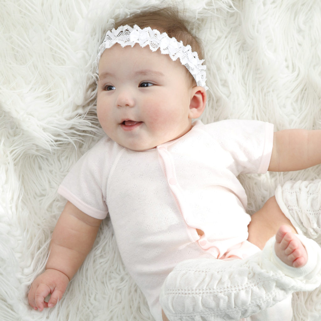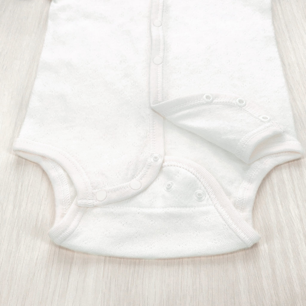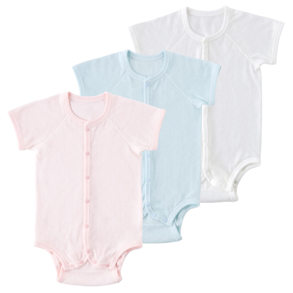 お腹が出ないロンパース型の肌着です。前ボタンタイプで、股下まで全開できるのでお着替えやオムツ替えも簡単です。 洗っても硬くならず、軽くてふわふわのやわらかさを追求したスマイルコットンを使用。肌への刺激が少なく、赤ちゃんのデリケートな肌にもやさしい素材です。 肌着としてはもちろん、お部屋着としても大活躍の人気アイテムです。