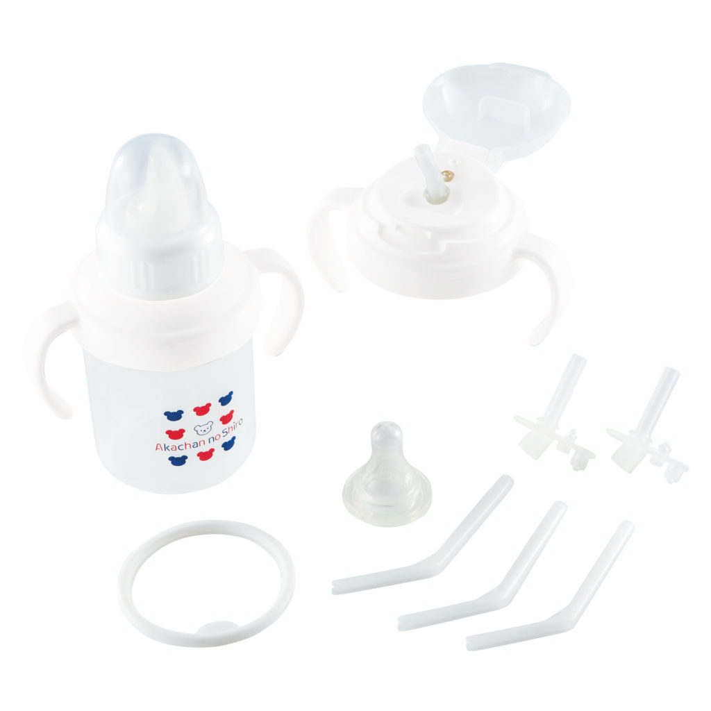 素材 カバー(ポリプロピレン)・キャップ(ポリプロピレン)・フタ(ポリプロピレン)・ストローフード(ポリプロピレン)・本体(ポリプロピレン)・乳首(シリコンゴム)・パッキン(シリコンゴム)・スパウト(シリコンゴム)・ストロー(シリコンゴム)・チューブ(シリコンゴム)