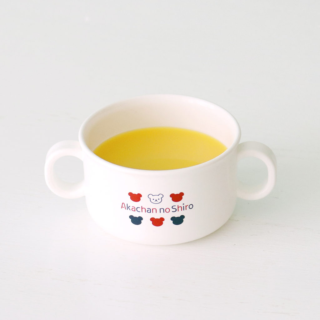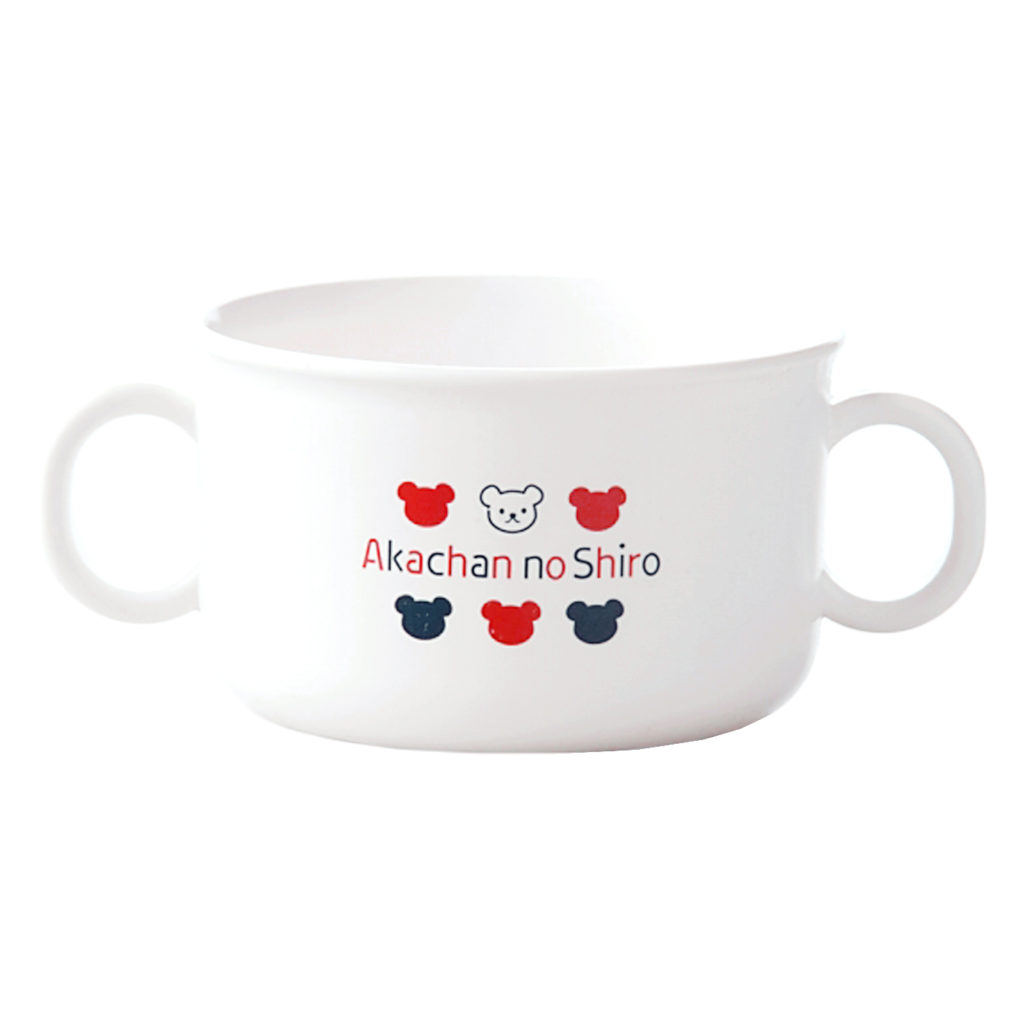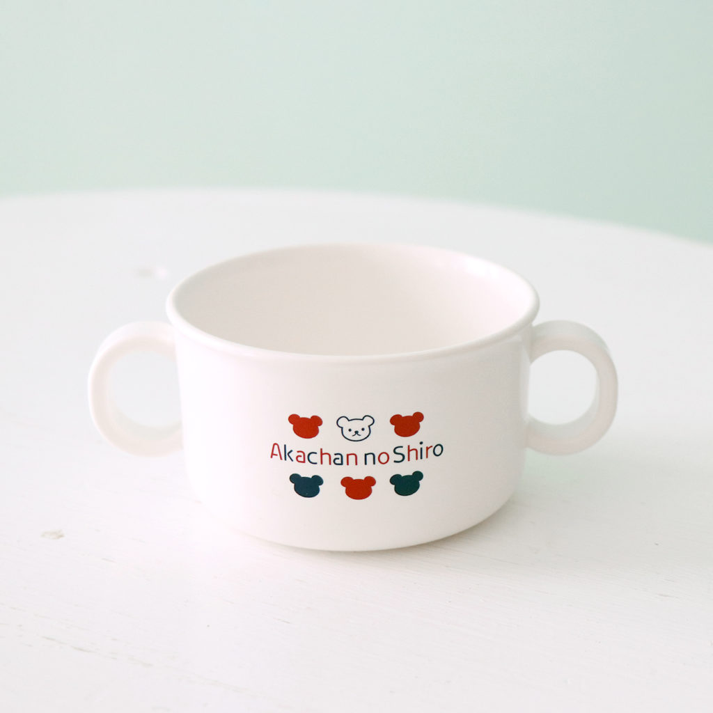 赤ちゃんの手にフィットする取っ手の付いた、持ちやすい両手付きのコップです。 電子レンジにも使えます。シンプルな白い食器にくまさん柄が可愛い、男女問わず人気のデザインです。