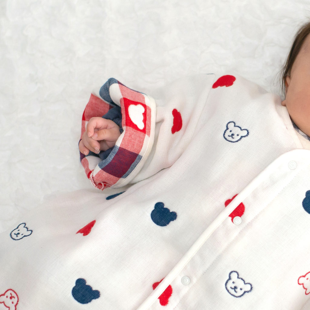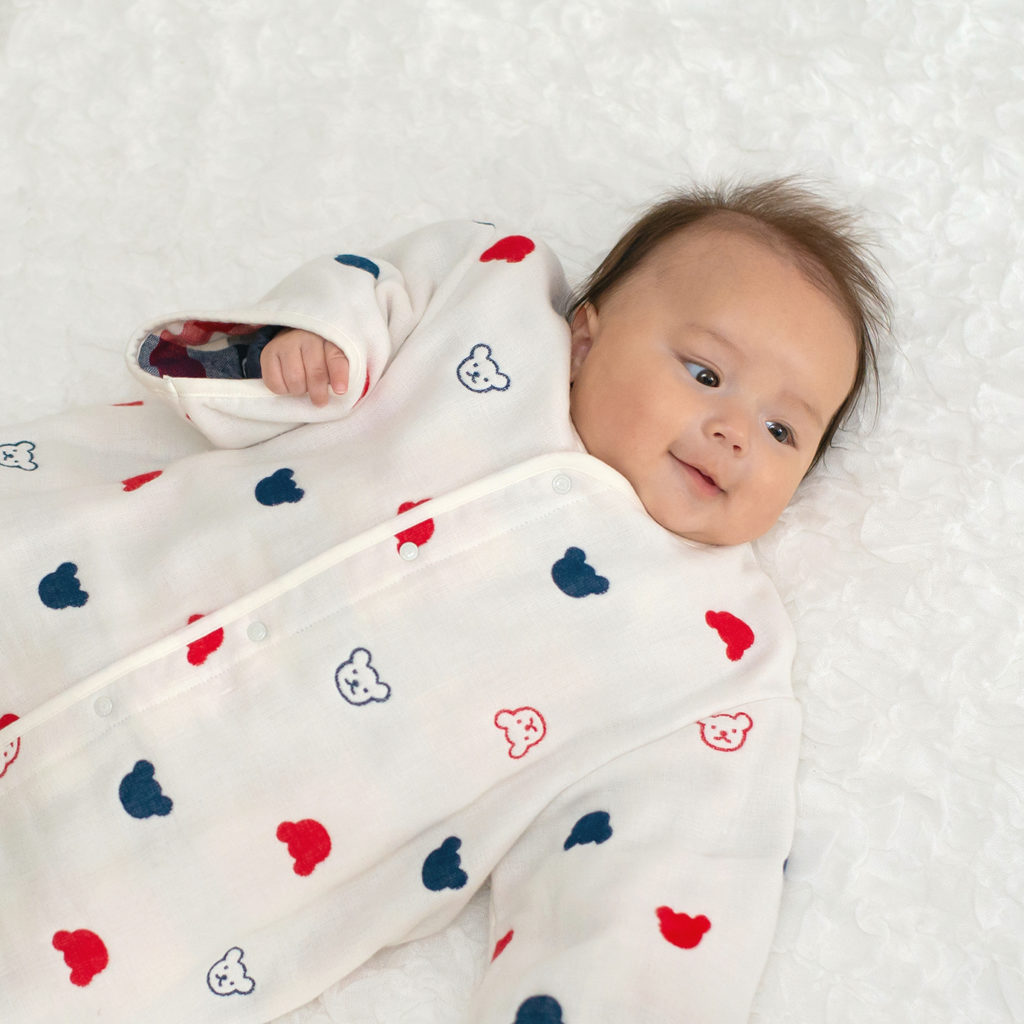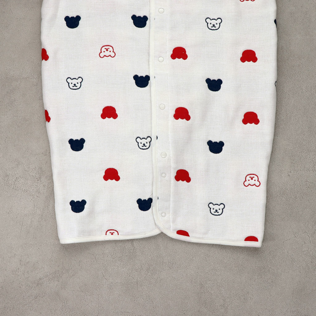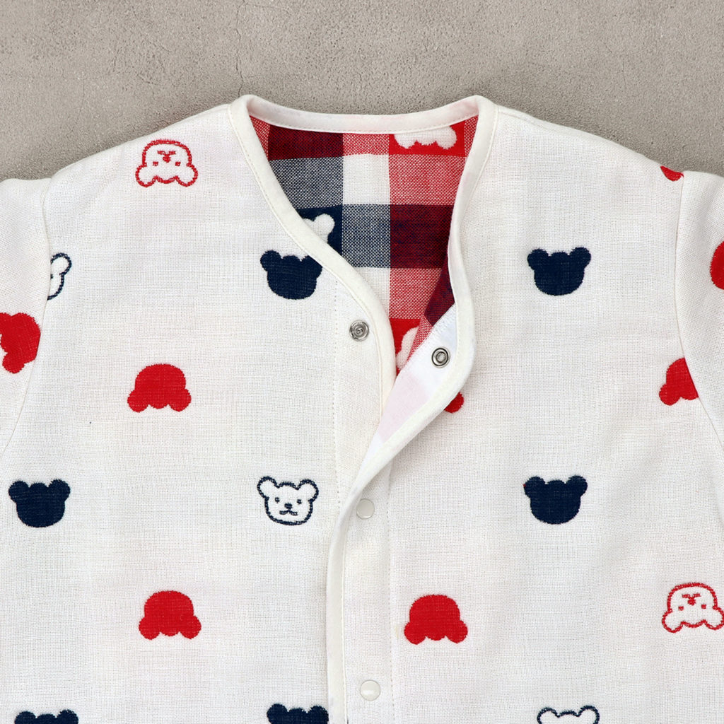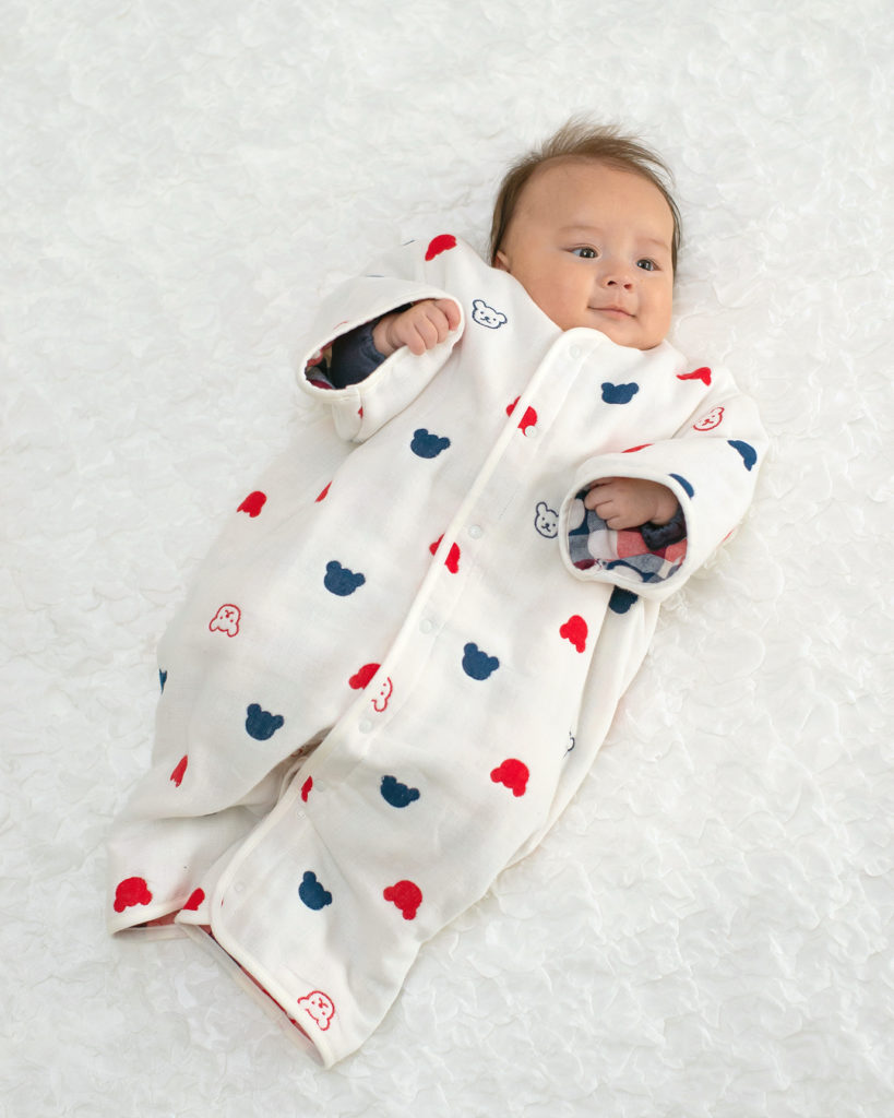 トリコロールカラーのくまが可愛い、男の子にも女の子にも人気のデザインです。 六重に重ねたガーゼが空気をたくさん含み、冬はふんわり暖かく、夏のクーラー対策にもおすすめです。 通気性・速乾性が高く、洗濯を重ねるたびにやわらかく優しい肌触りで一年中お使いいただけます。 おなかが出ない長めの丈で、寝冷え対策に最適。 股下のボタンを留めかえることで2通りの使い方が出来て便利です。