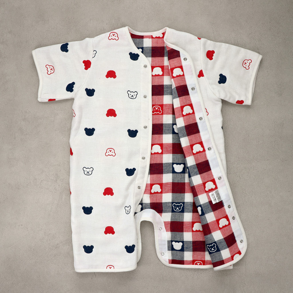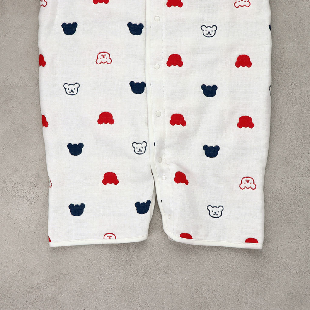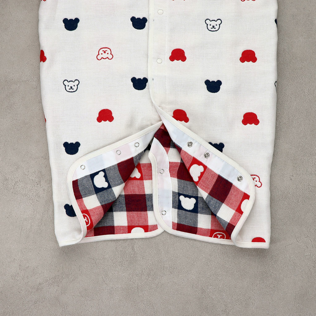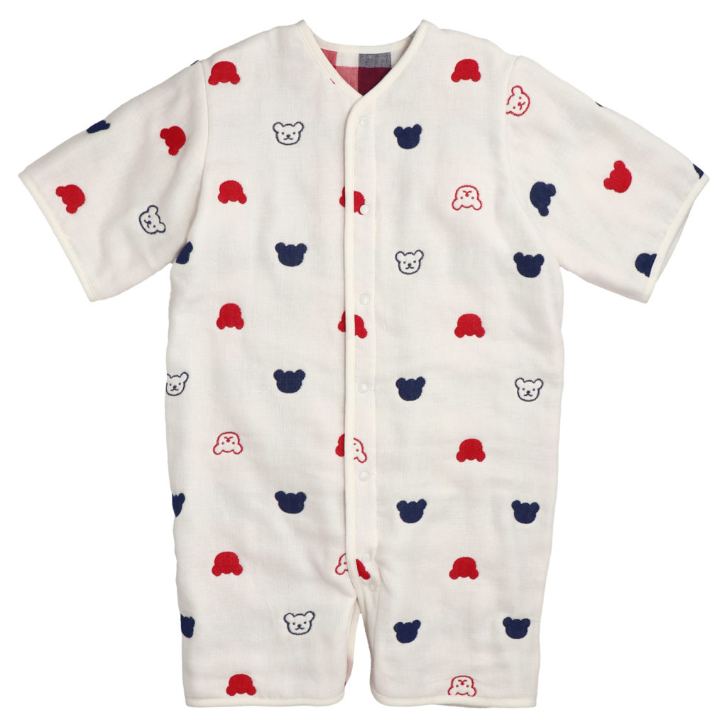 トリコロールカラーのくまが可愛い、男の子にも女の子にも人気のデザインです。 六重に重ねたガーゼが空気をたくさん含み、冬はふんわり暖かく、夏のクーラー対策にもおすすめです。 通気性・速乾性が高く、洗濯を重ねるたびにやわらかく優しい肌触りで一年中お使いいただけます。 おなかが出ない長めの丈で、寝冷え対策に最適。 股下のボタンを留めかえることで2通りの使い方が出来て便利です。