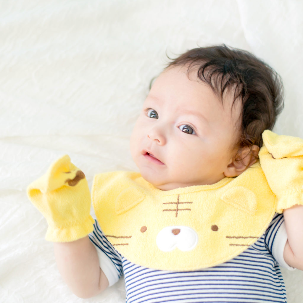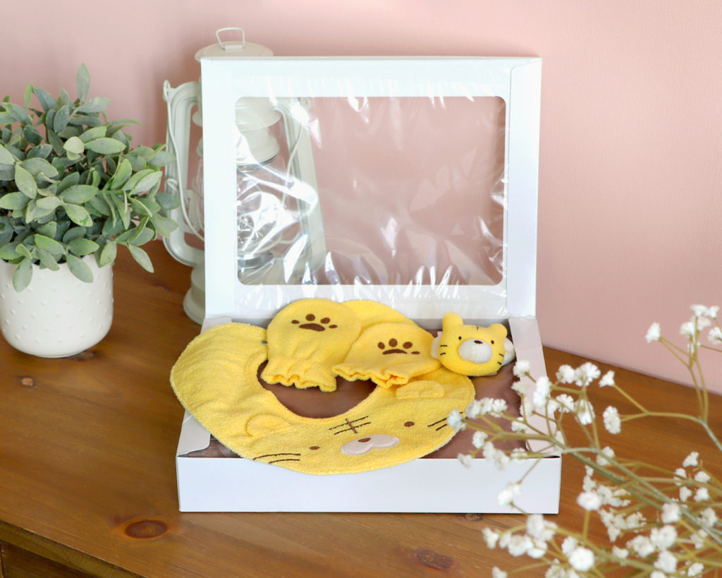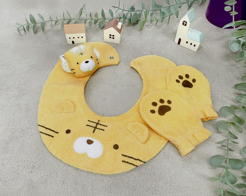 可愛いトラがモチーフのスタイ、ミトン、ガラガラの3点セットです。スタイはいくつあってもうれしいアイテム。